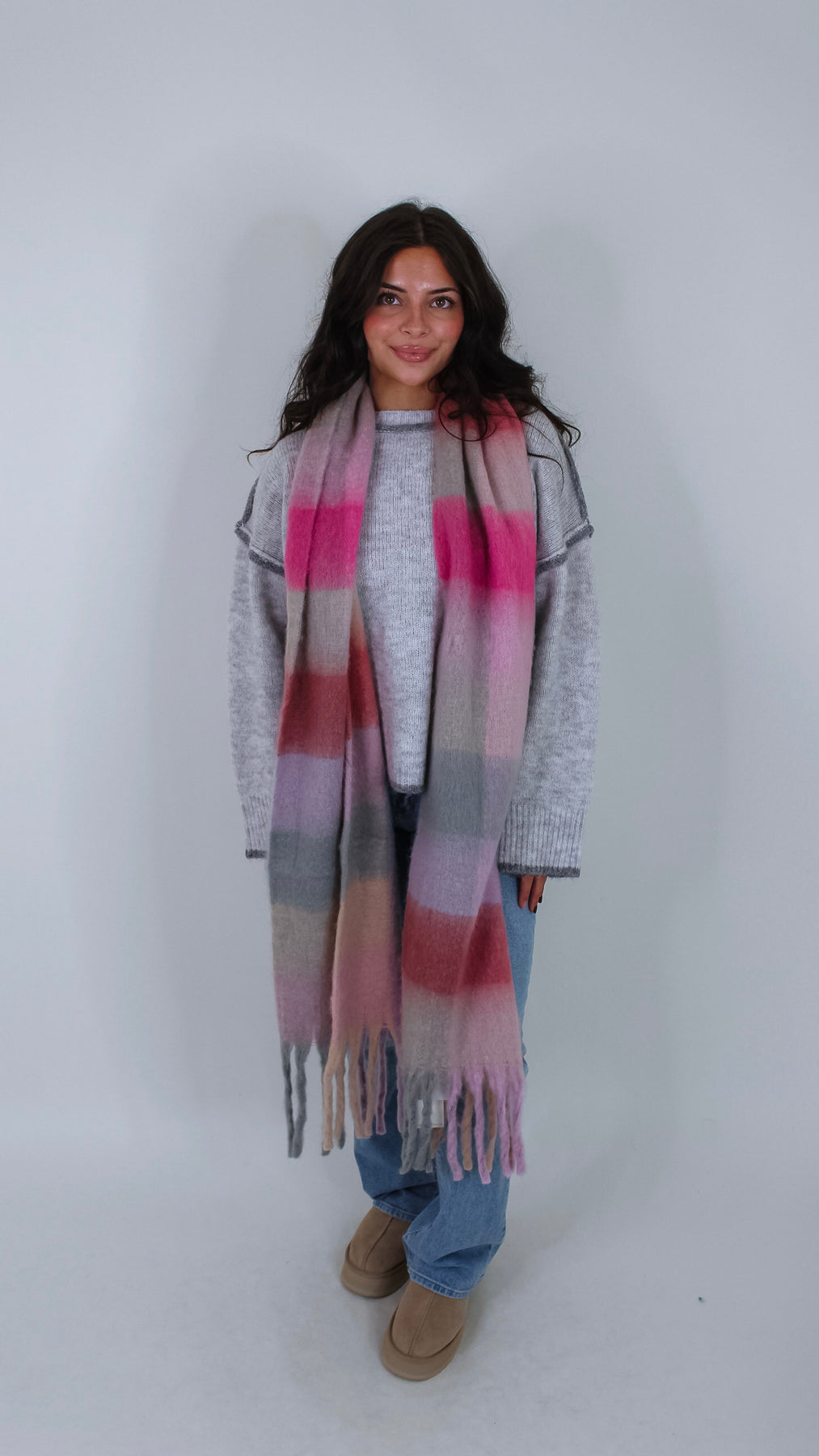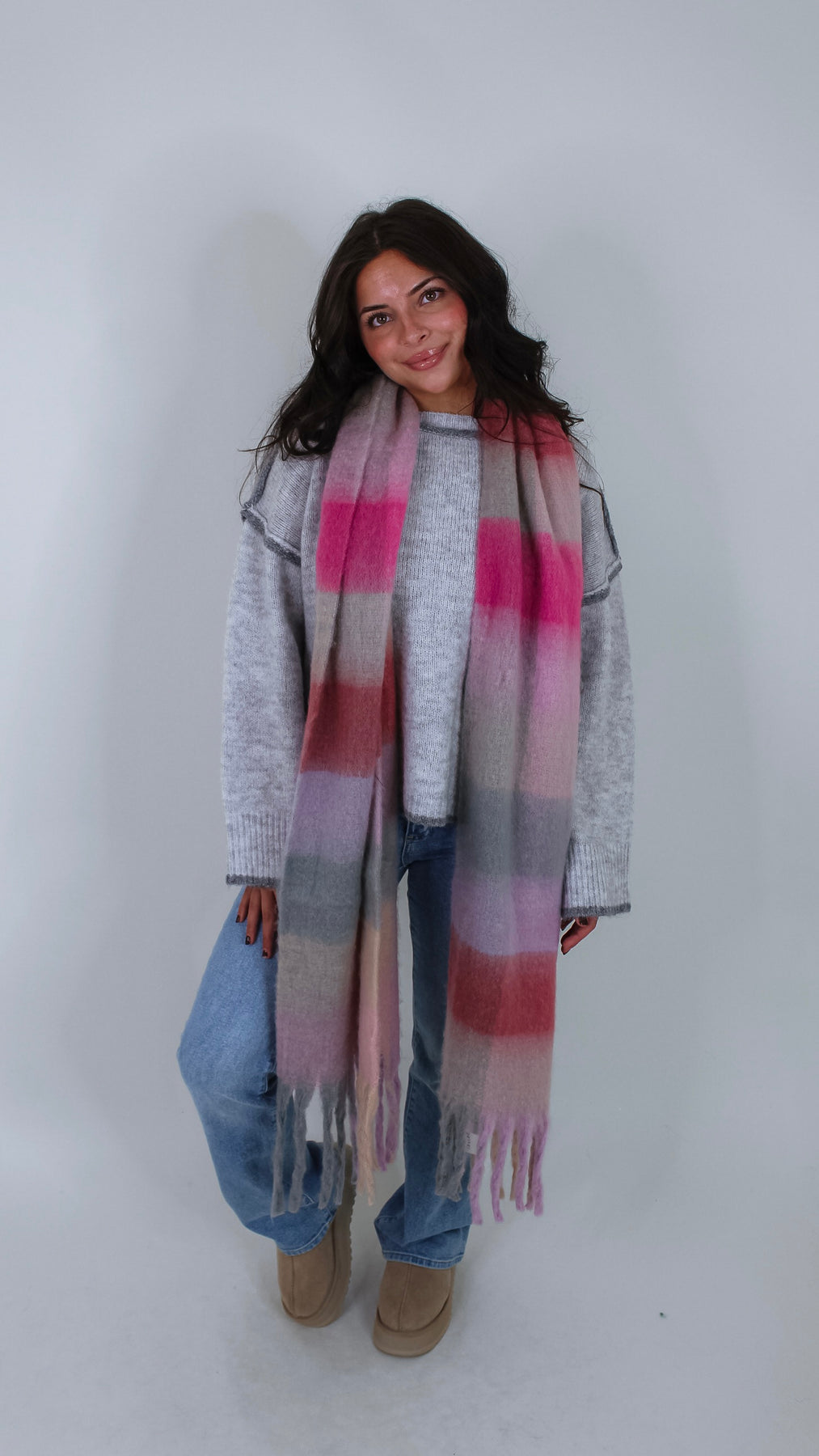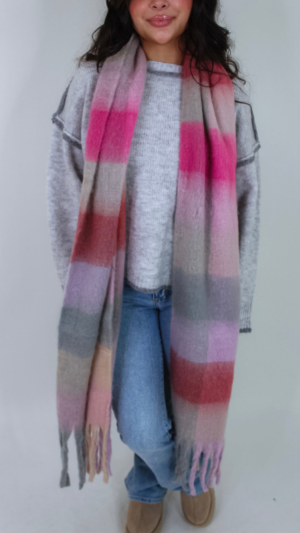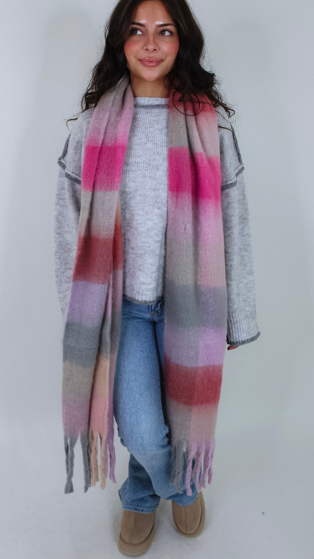 Wrap up in fun and fresh style with the Harley Pink Gingham Scarf. Its charming pink and lavender gingham pattern adds a playful pop to any outfit, perfect for brightening your day.