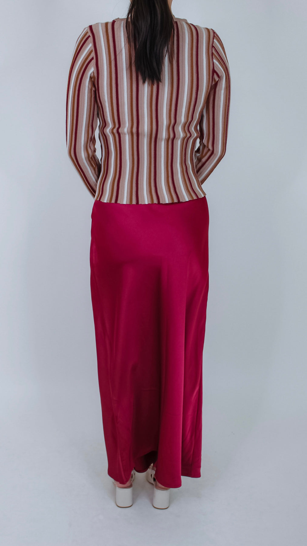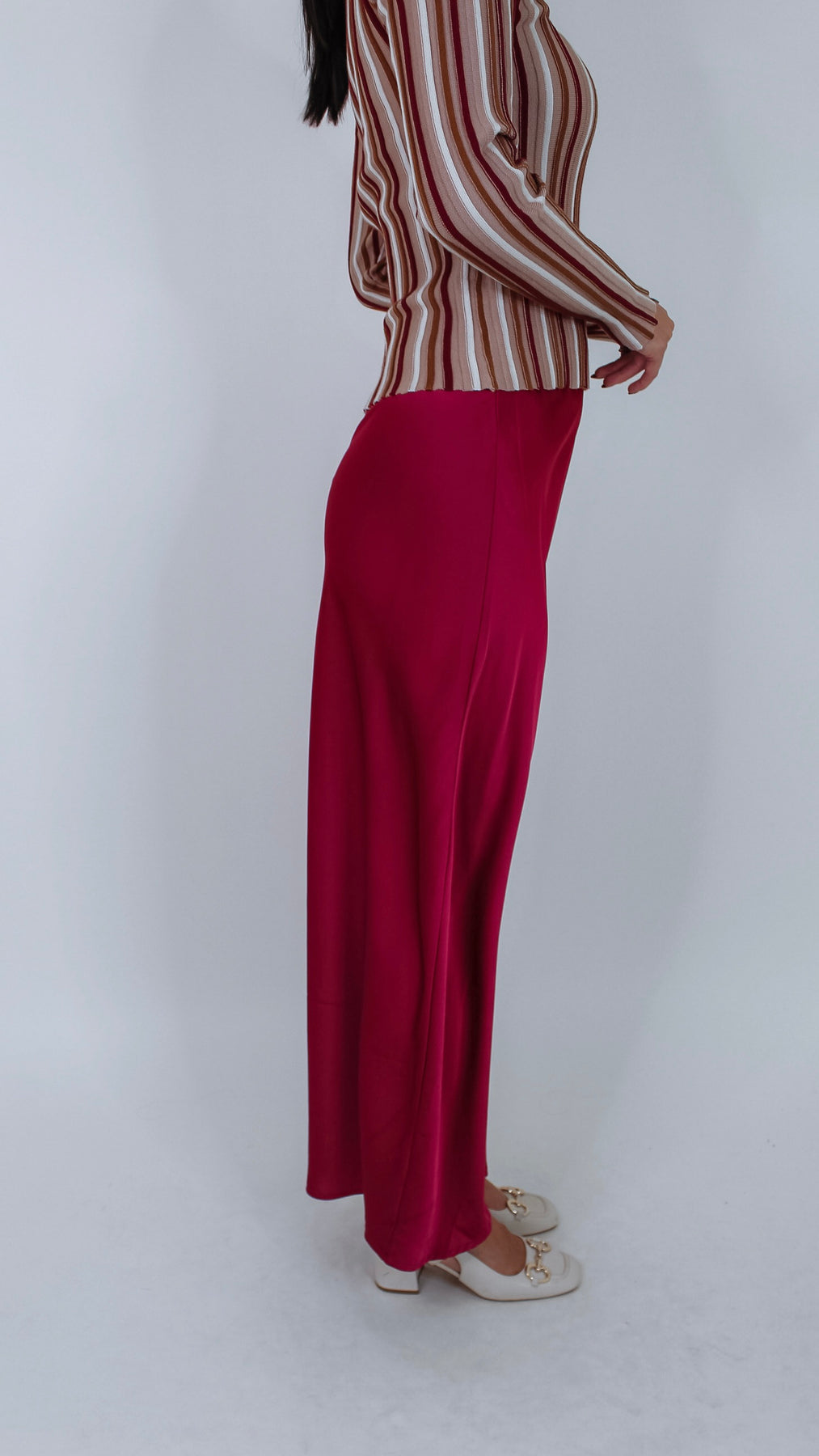 Elevate your style with the Berry Satin Midi Skirt in a lively cranberry shade. This silky smooth skirt flows effortlessly and hits at just the right length for a polished look. Perfect for twirling through weekends or adding a pop of color to your workday.