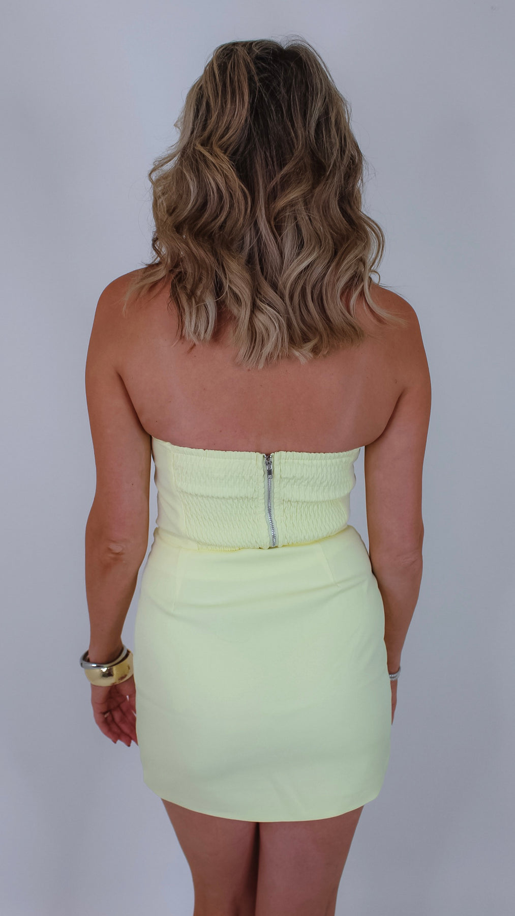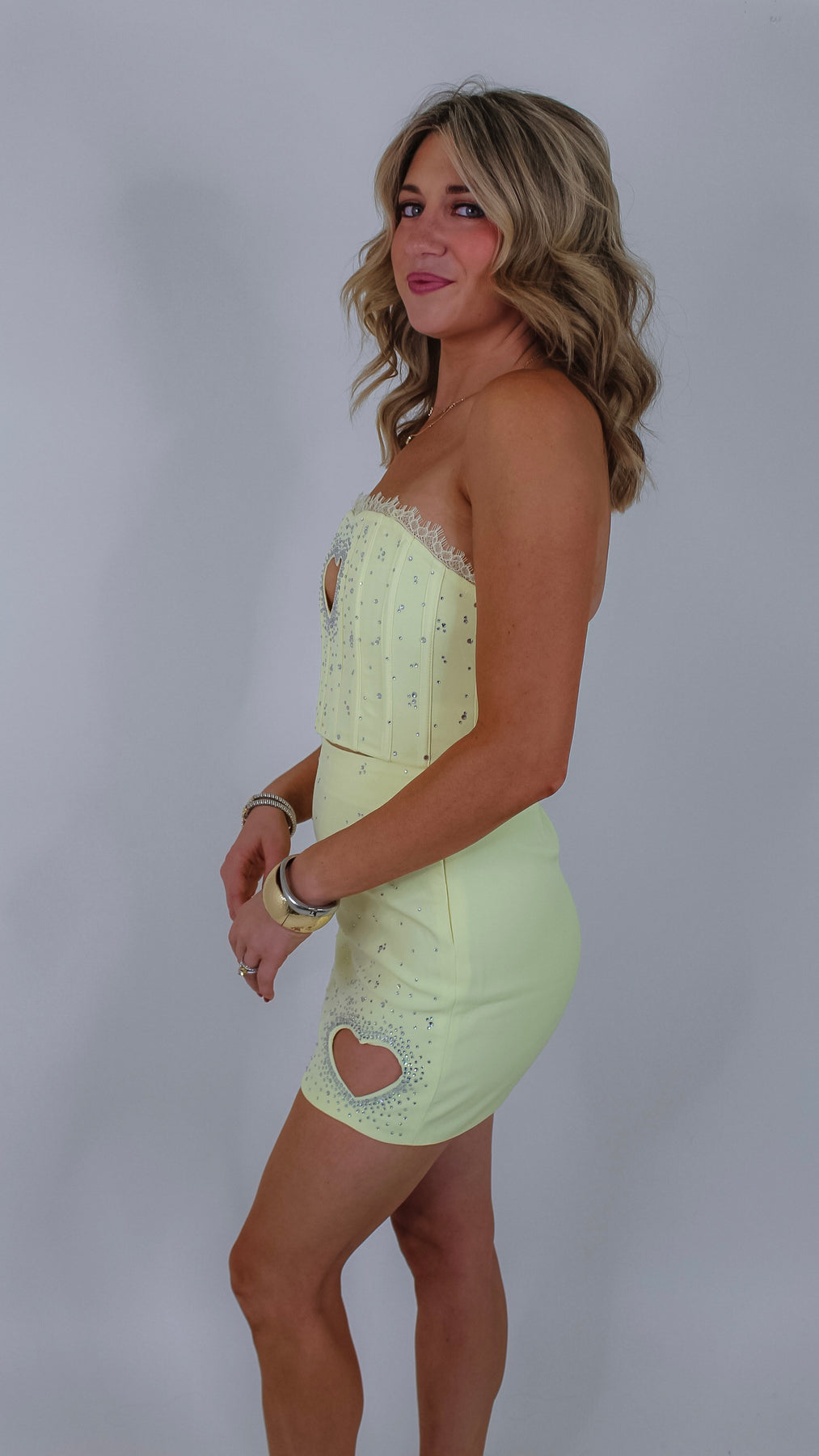 Get ready to turn heads in the Juno Yellow Skirt Set! This playful set includes a yellow corset and mini skirt, adorned with sparkling rhinestone details. With charming heart cut outs, you'll be feeling flirty and fun.