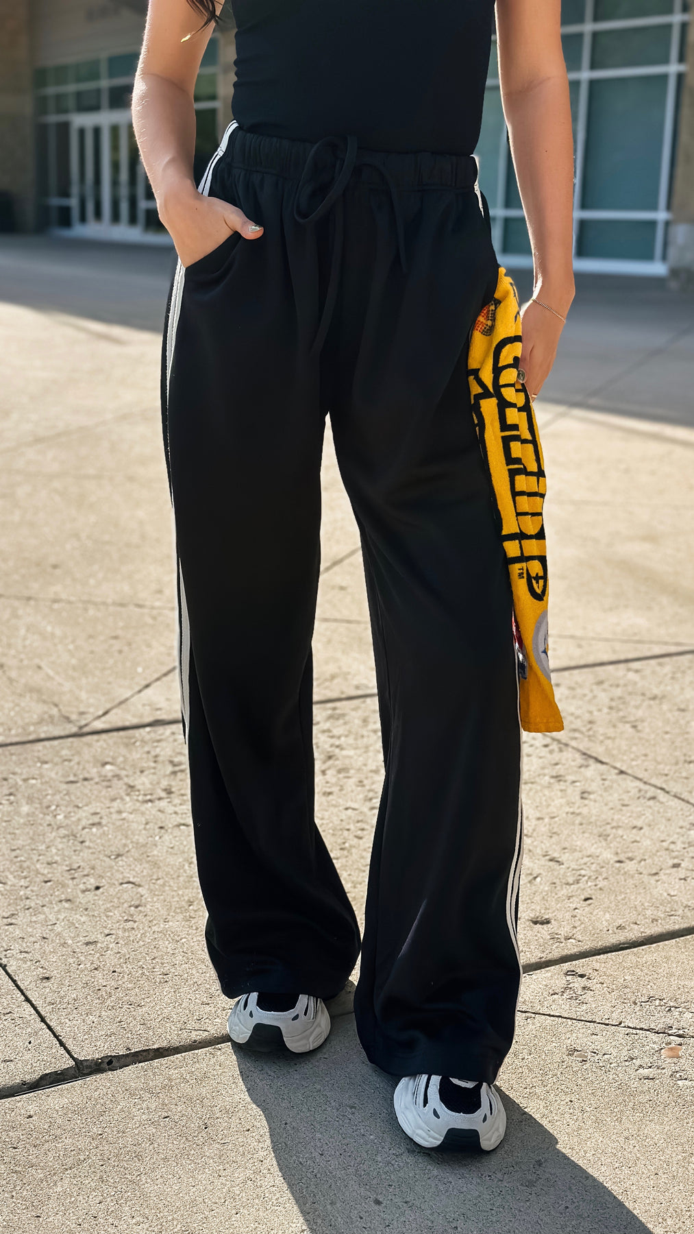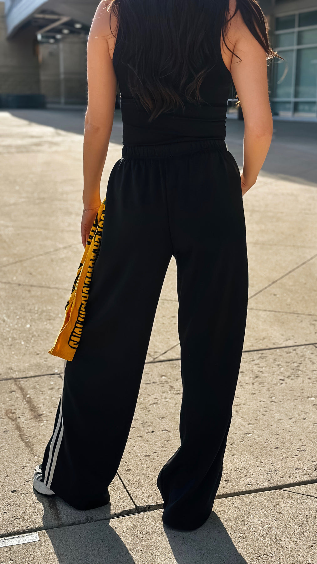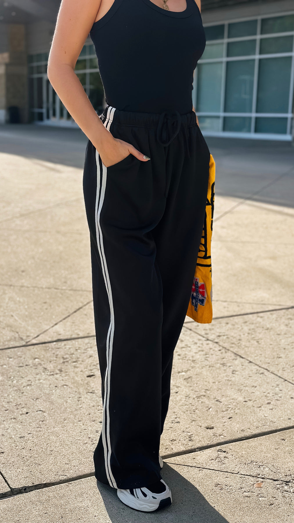 Step up your casual game with the Slay Black Track Pants! Featuring crisp white side stripes, these pants add a sporty edge while keeping things effortlessly cool. Perfect for lounging or hitting the streets, they blend comfort and style in one sleek package.