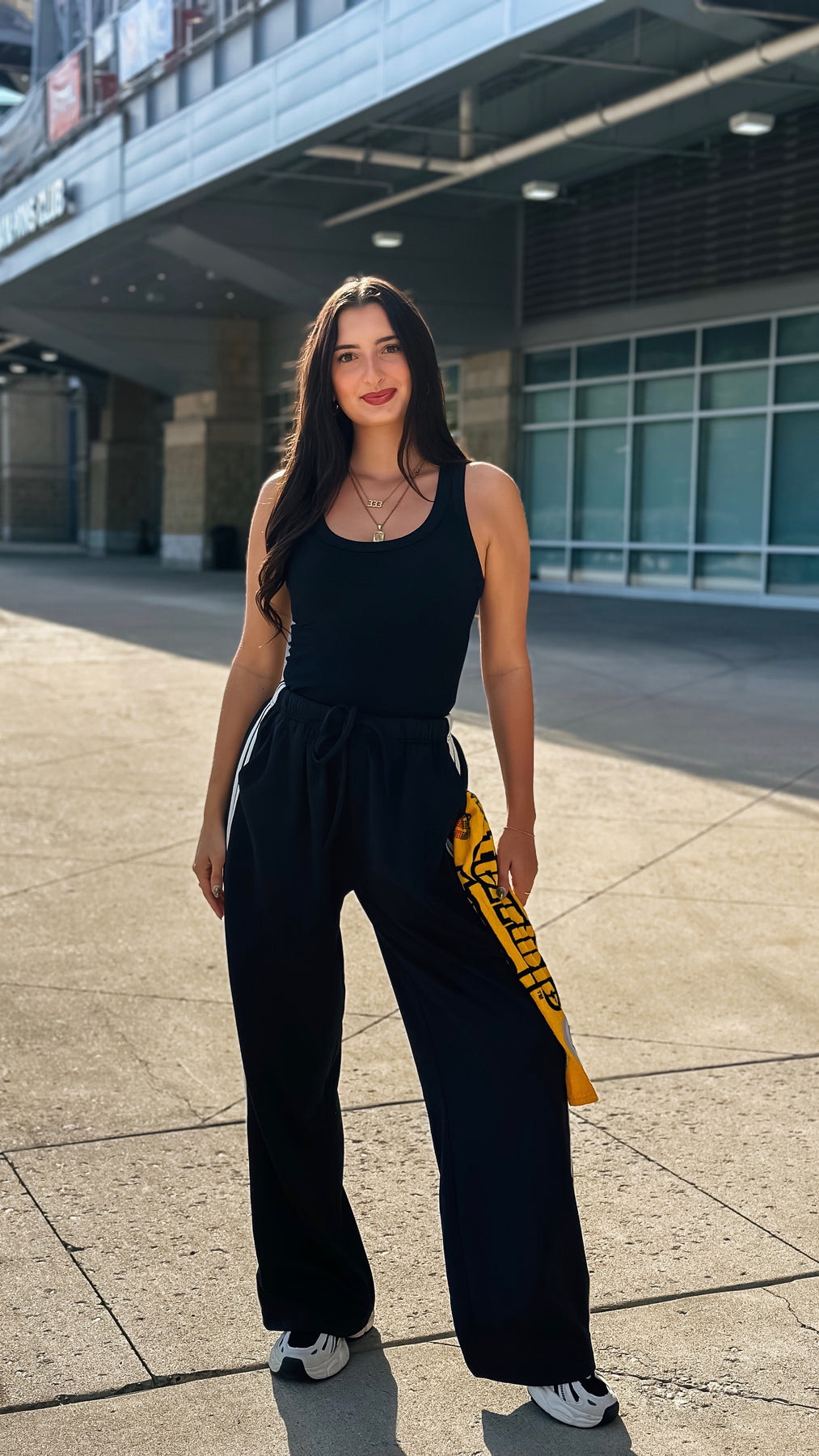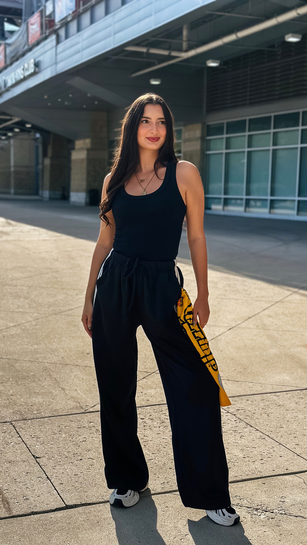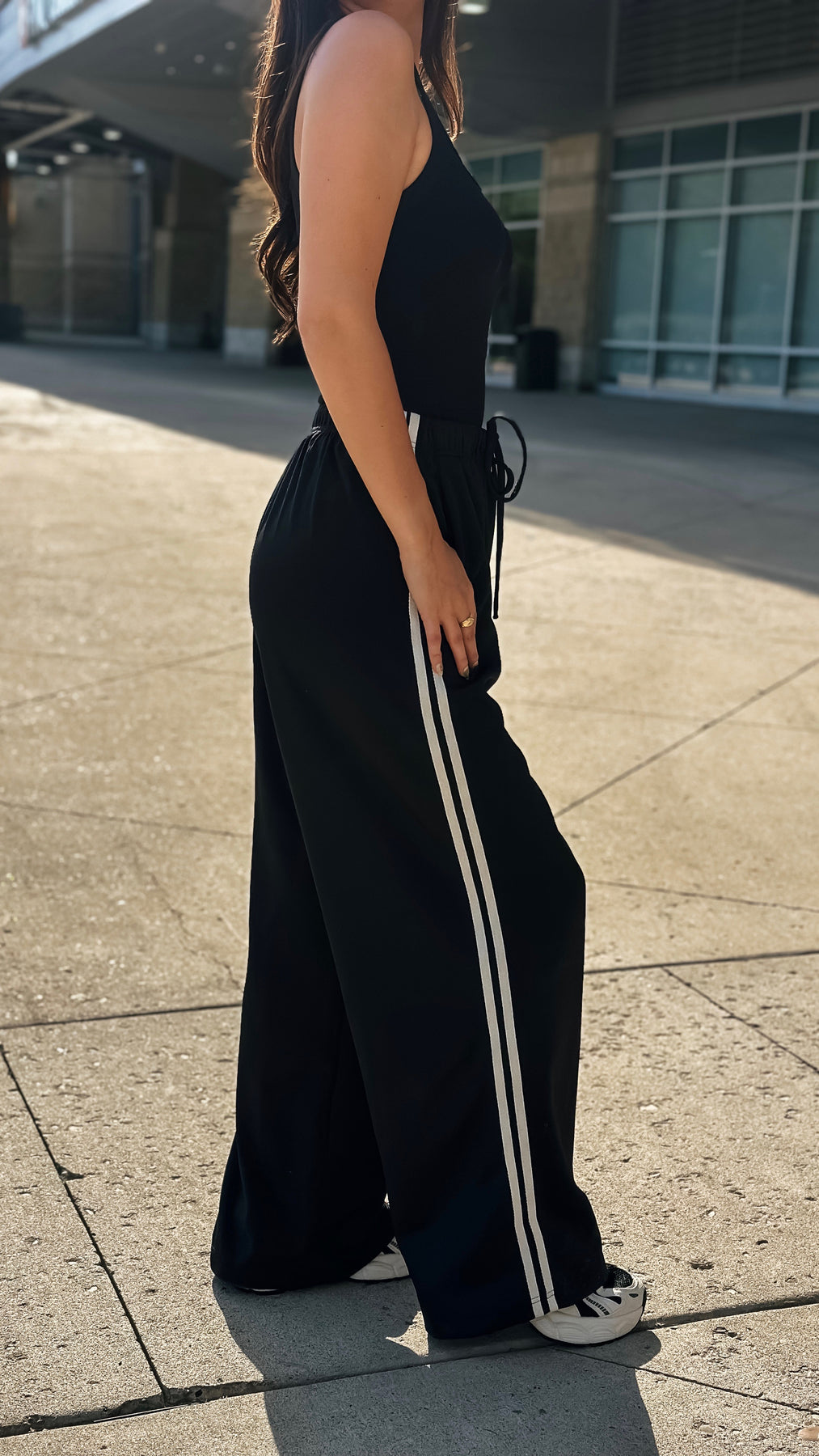 Step up your casual game with the Slay Black Track Pants! Featuring crisp white side stripes, these pants add a sporty edge while keeping things effortlessly cool. Perfect for lounging or hitting the streets, they blend comfort and style in one sleek package.