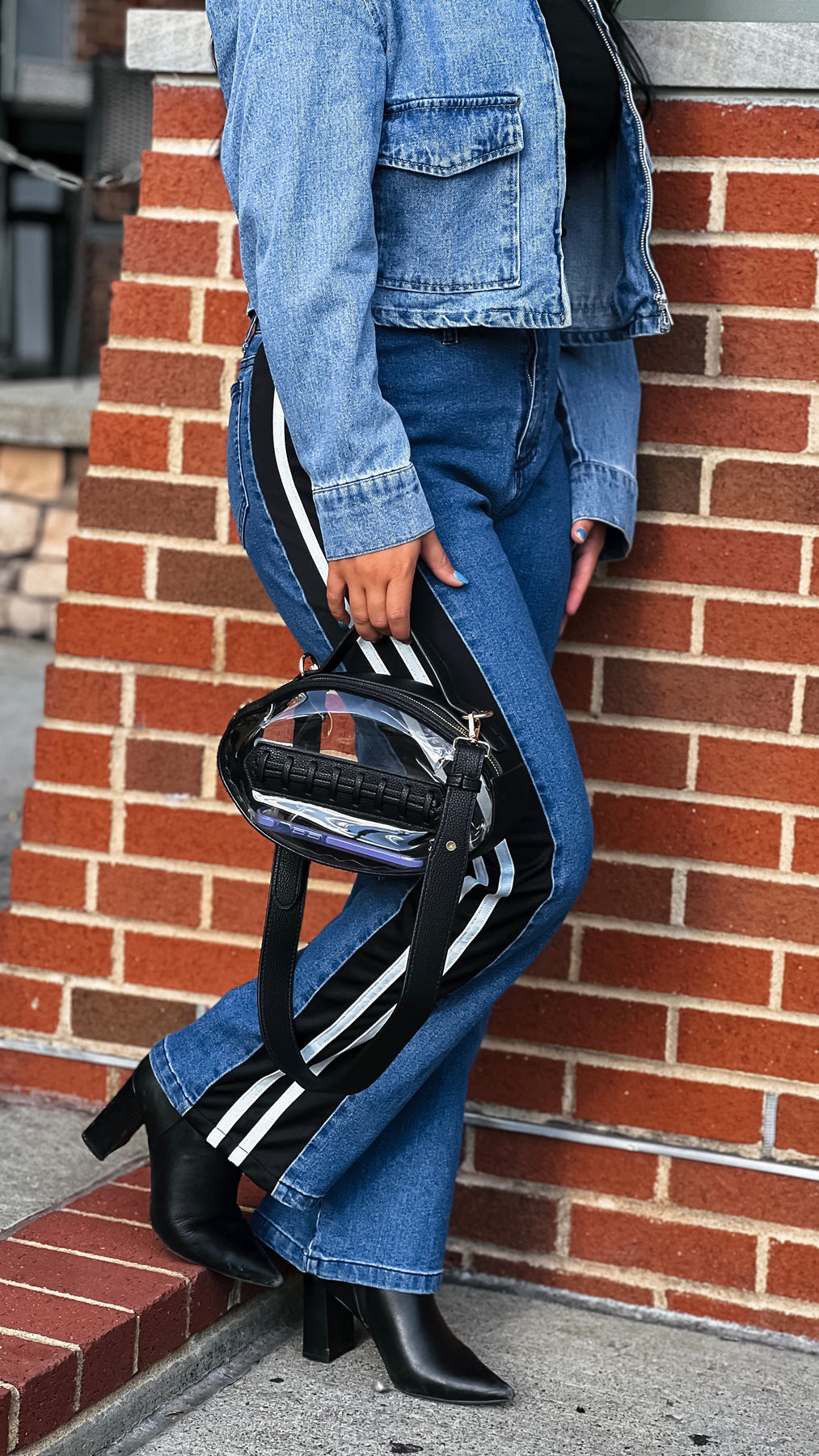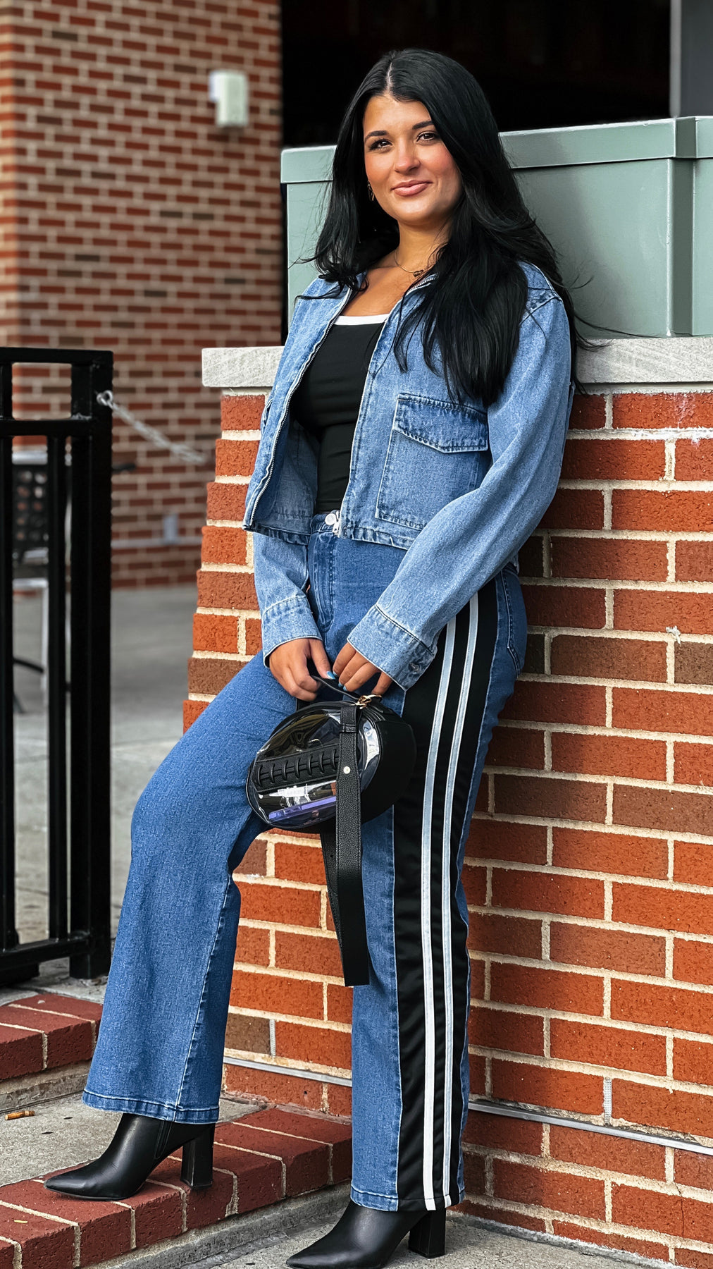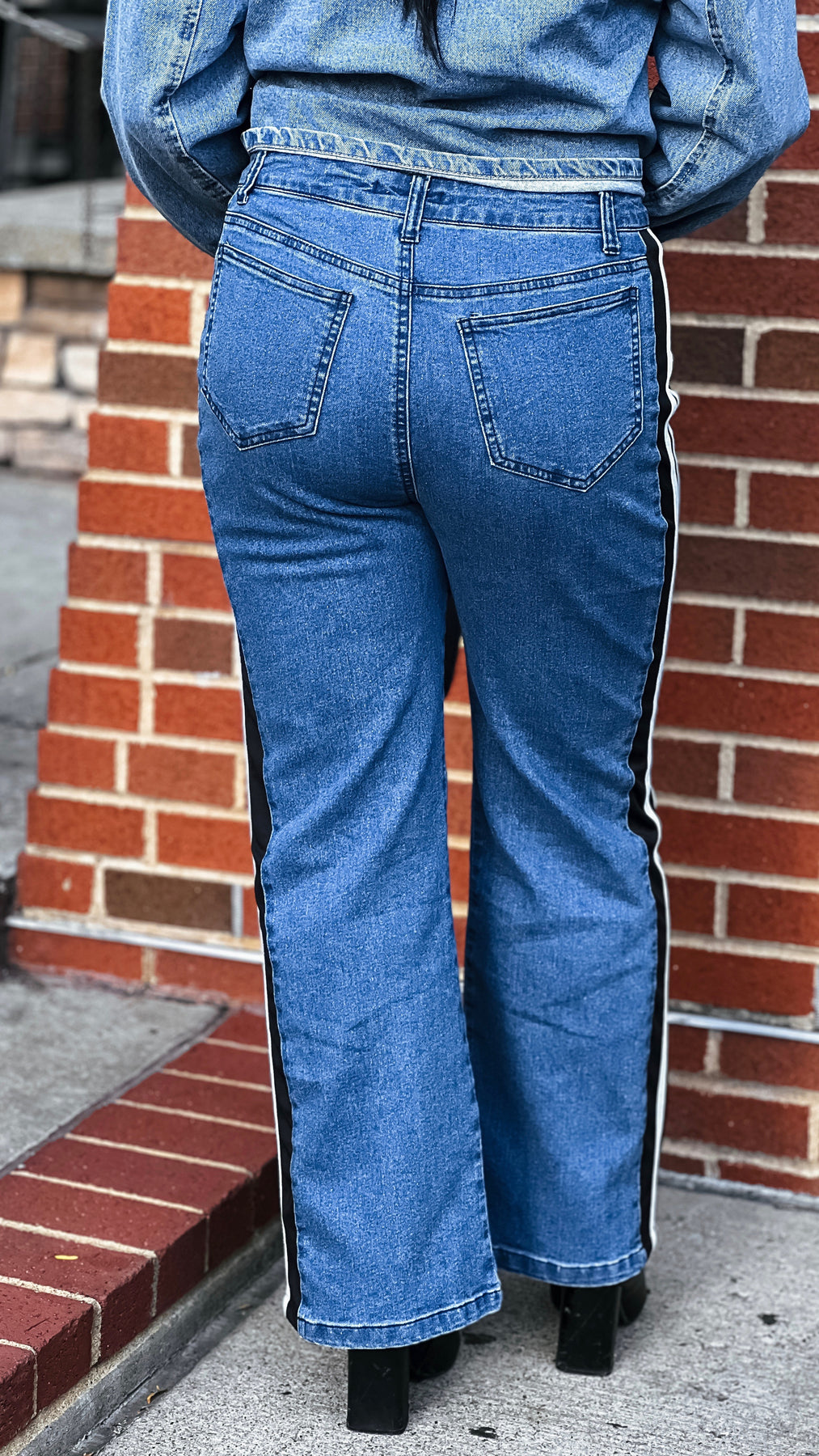 Step up your style game with these Track Star Denim Pants! Featuring a bold black and white side stripe, they add a sporty twist to classic denim. Perfect for those who love comfort with a dash of flair