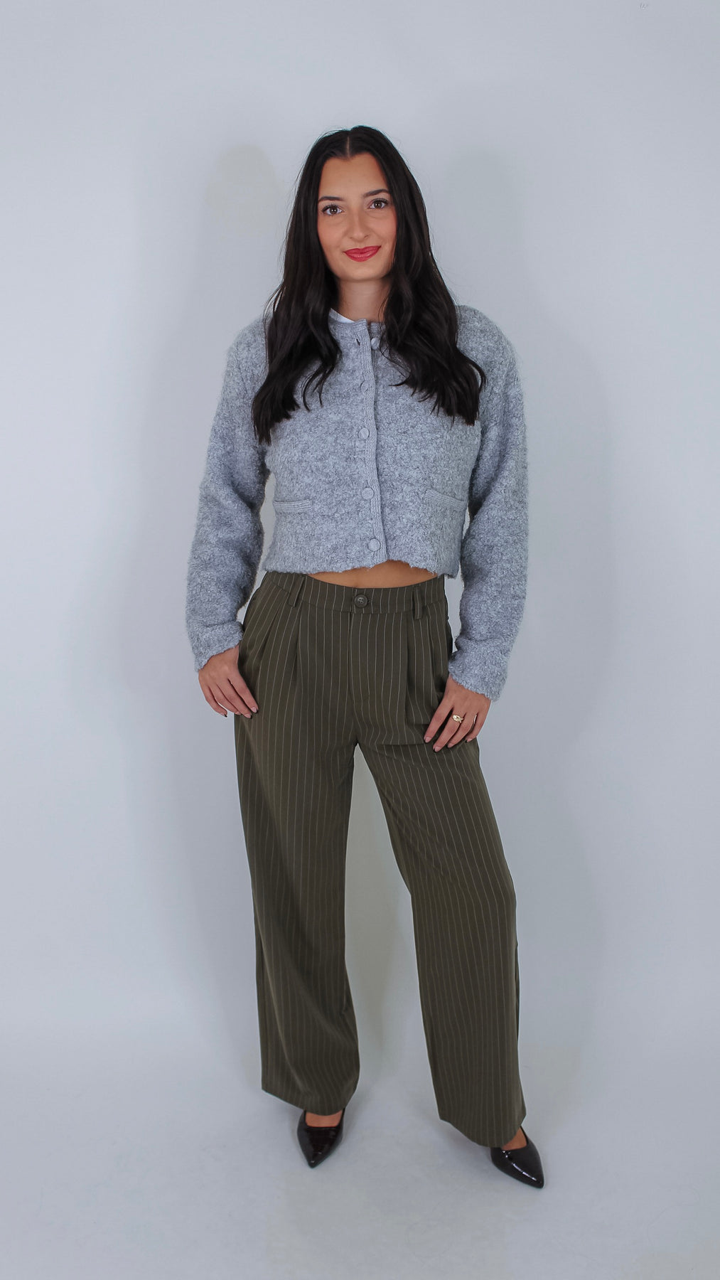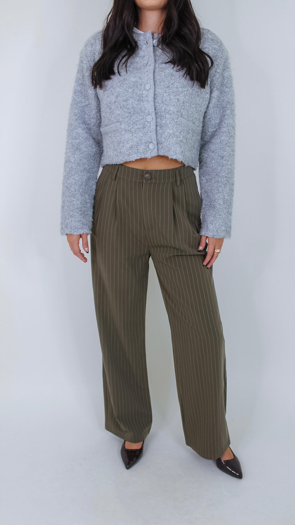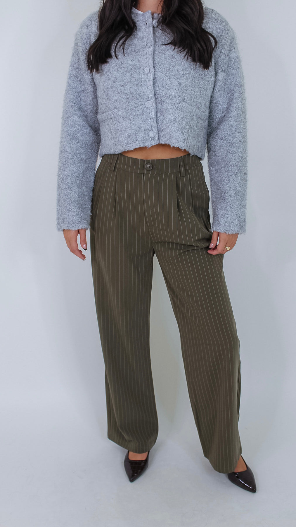 Step out in style with the Tyler Pin Stripe Pants in olive! These playful pants feature a subtle pinstripe pattern that adds a dash of flair to your outfit. The olive green hue brings a fresh twist to classic tailoring, perfect for mixing and matching. Comfortable and chic, they’re ready to elevate your look from casual days to dressier nights with ease.