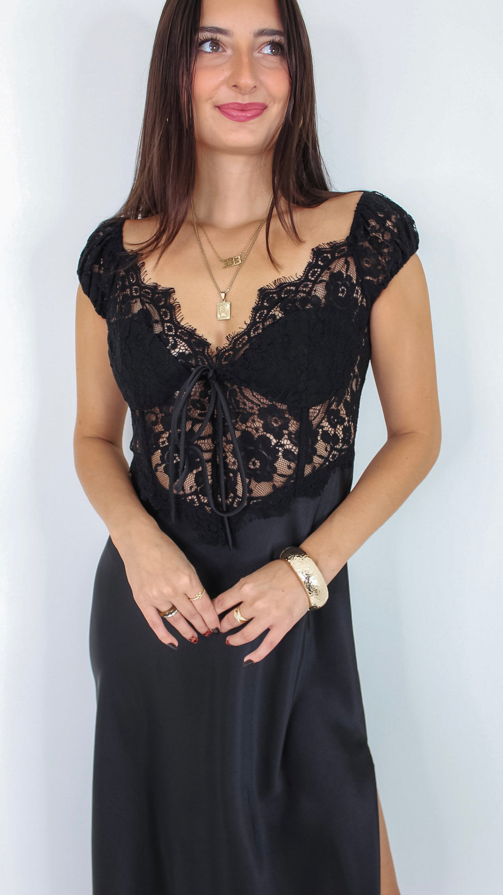 Slip into elegance with the All Is Well Black Maxi Dress, featuring luxurious black satin that flows effortlessly. Delicate lace detailing adds a touch of flirtatious charm, making this dress perfect for those nights when you want to shine.