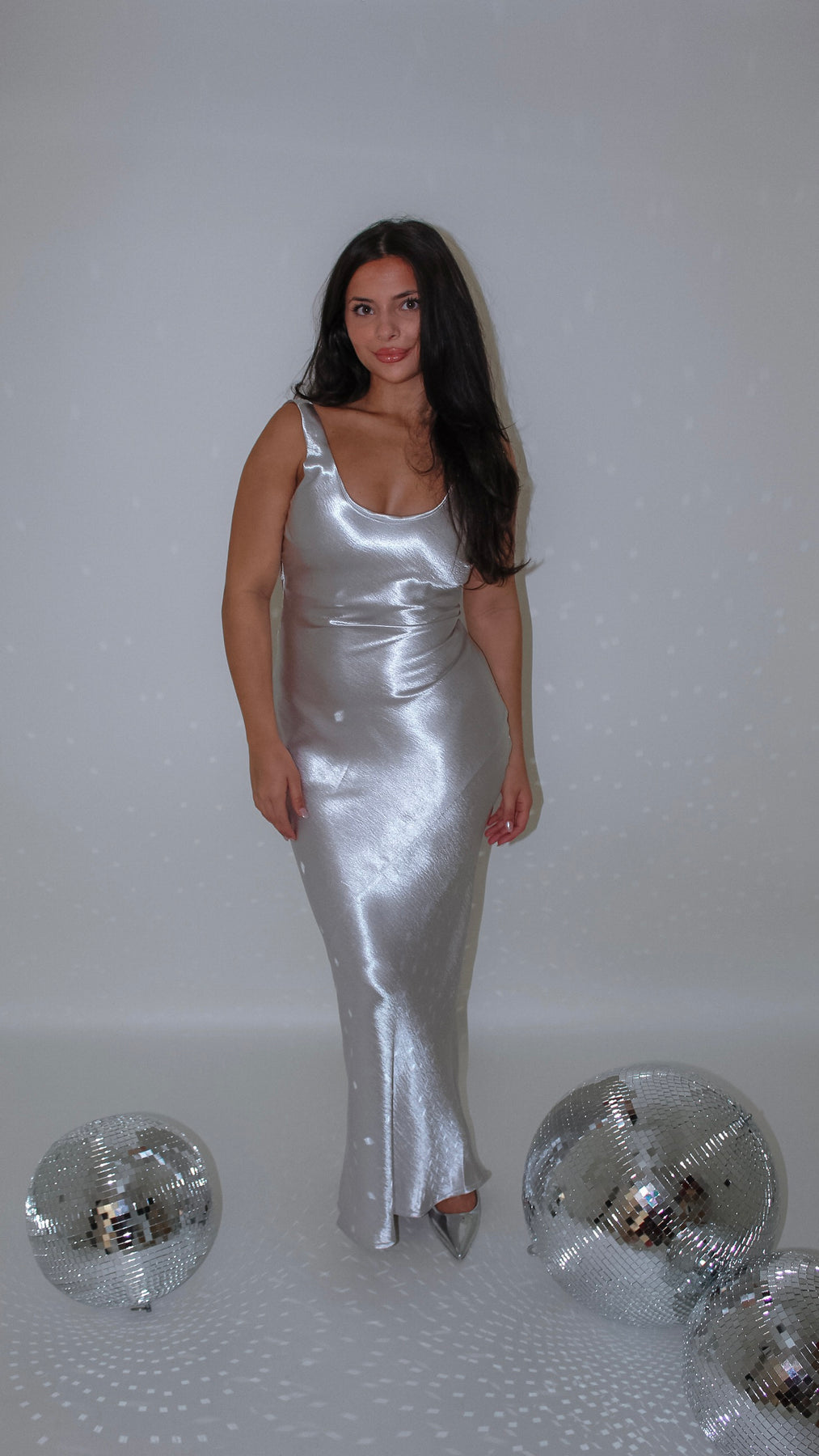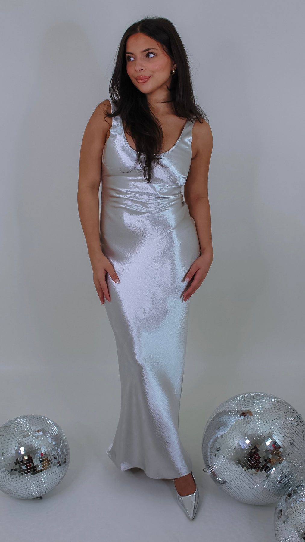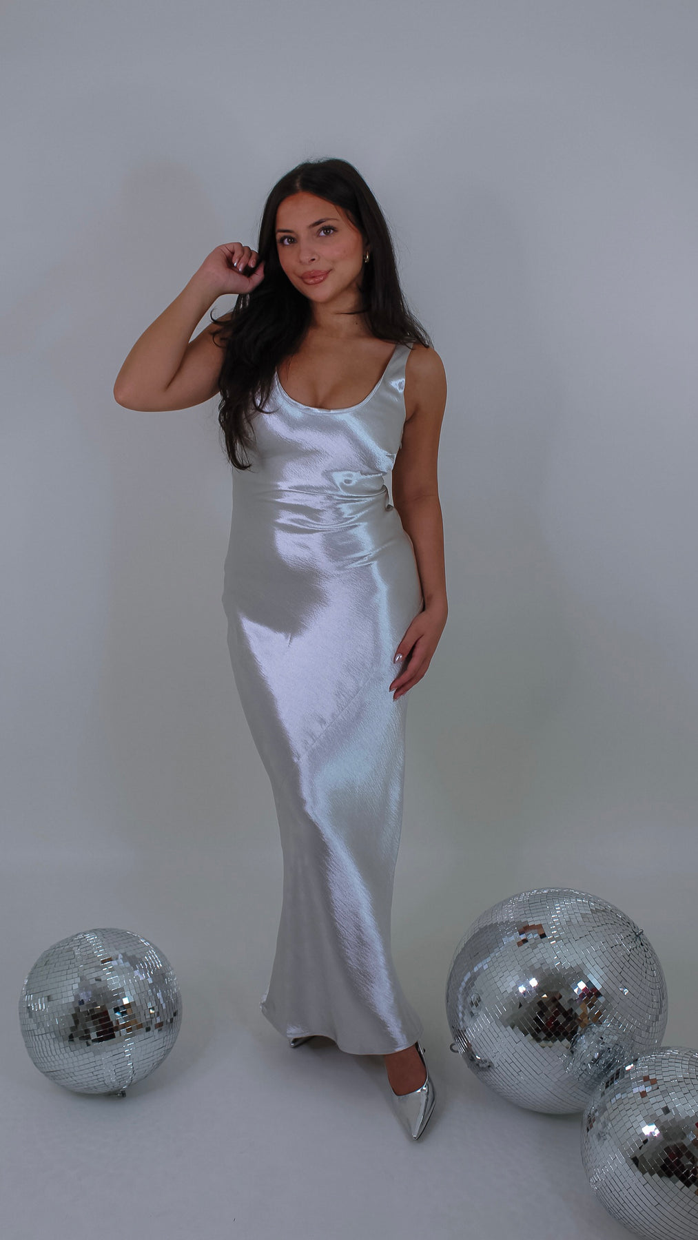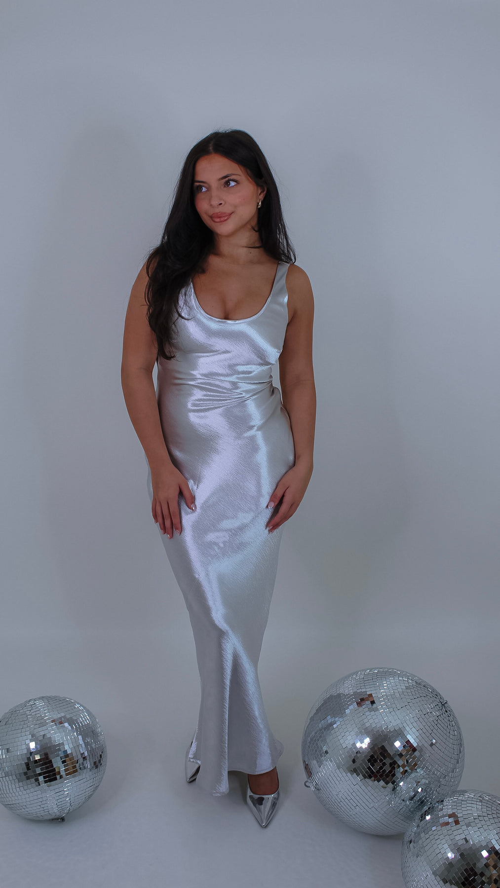 Shine bright and dance all night in the Disco Girl Silver Maxi Dress. This shimmering silver gown features a low back that adds a flirty twist to your elegant look. Perfect for turning heads at parties or special events