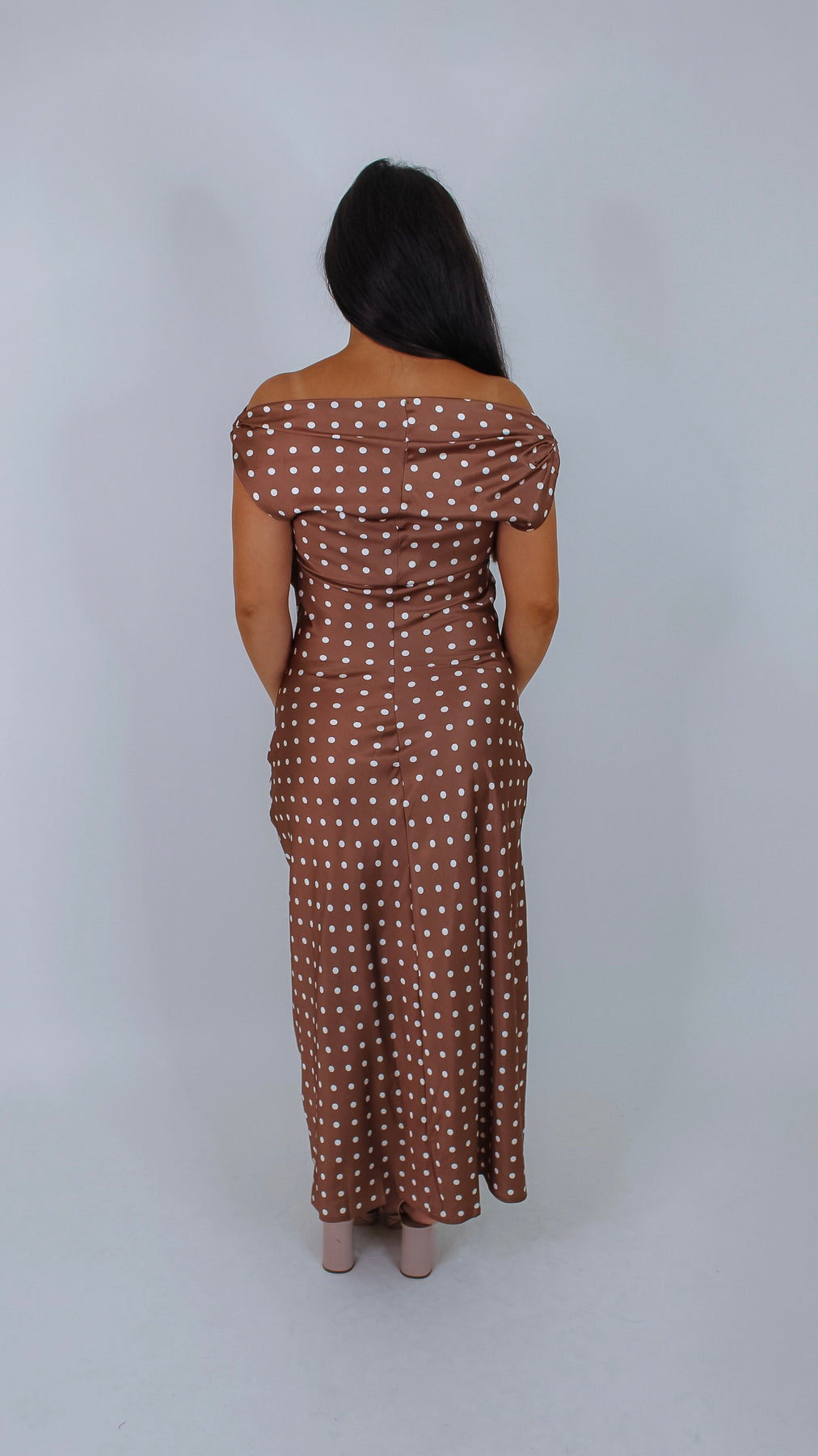 Step out in style with the Forever Brown Polka Dot Maxi Dress. Its silky satin fabric and charming brown polka dot pattern deliver a whimsical yet elegant look. The flowing maxi length adds drama and comfort, perfect for dancing the night away or turning heads on a sunny day.