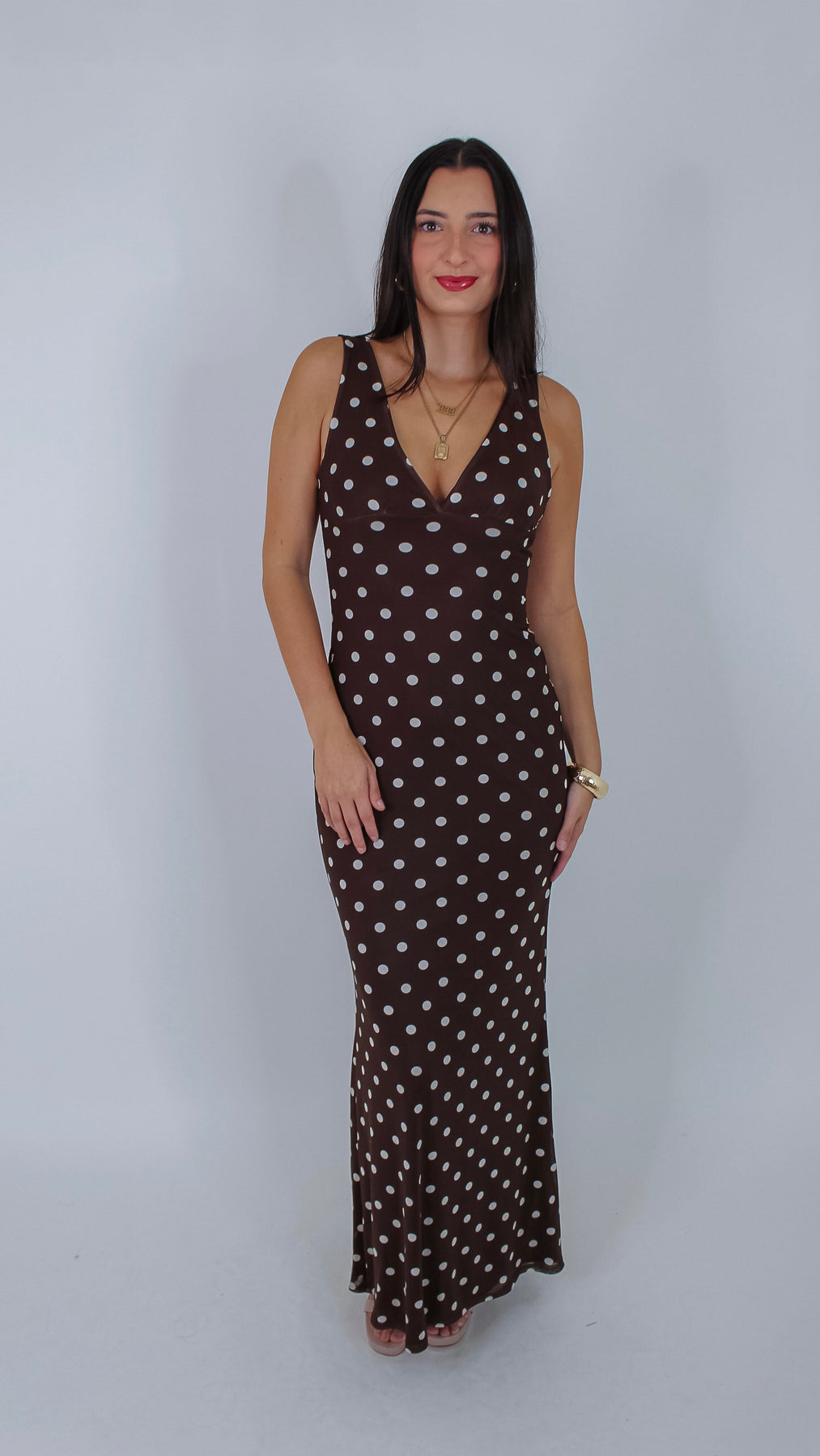 Step into charm and whimsy with the Leslie Brown Polka Dot Dress. Its flowing maxi length and classic brown shade dotted with playful polka spots make it perfect for twirling through sunny days or evenings. Comfortable and effortlessly stylish, this dress adds a fun twist to any outfit while keeping you confident all day long.