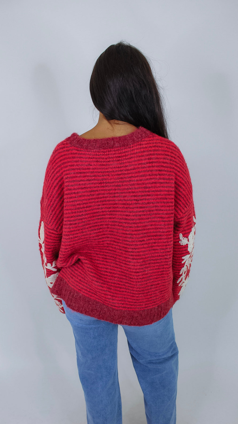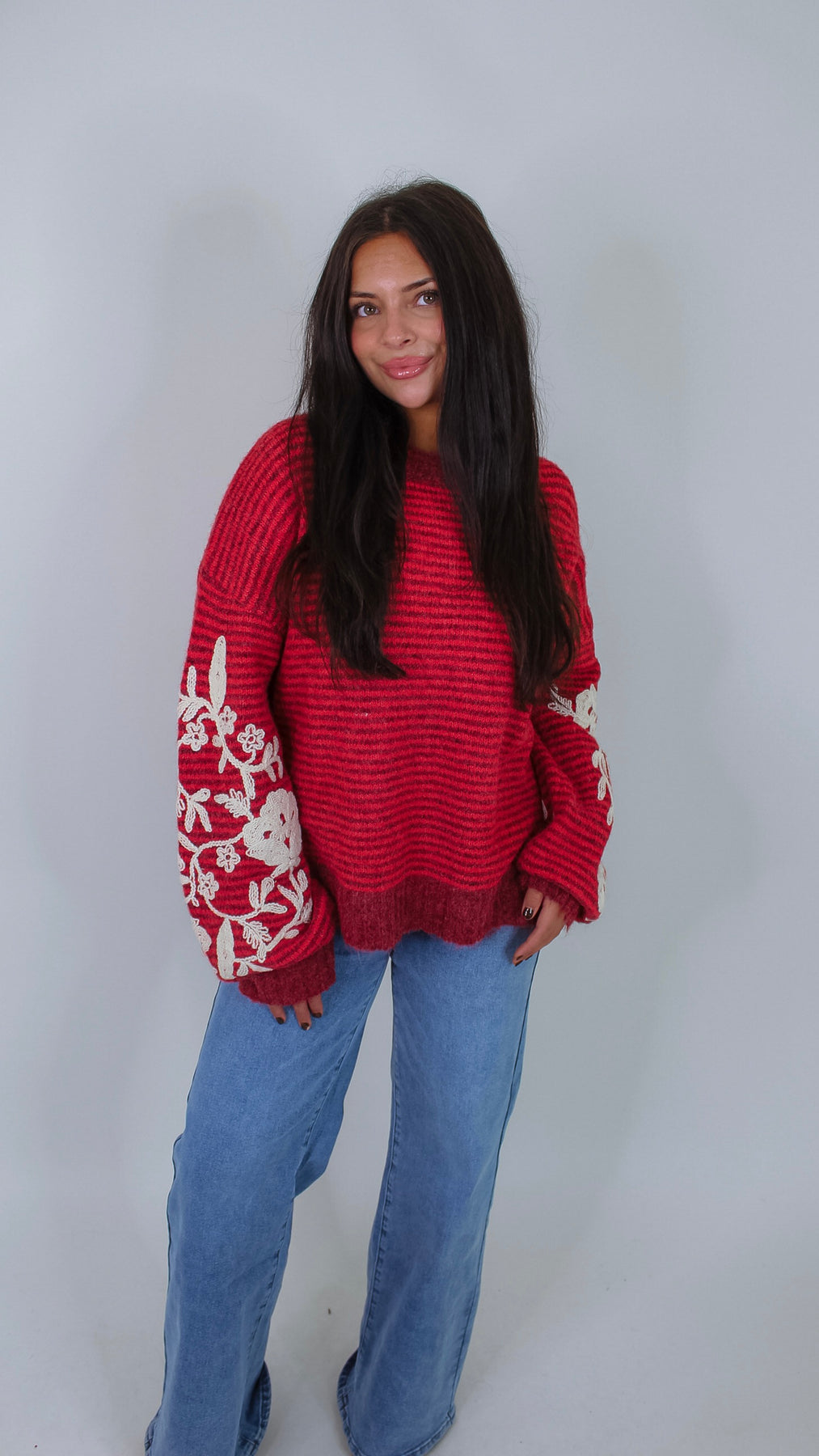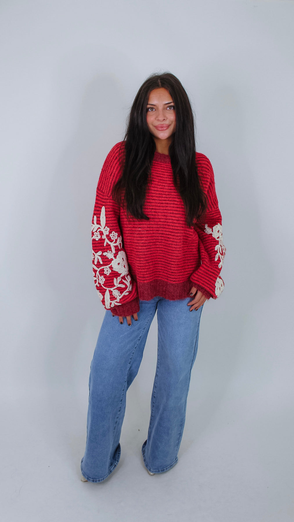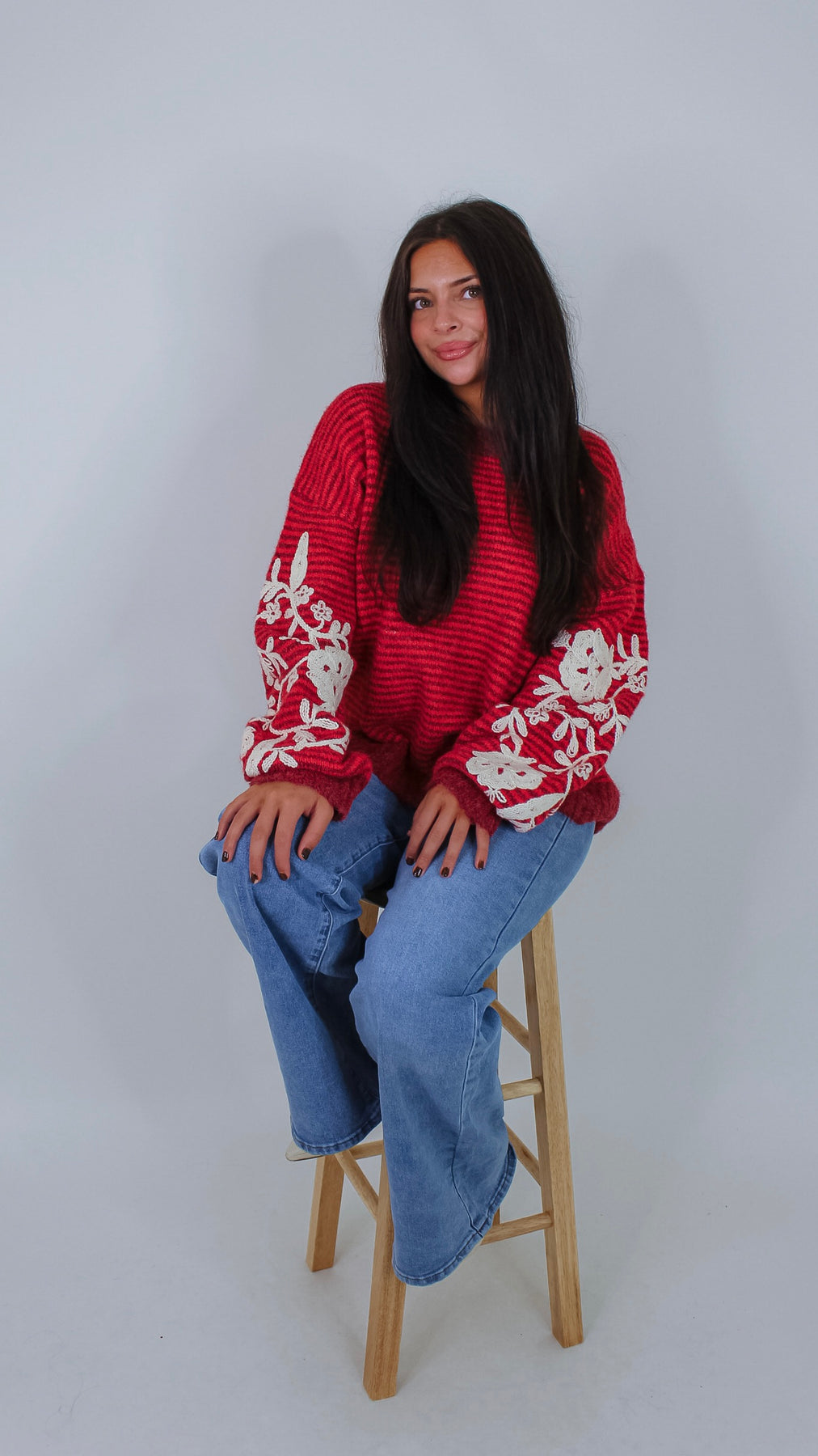 Cozy up in the Aly Rust Floral Sweater, where warm rust tones meet playful floral embroidery on the sleeves. This charming sweater adds a burst of personality to your look while keeping you snug and stylish all season long.