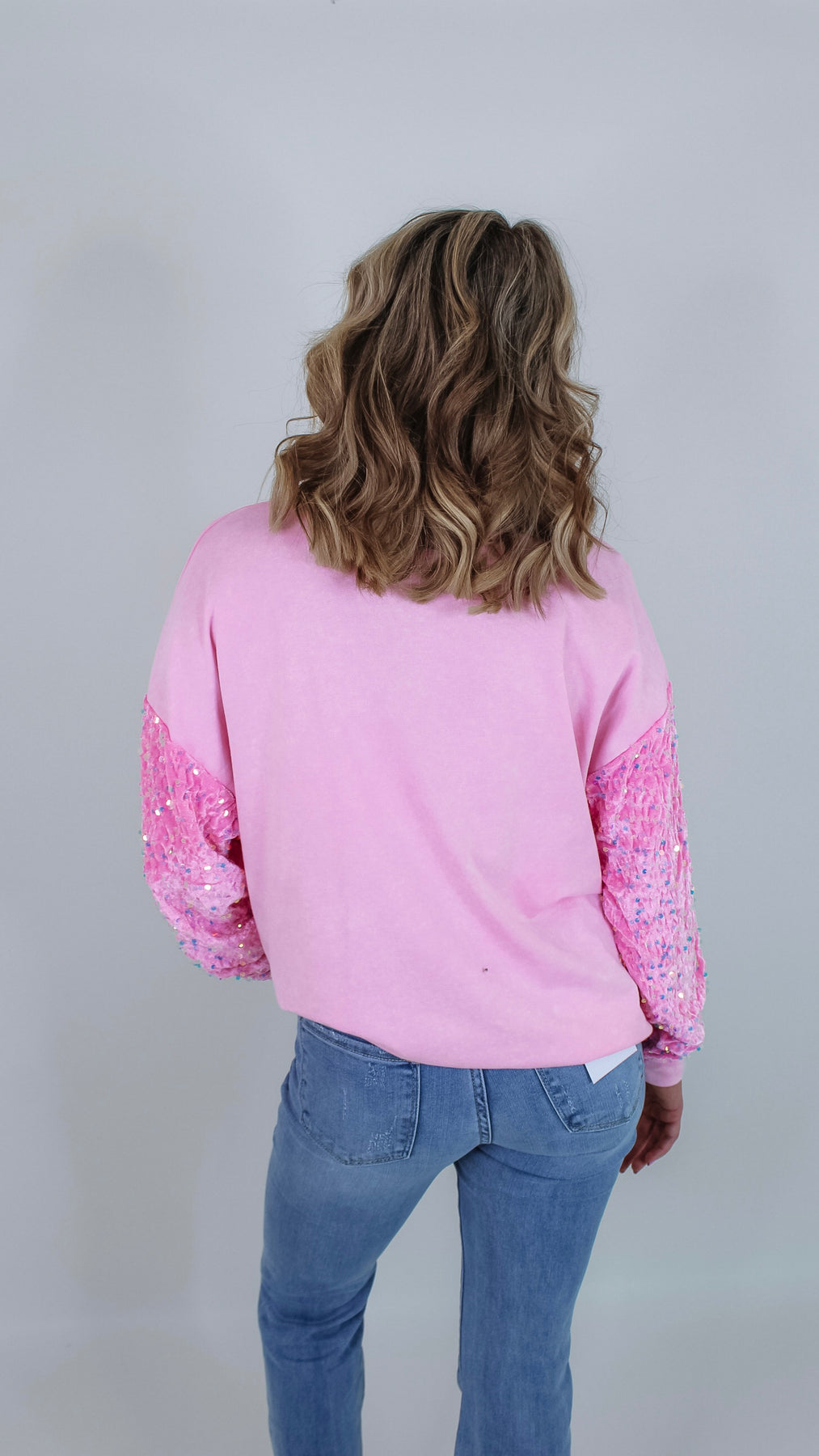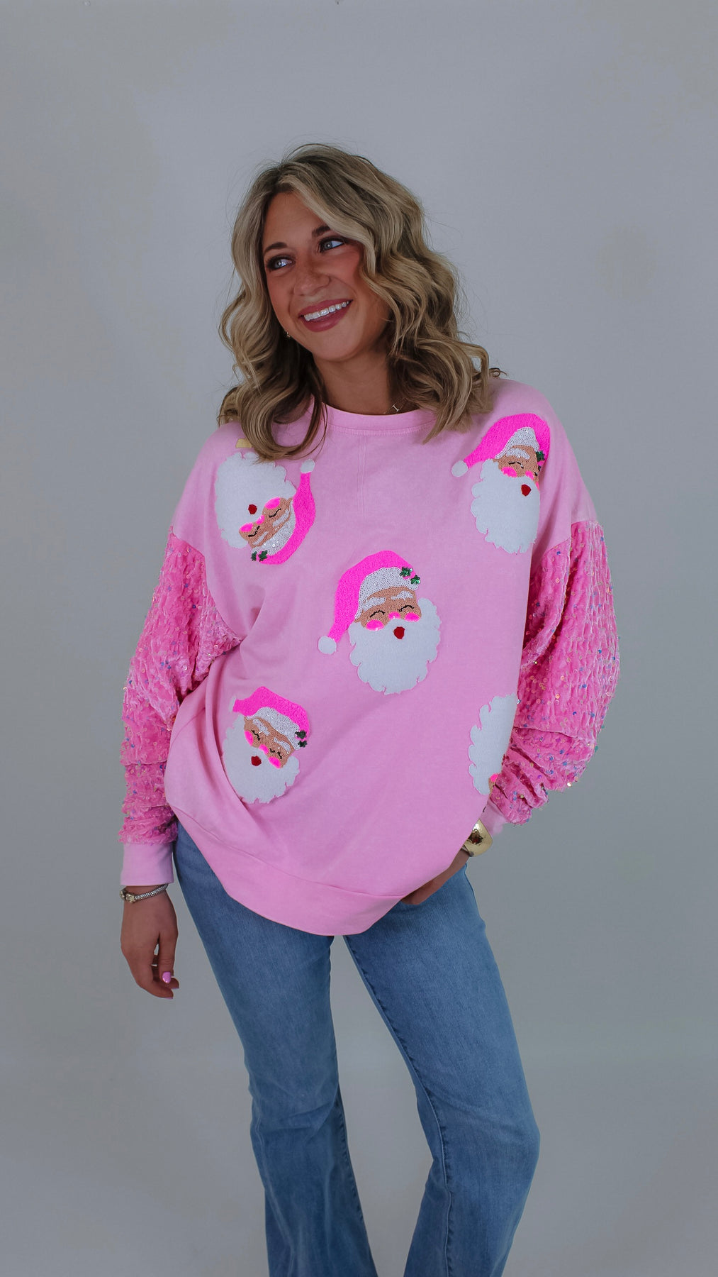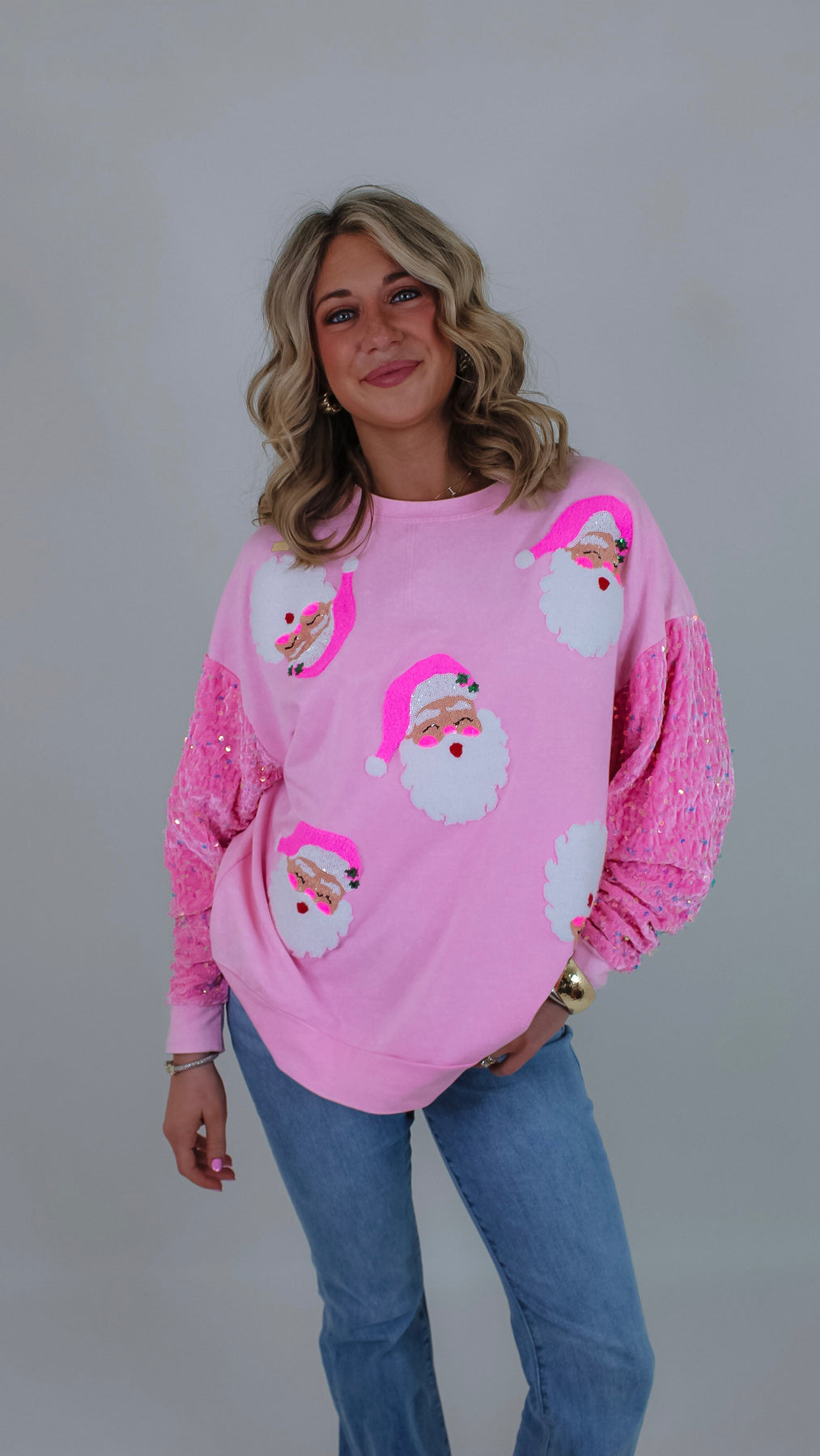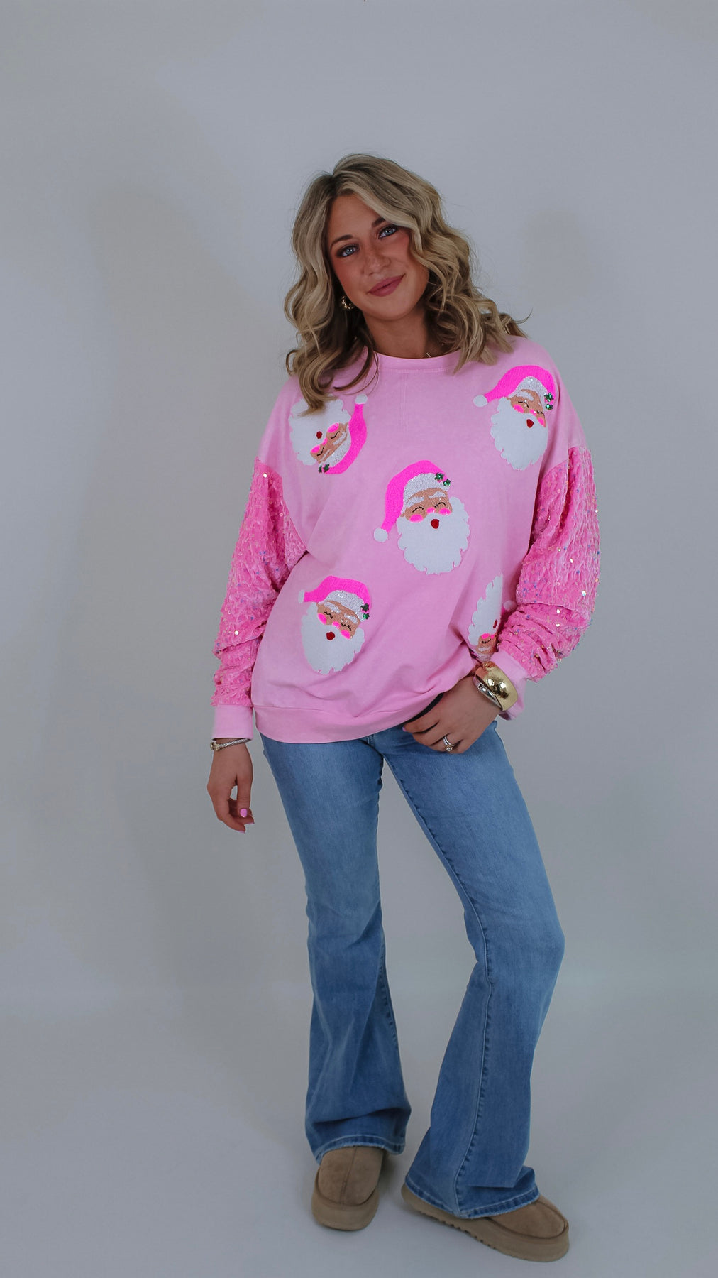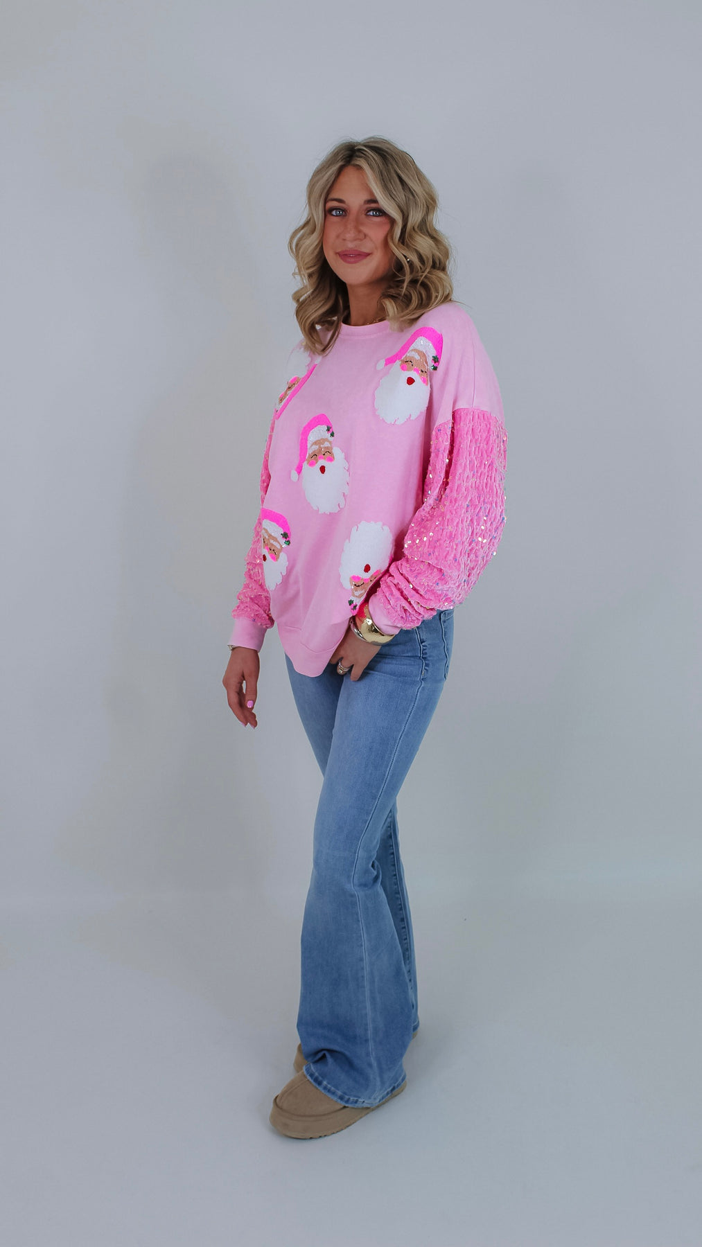 Get into the holiday spirit with the Santa Pink Sweater, featuring sparkling sequin details that catch every eye. This playful twist on a classic festive sweater adds a pop of fun and shimmer to your seasonal wardrobe, perfect for spreading cheer at any holiday gathering. Cozy, bright, and full of sparkle—it's your new favorite festive go-to.