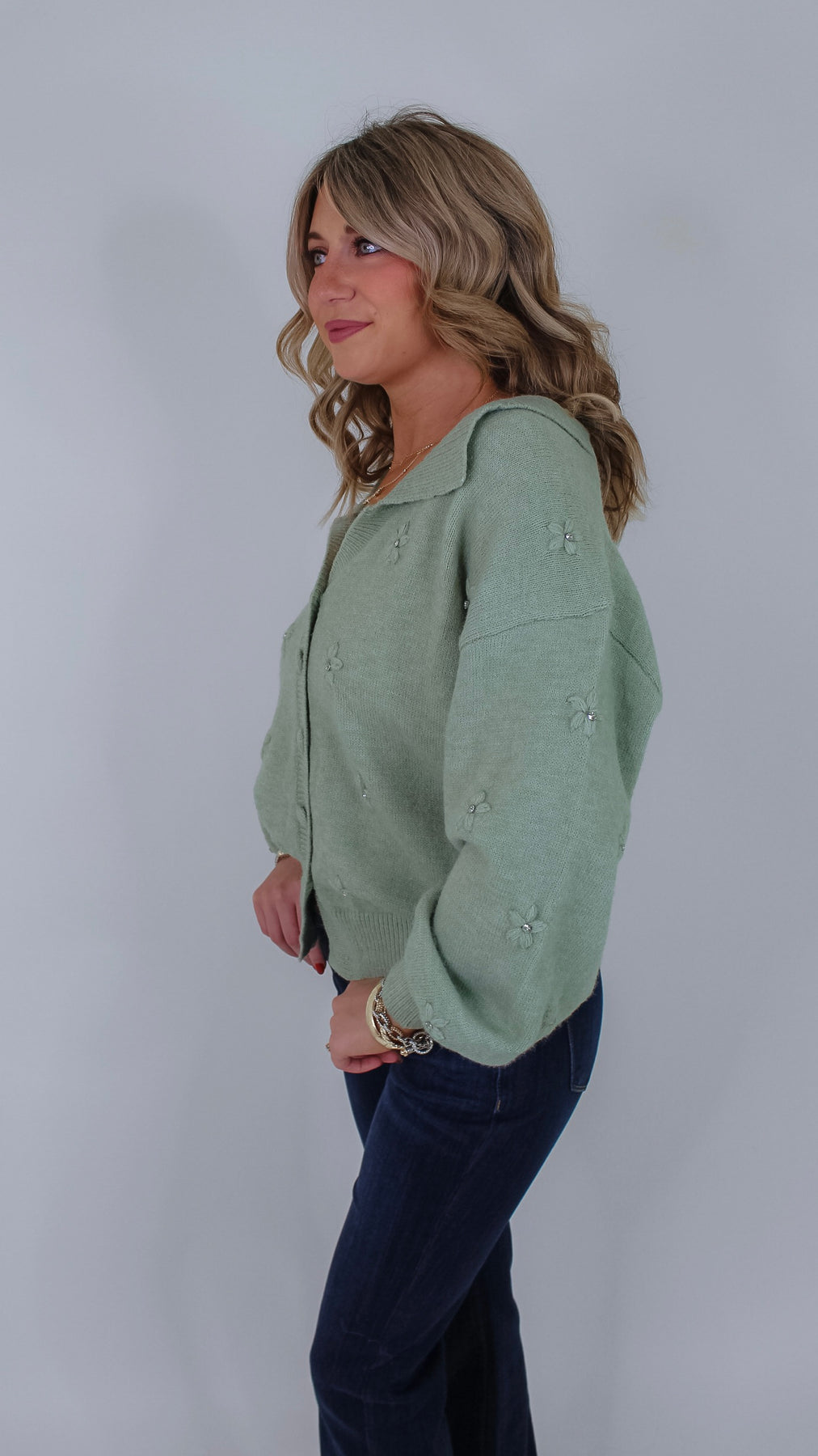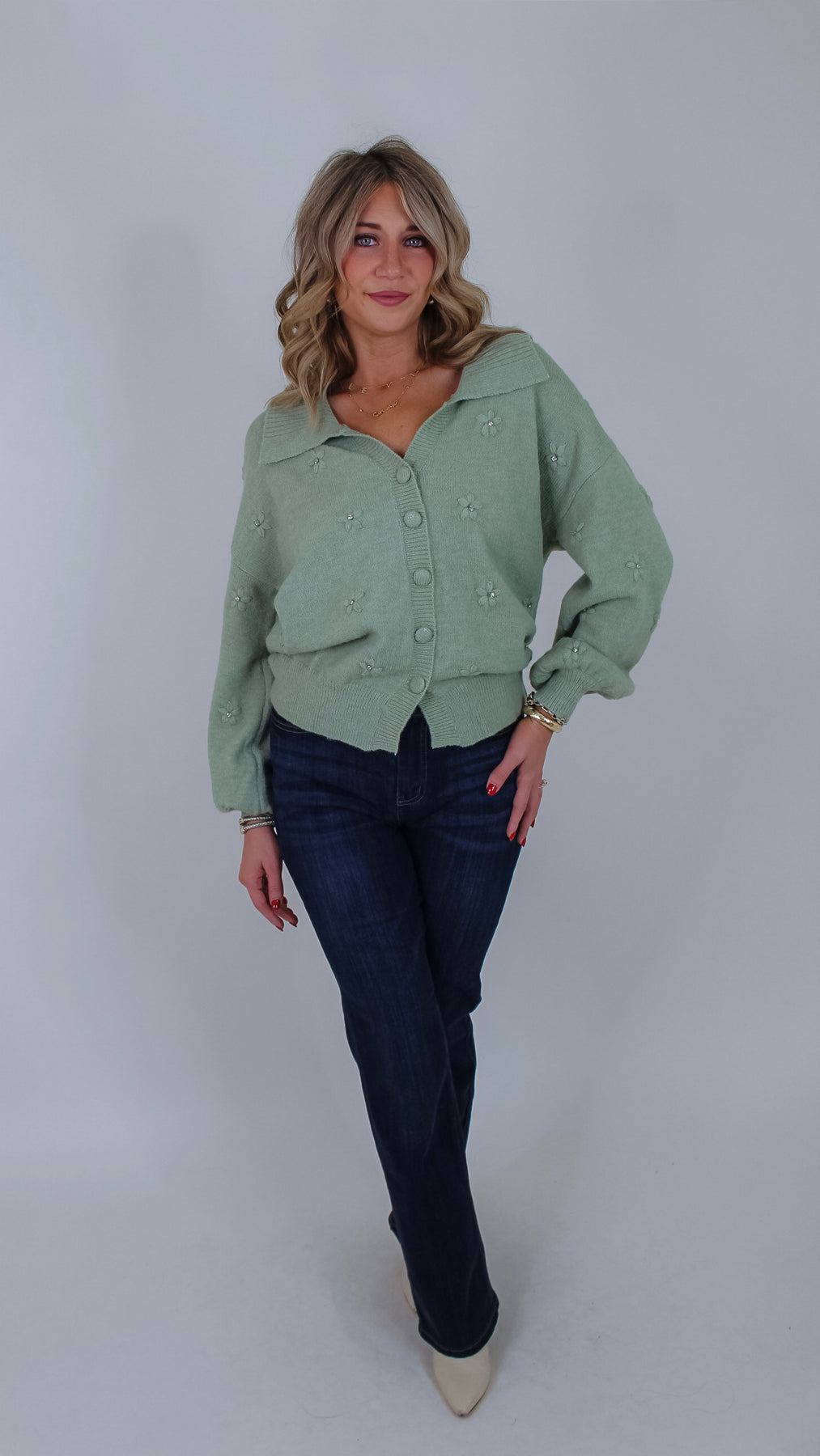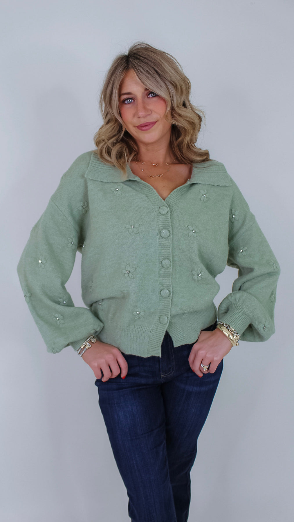 Add a touch of whimsy to your wardrobe with the Toni Sage Floral Cardigan. This charming button-up piece features a soft sage hue, a classic collar, and delightful 3D flower rhinestone details that catch the light with every move. Perfect for layering, it brings playful elegance to any outfit, whether you’re dressing up or keeping it casual. Embrace cozy style with a sparkling twist!