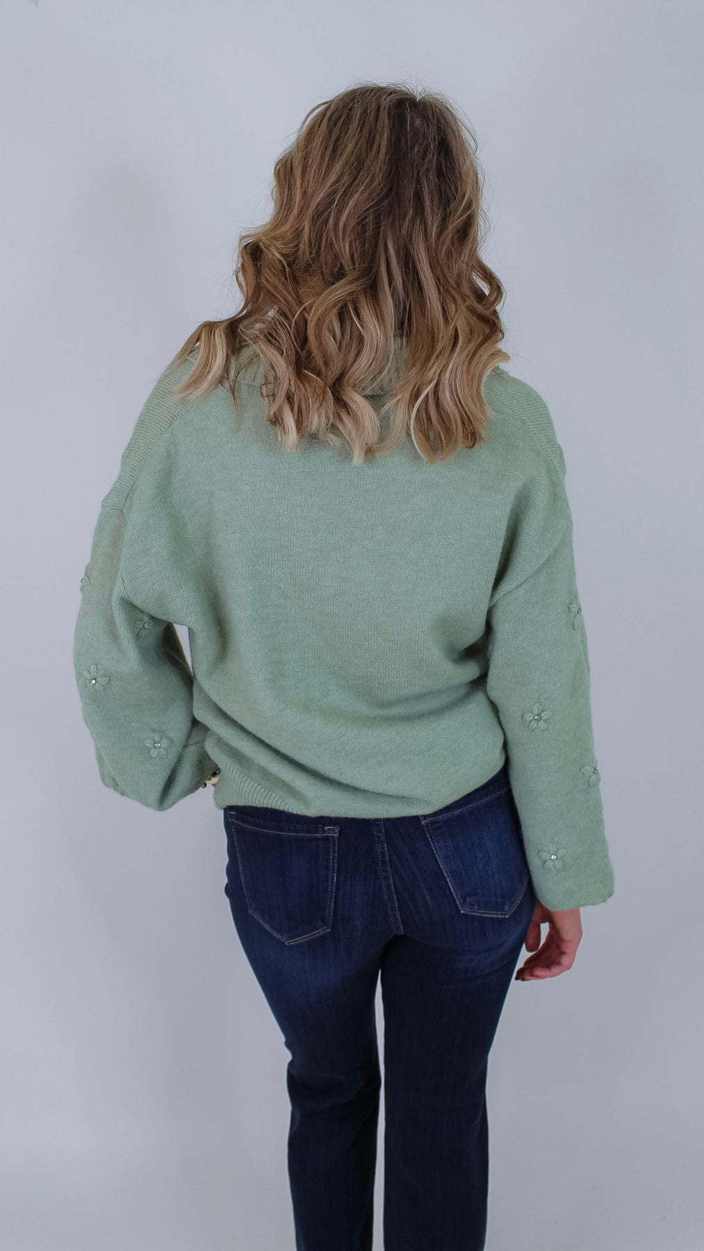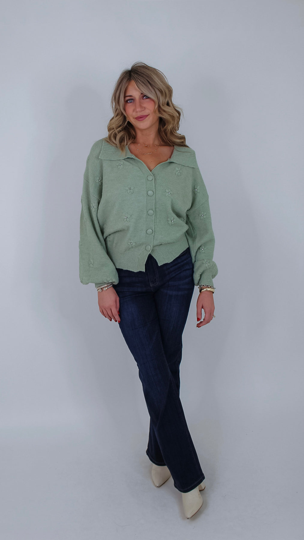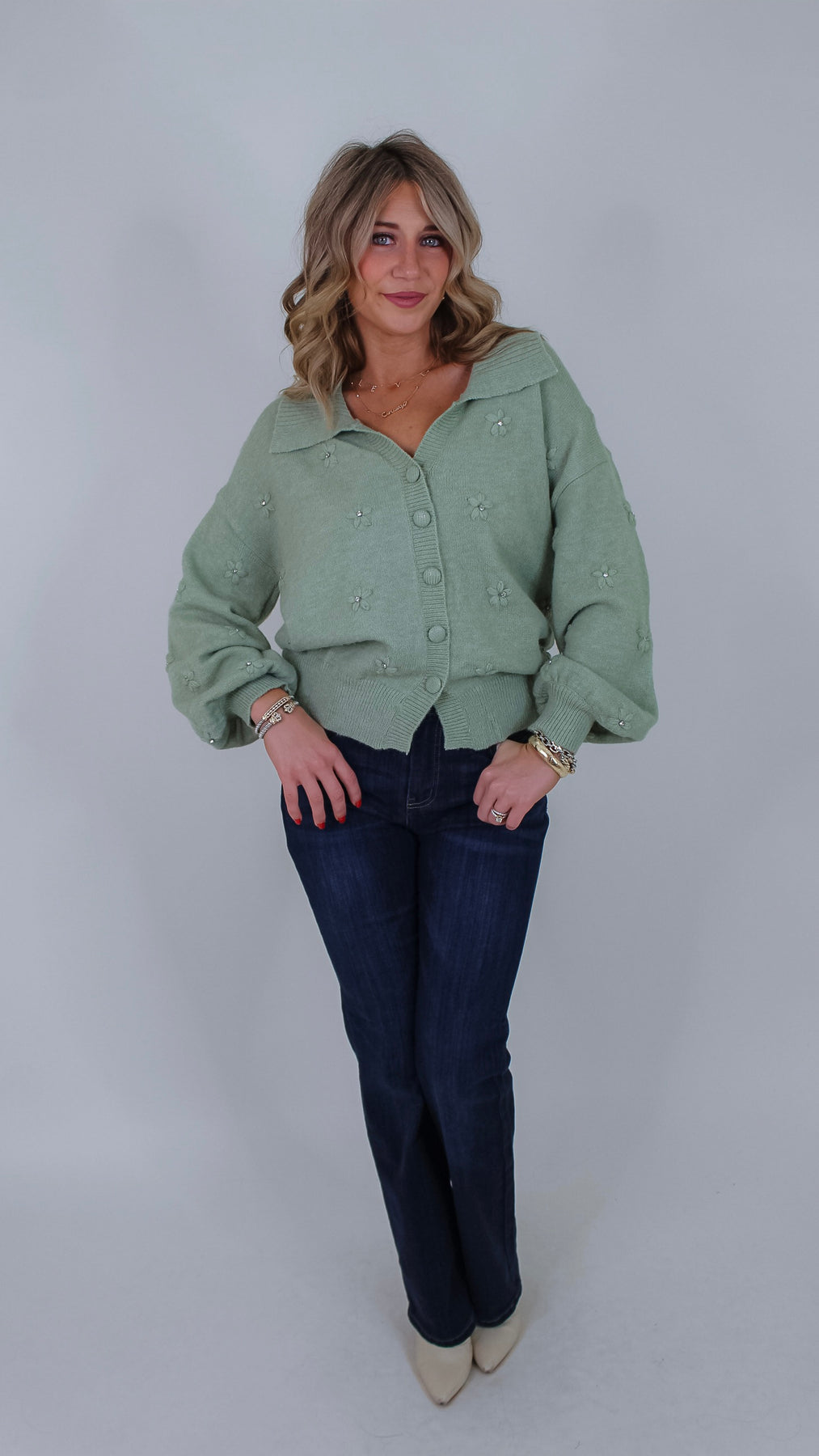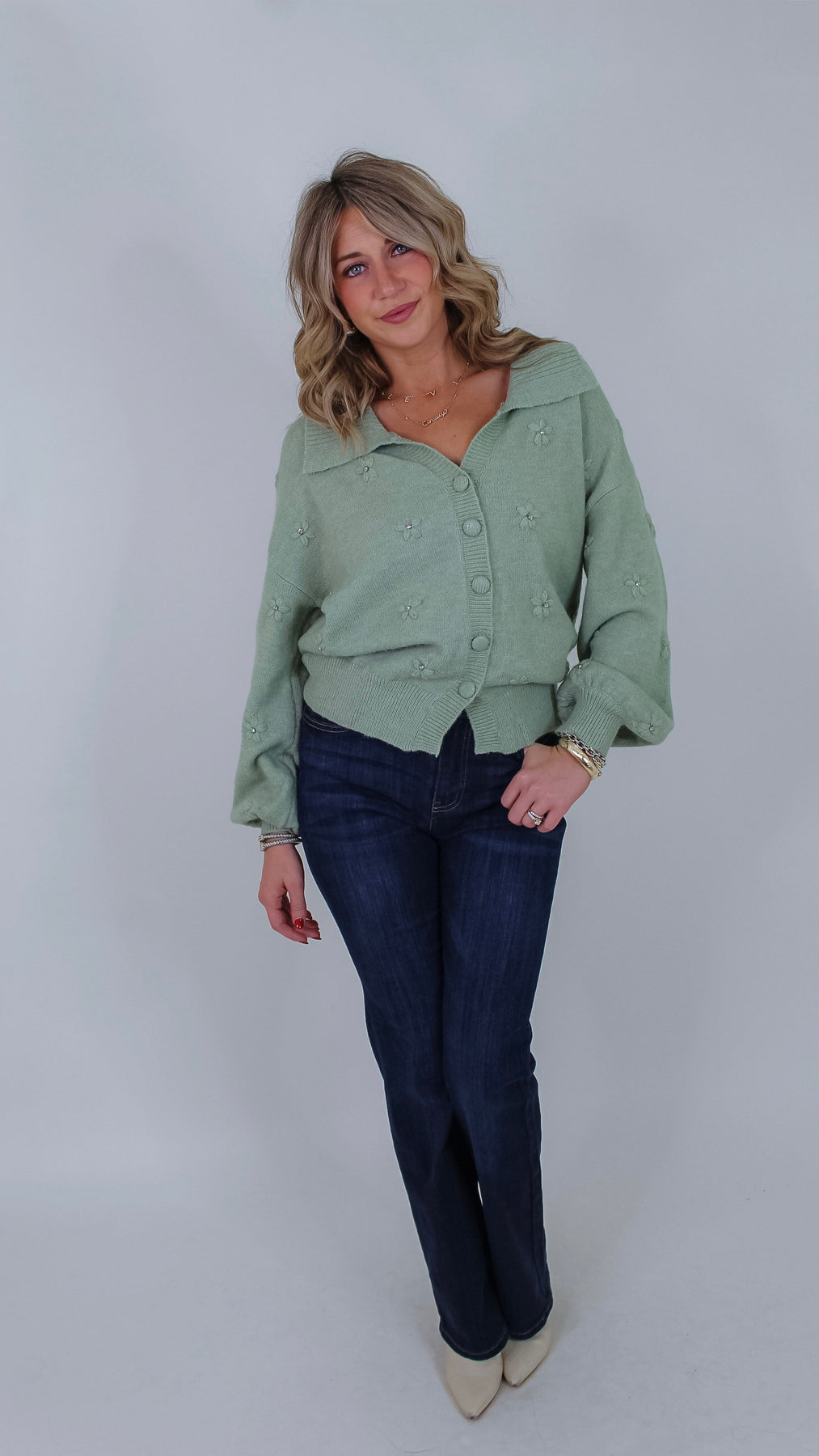 Add a touch of whimsy to your wardrobe with the Toni Sage Floral Cardigan. This charming button-up piece features a soft sage hue, a classic collar, and delightful 3D flower rhinestone details that catch the light with every move. Perfect for layering, it brings playful elegance to any outfit, whether you’re dressing up or keeping it casual. Embrace cozy style with a sparkling twist!