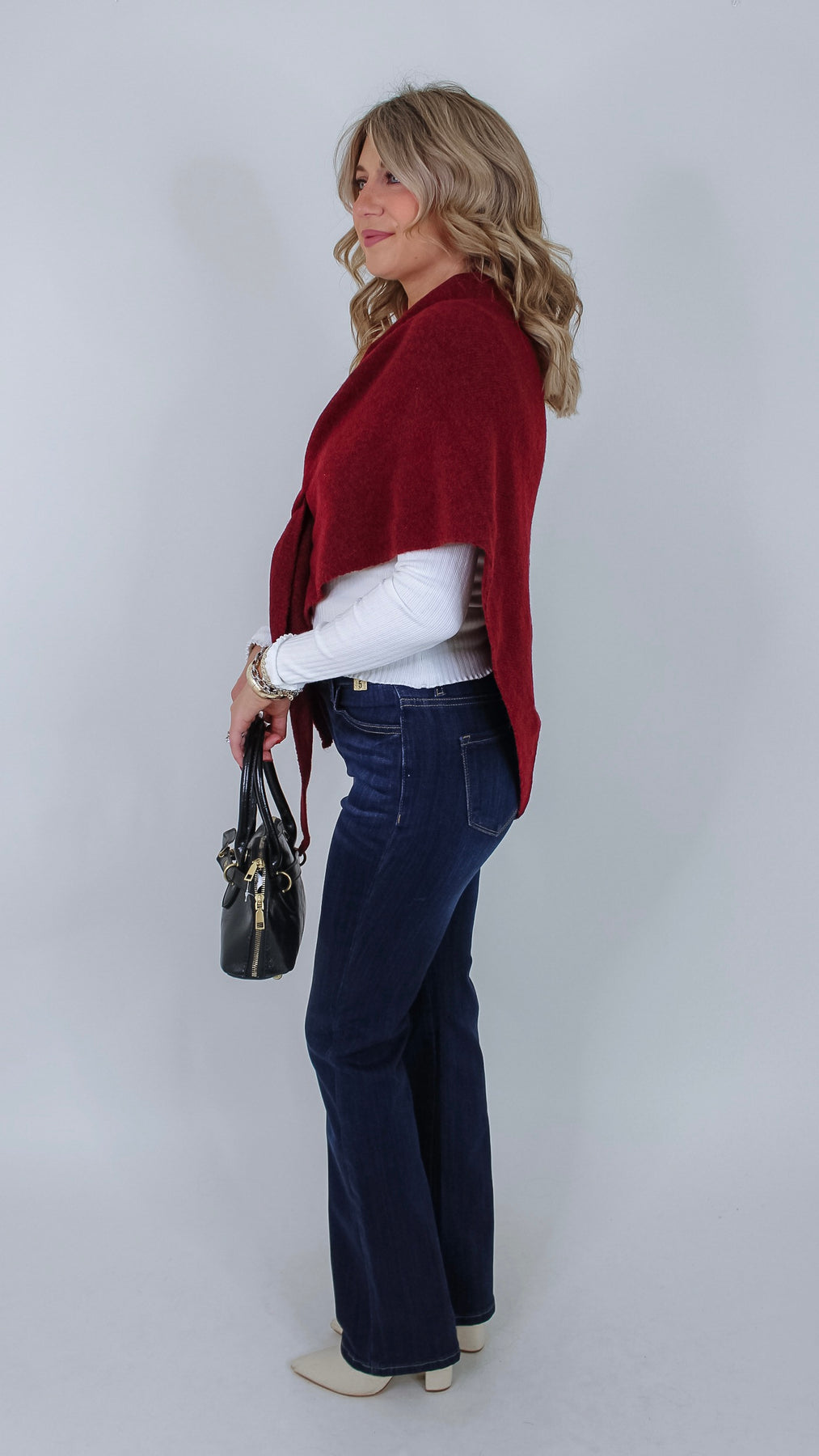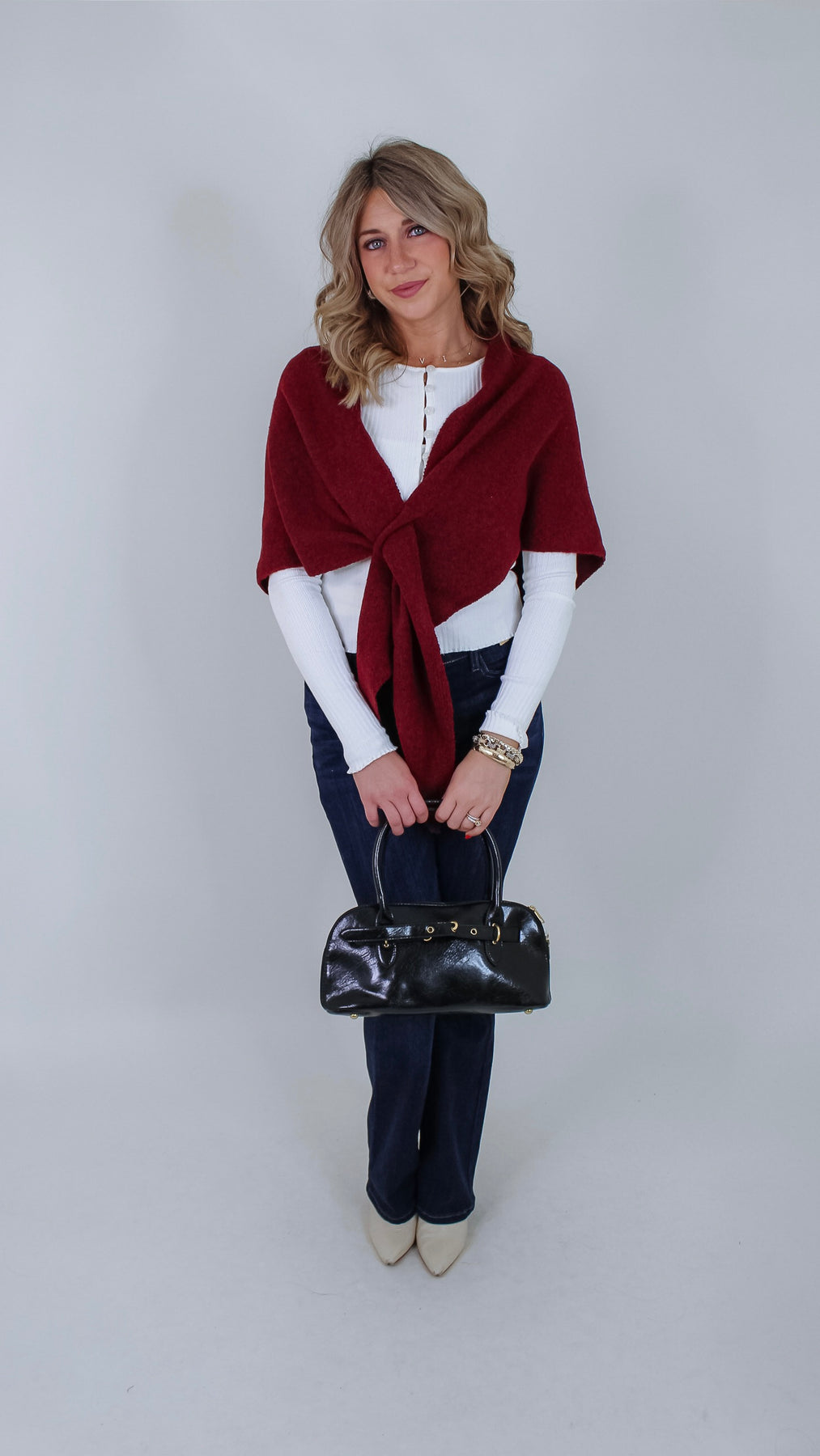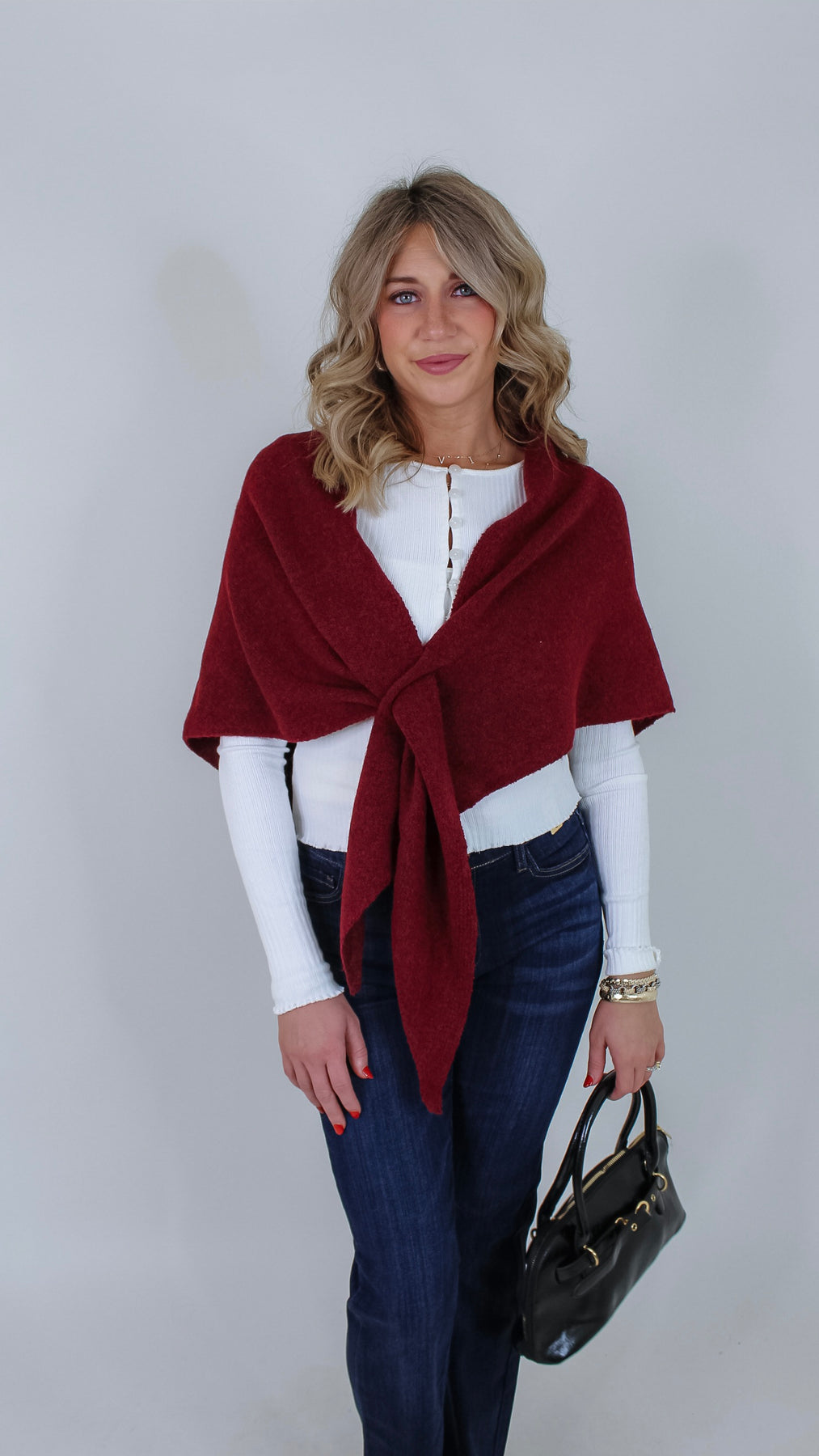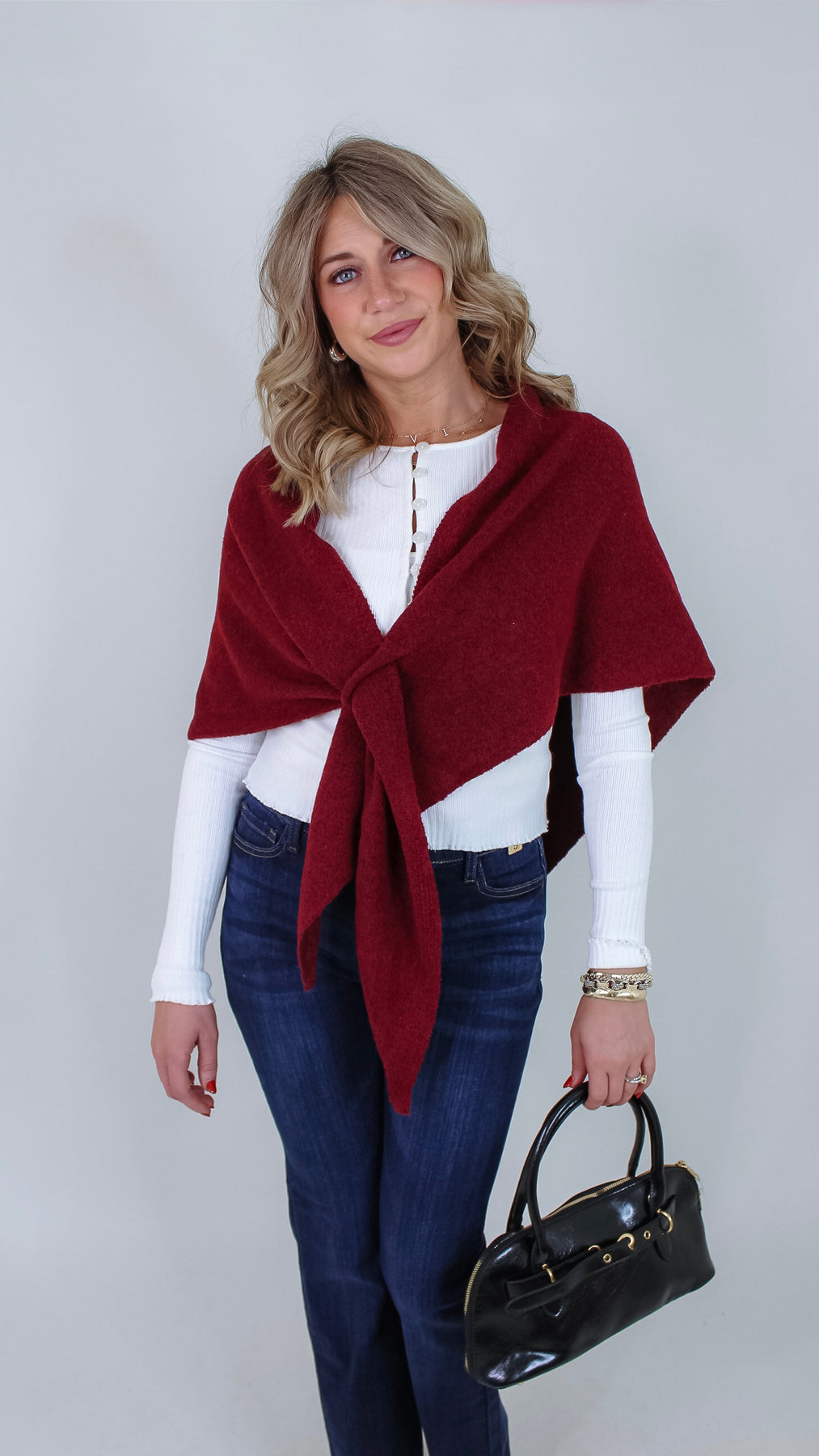 Wrap yourself in cozy charm with this Triangle Knit Scarf Shawl Cape in rich burgundy. Its unique triangle shape and easy tie-through design let you style it your way—draped over your shoulders over a dress for a fancy evening out or layered over top for the perfect cozy look. Perfect for adding a pop of color and warmth to any outfit, this playful accessory keeps you comfy while turning heads.