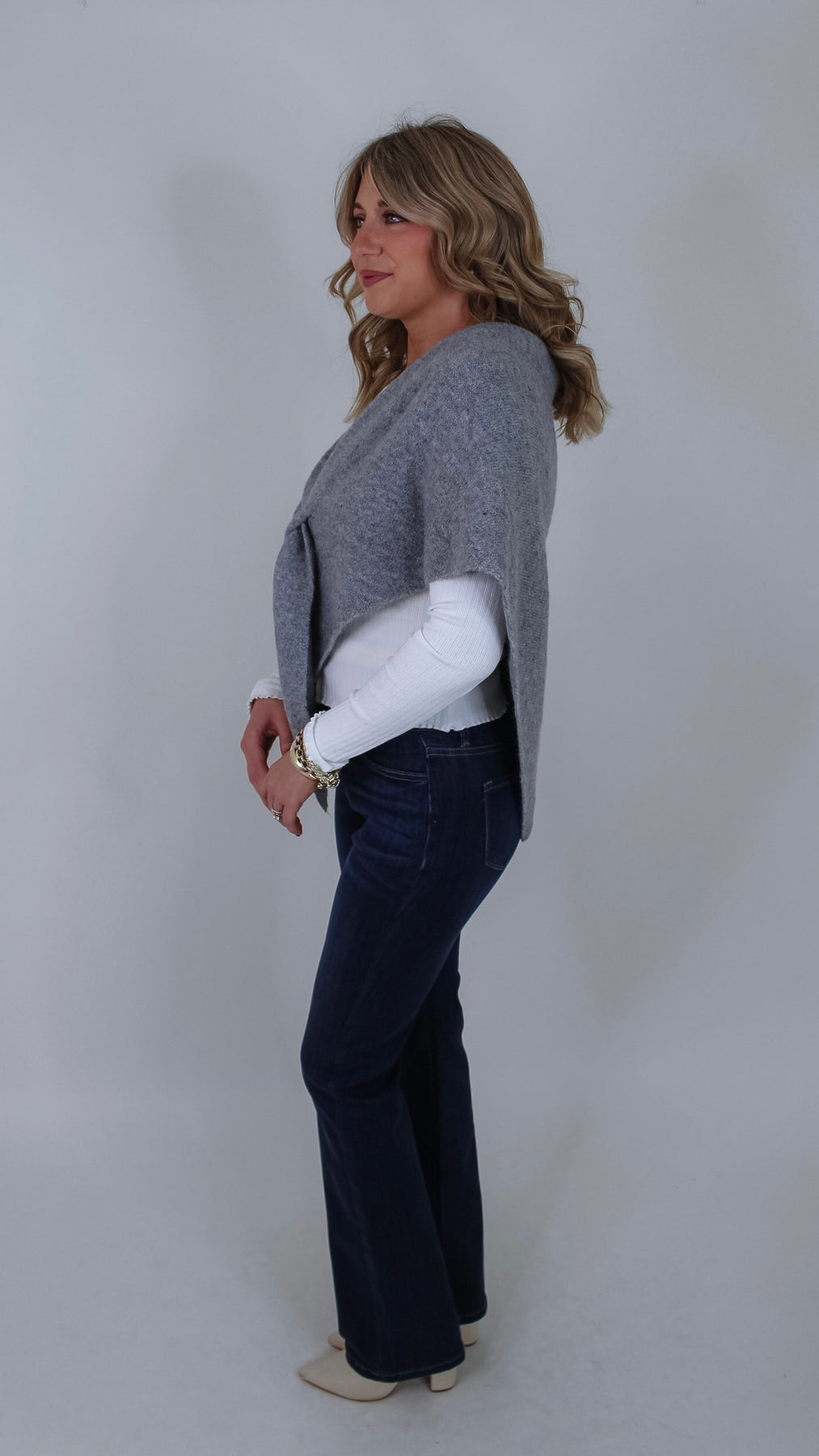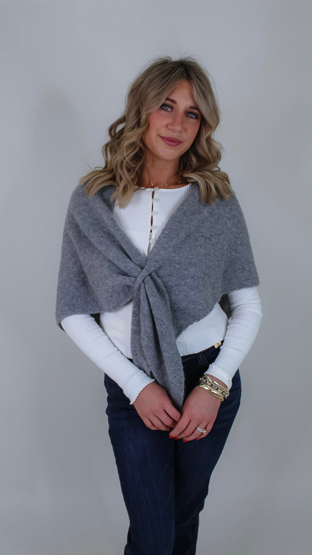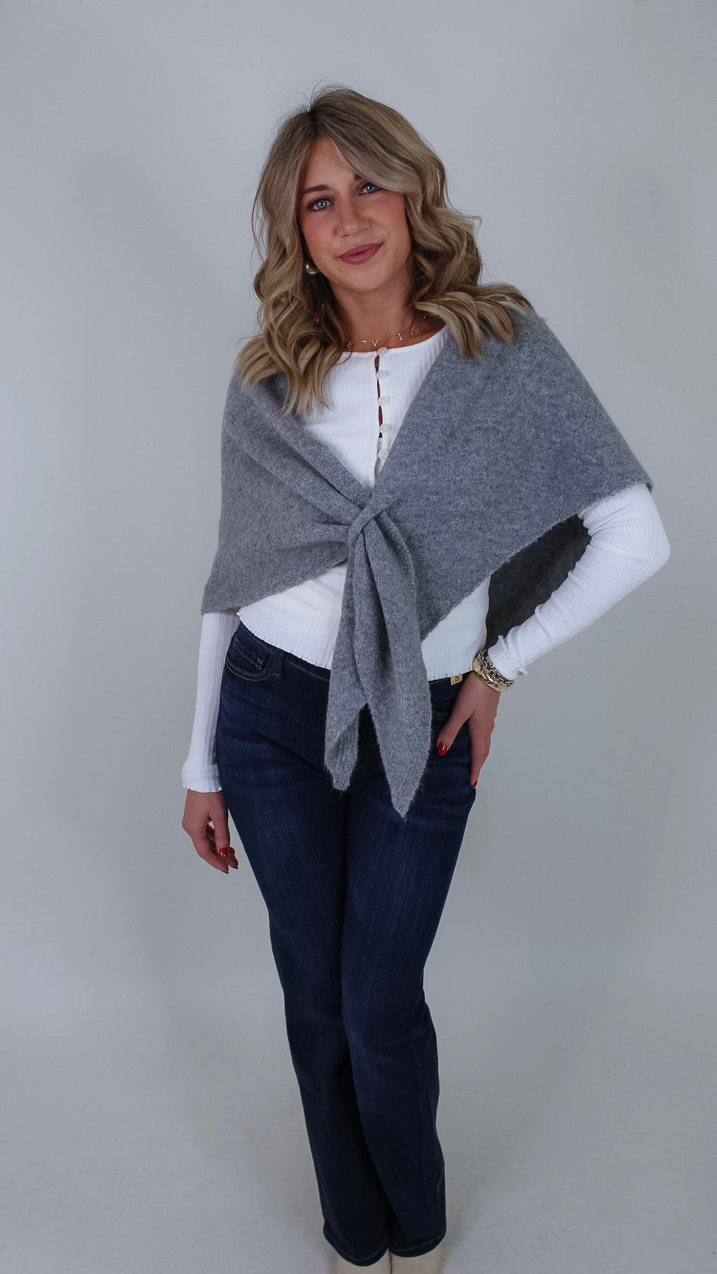 Wrap yourself in cozy charm with this Triangle Knit Scarf Shawl Cape in grey. Its unique triangle shape and easy tie-through design let you style it your way—draped over your shoulders over a dress for a fancy evening out or layered over top for the perfect cozy look. Perfect for addition of style and warmth to any outfit, this playful accessory keeps you comfy while turning heads.