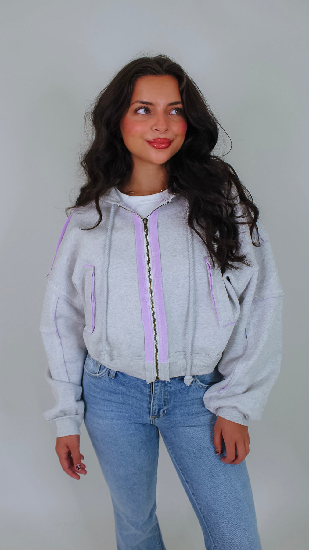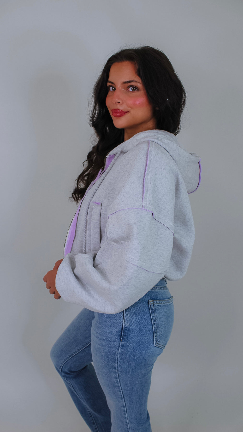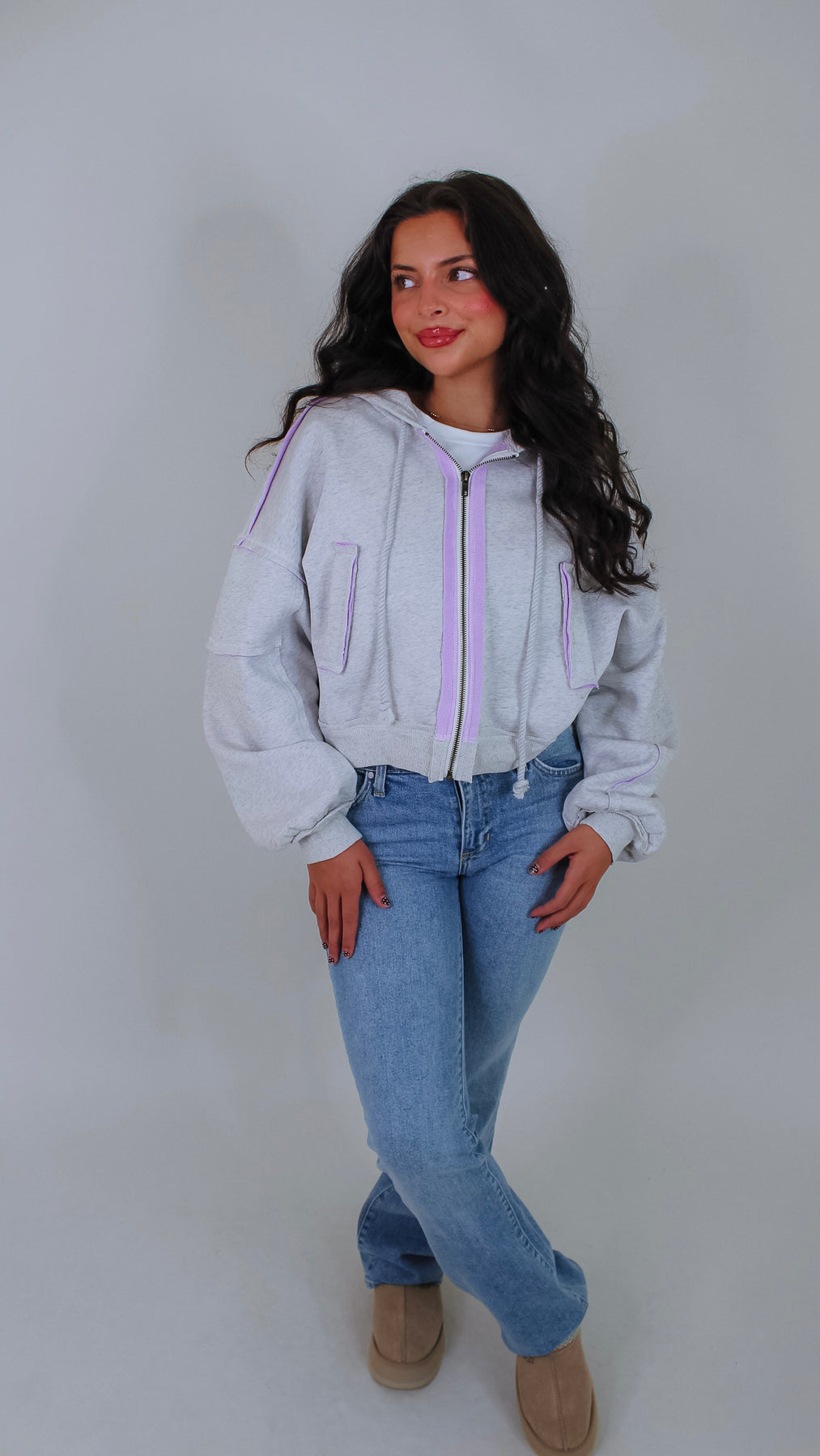 Stay cozy and stand out with the Harten Grey Zip Up Hoodie, featuring fun purple seam details that add a pop of color to your casual look. Perfect for layering or lounging, this hoodie brings comfort and personality together effortlessly.