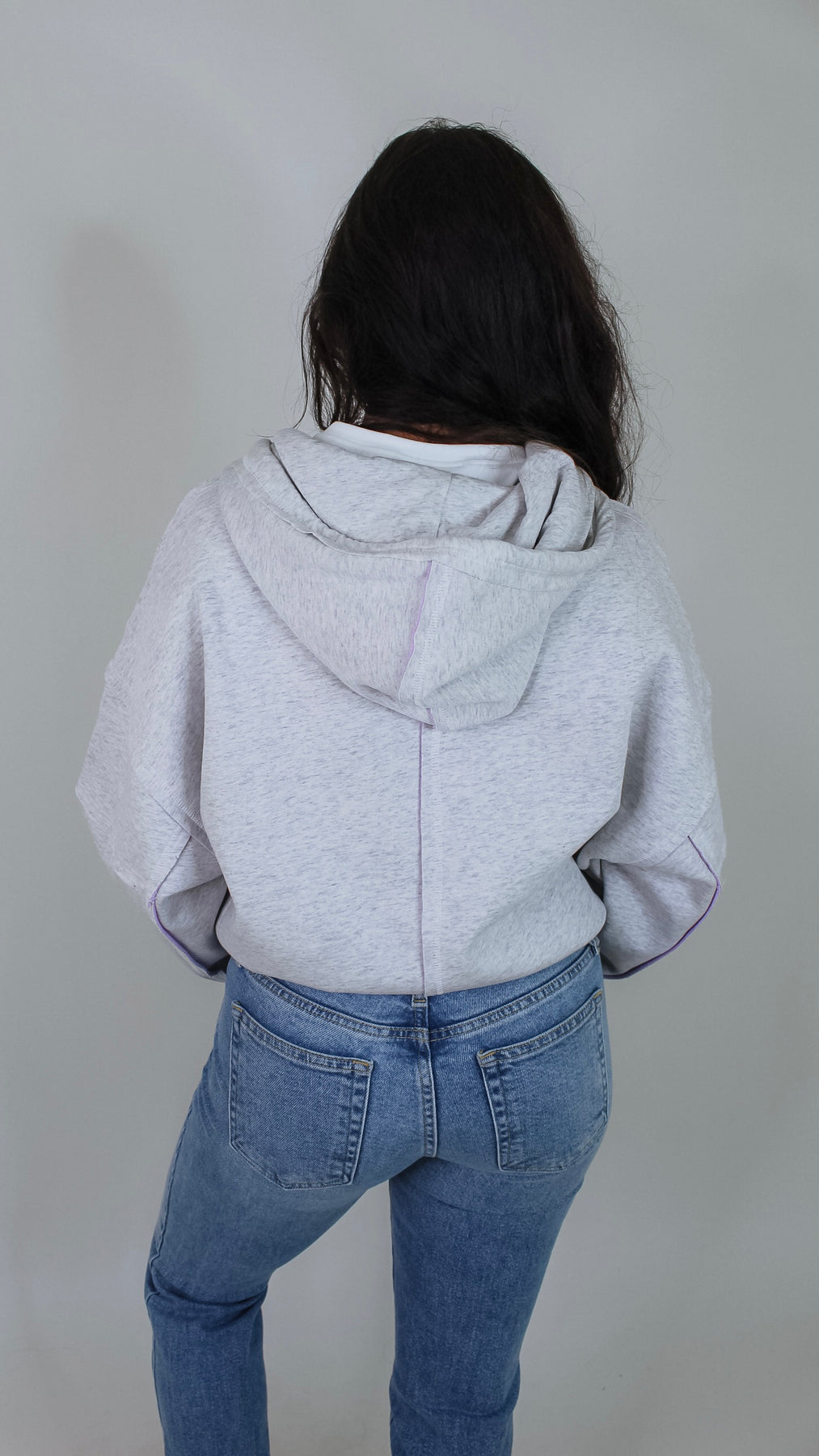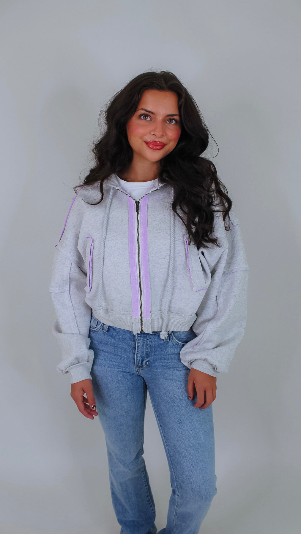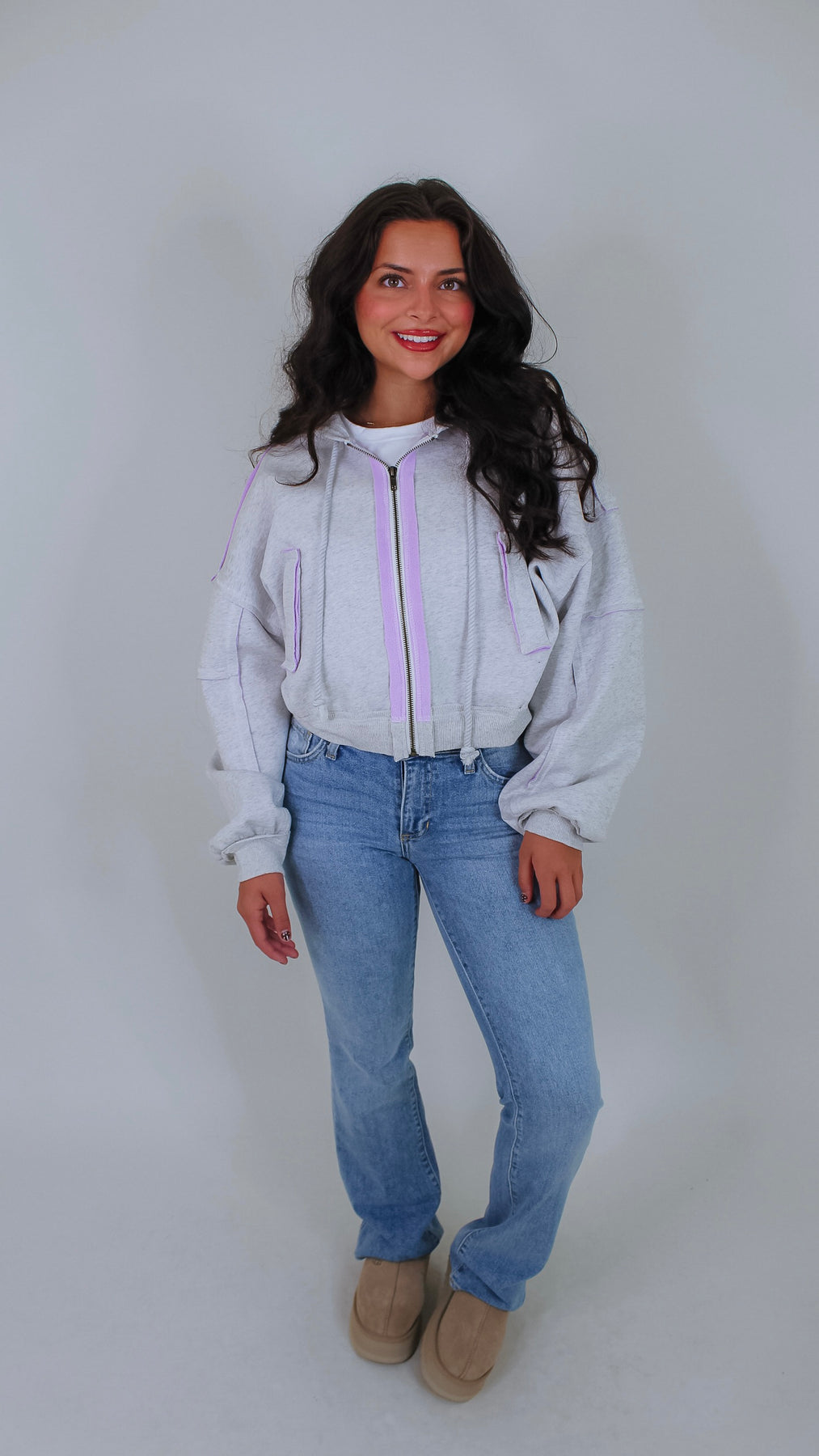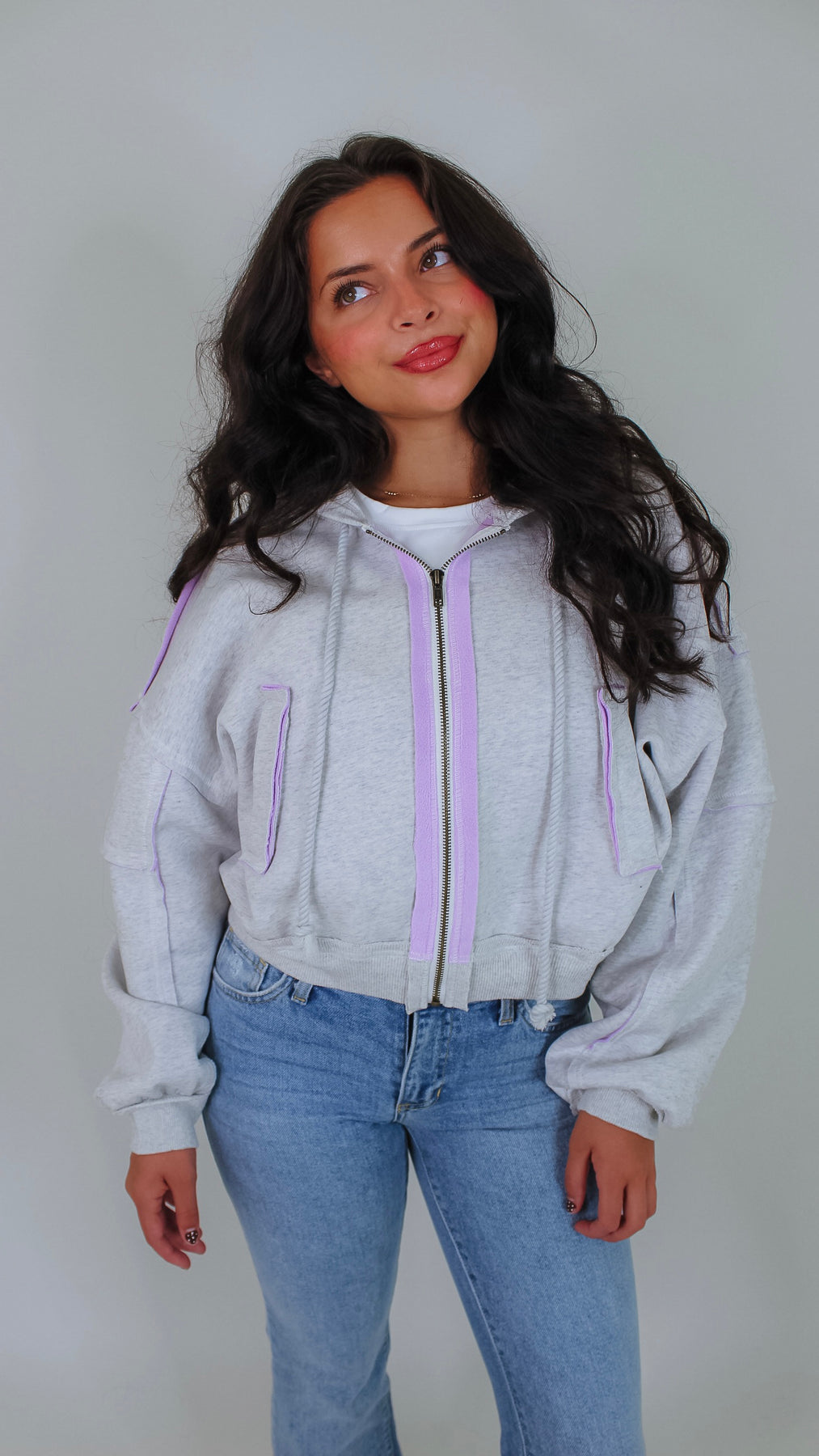 Stay cozy and stand out with the Harten Grey Zip Up Hoodie, featuring fun purple seam details that add a pop of color to your casual look. Perfect for layering or lounging, this hoodie brings comfort and personality together effortlessly.