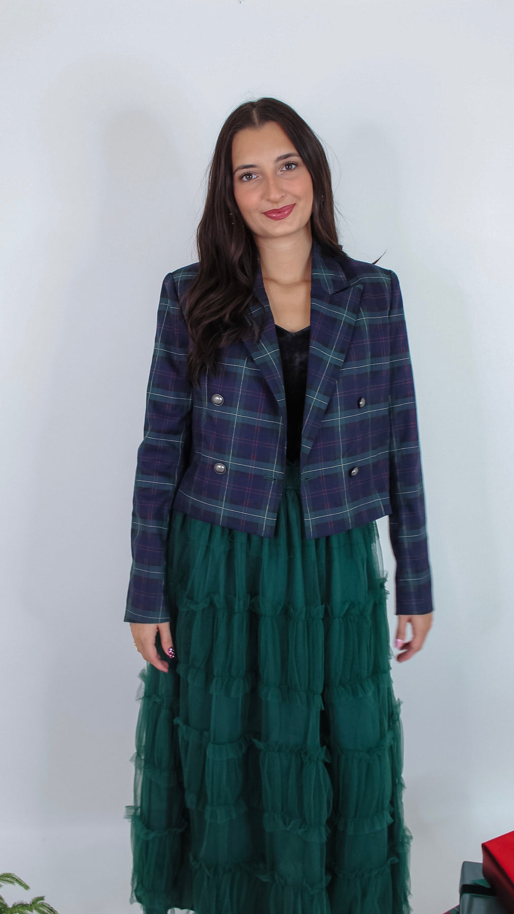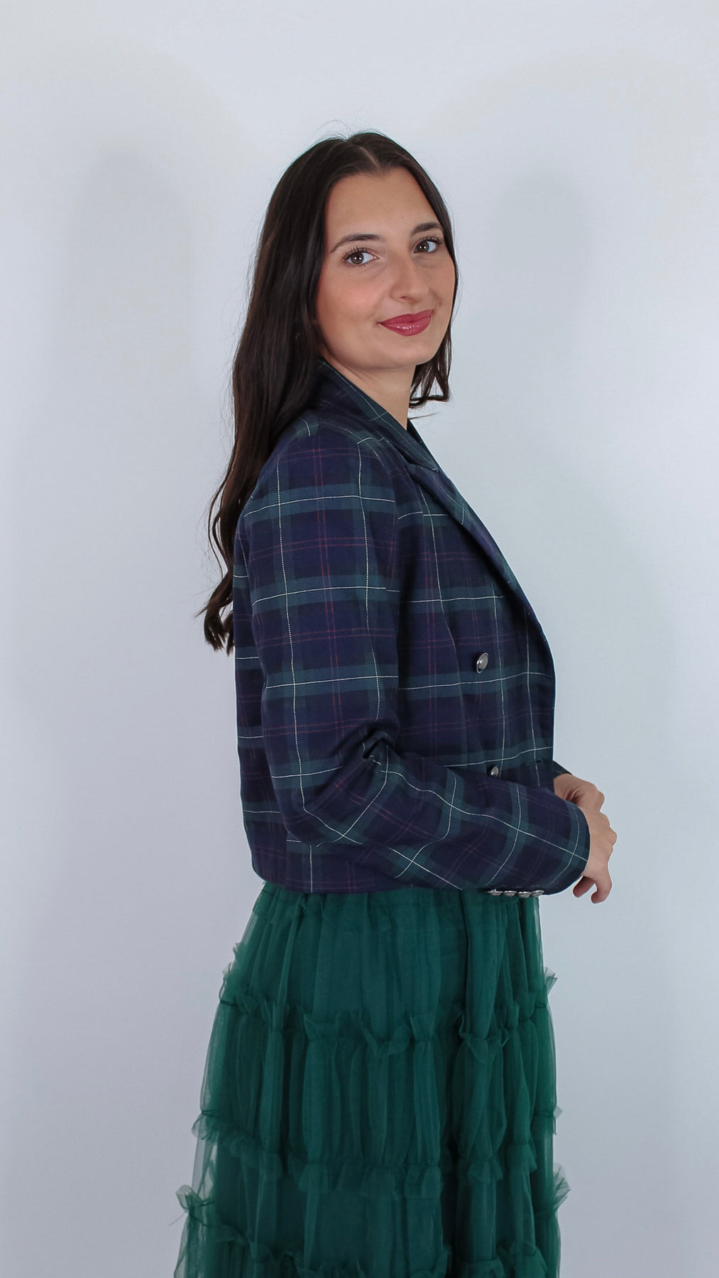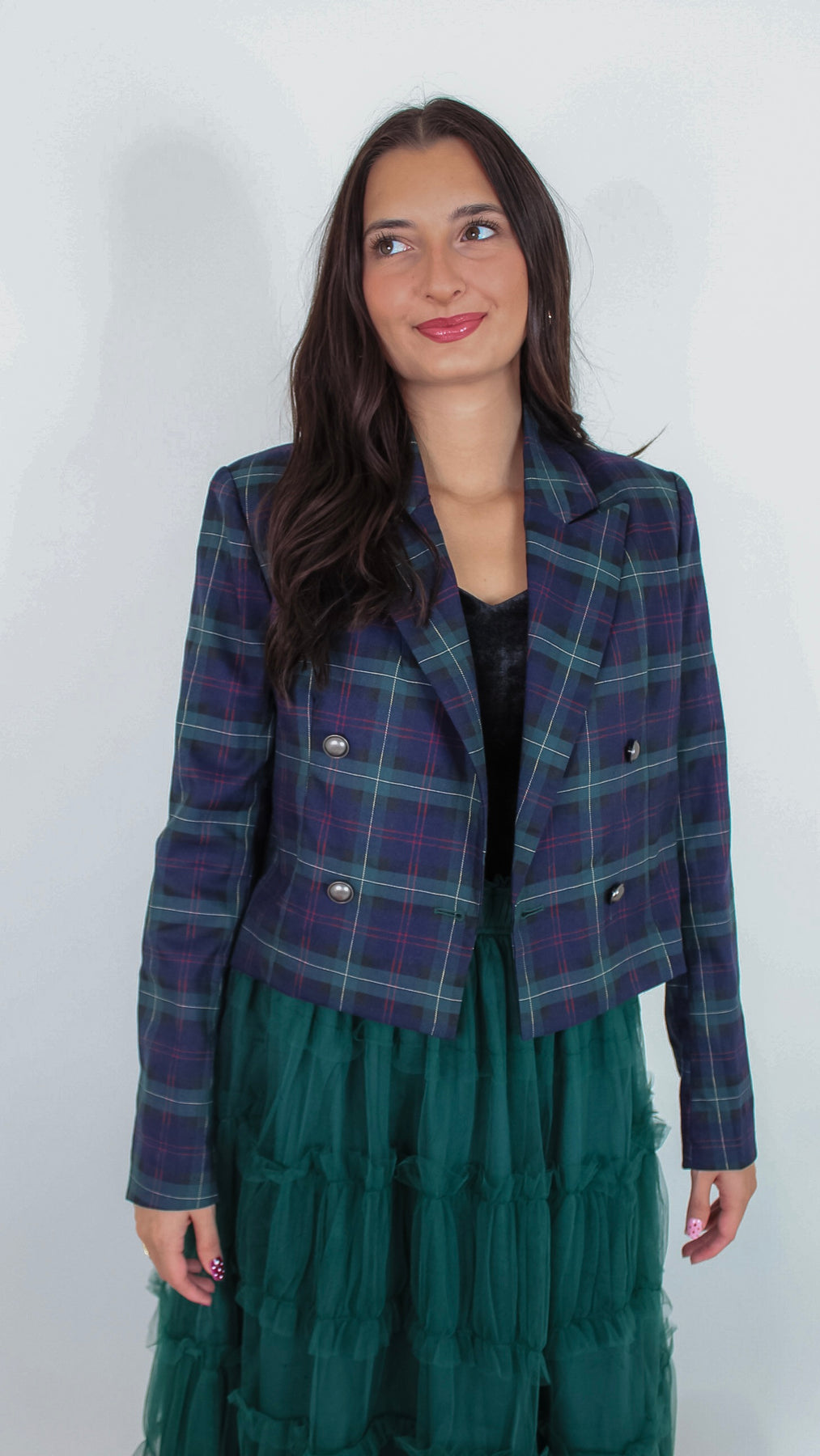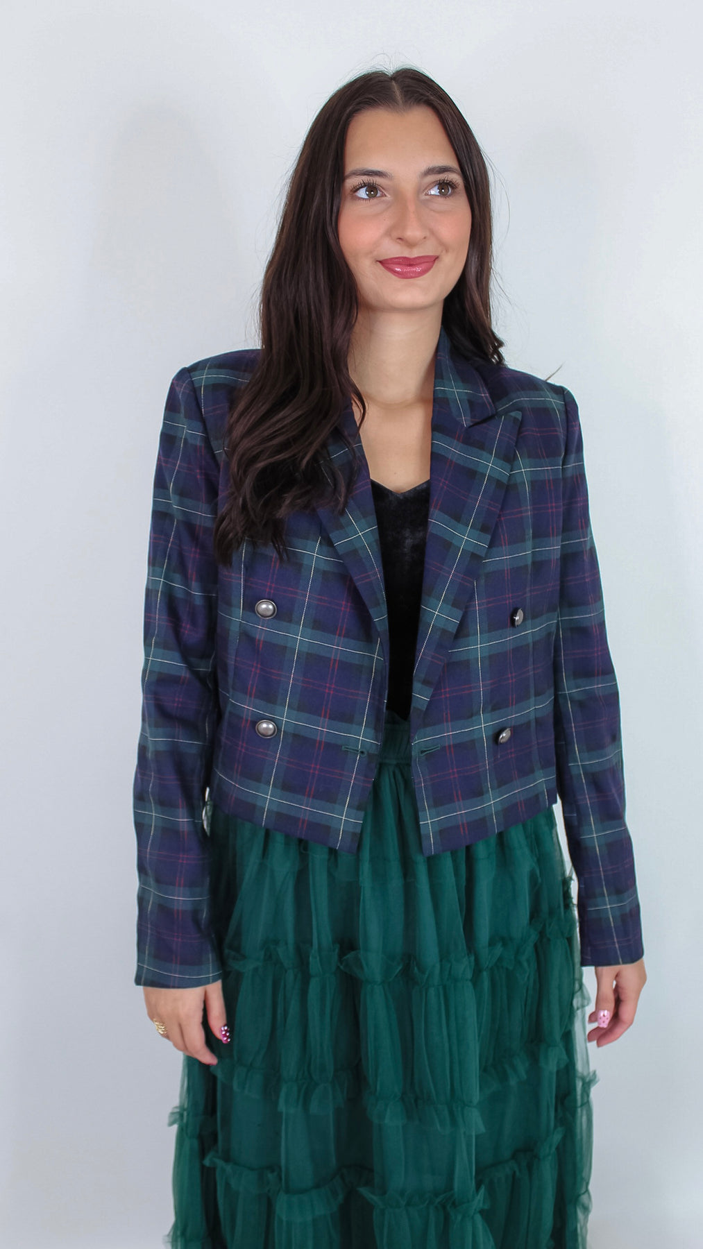 Elevate your wardrobe with the Kacie Plaid Blazer, designed to make a statement. This navy plaid cropped blazer effortlessly combines timeless pattern with a modern silhouette, giving you a polished yet edgy look. Perfect for dressing up or adding a stylish touch to casual outfits, it’s the versatile piece you need to stand out with confidence.