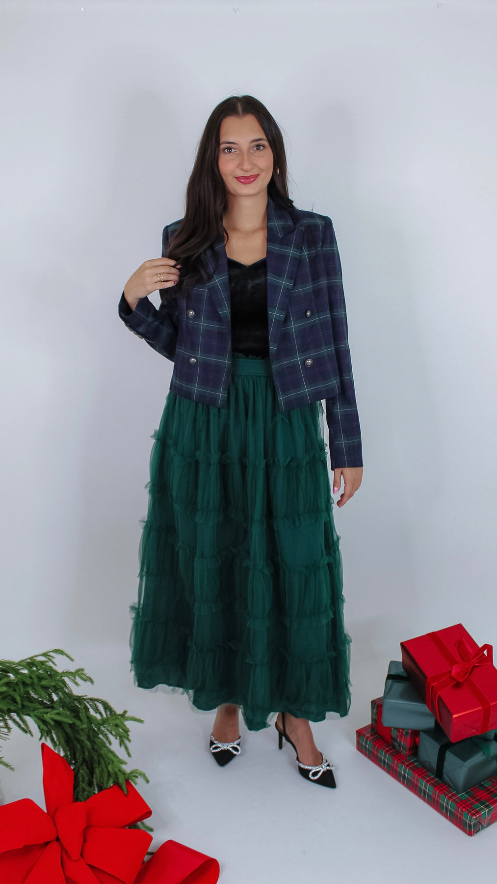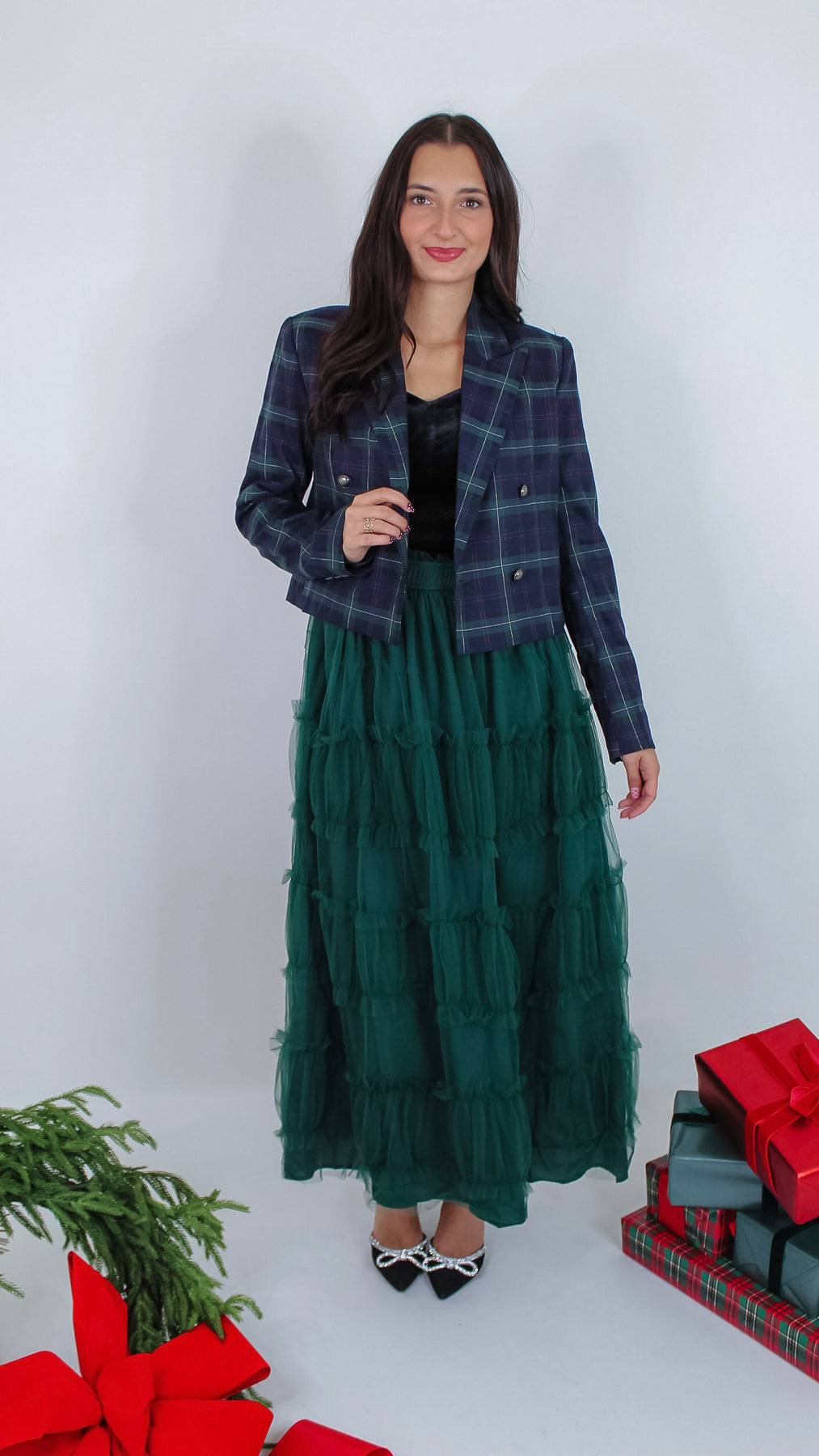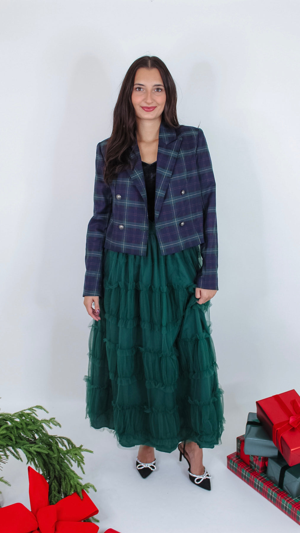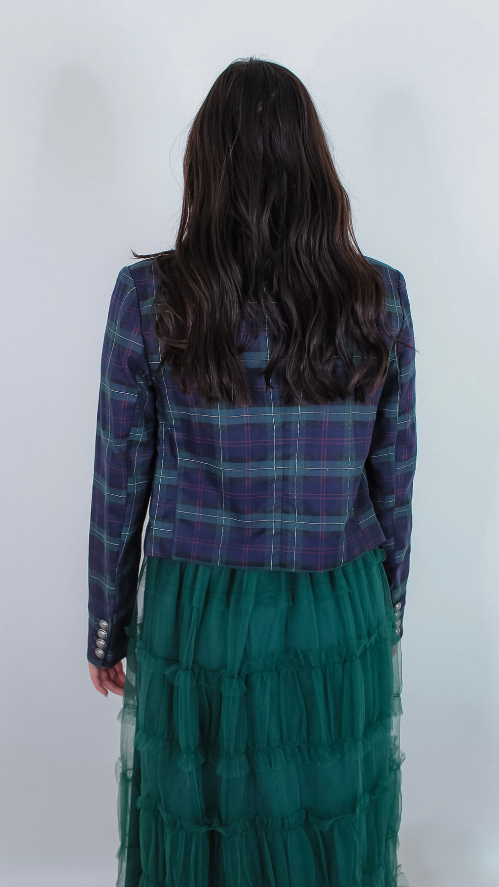 Elevate your wardrobe with the Kacie Plaid Blazer, designed to make a statement. This navy plaid cropped blazer effortlessly combines timeless pattern with a modern silhouette, giving you a polished yet edgy look. Perfect for dressing up or adding a stylish touch to casual outfits, it’s the versatile piece you need to stand out with confidence.