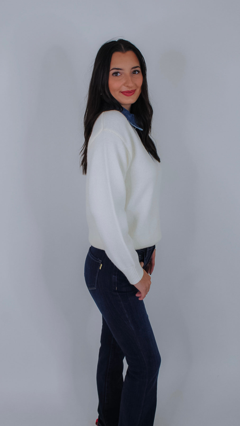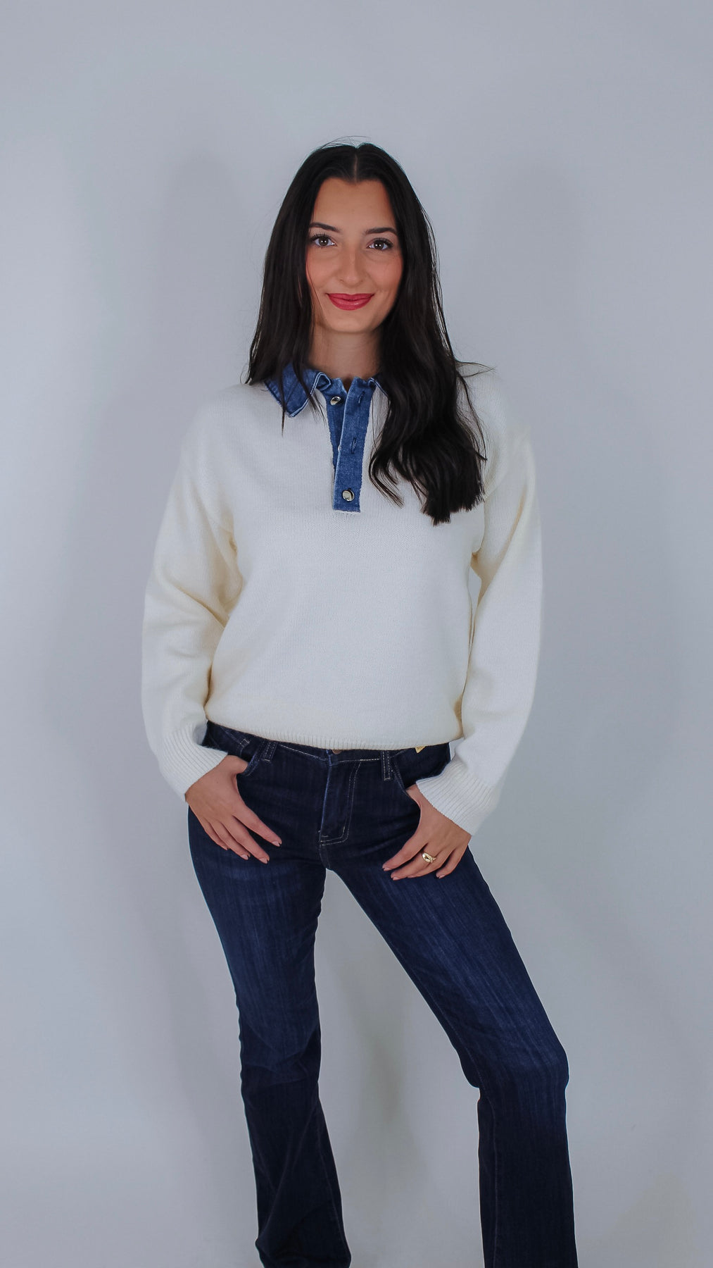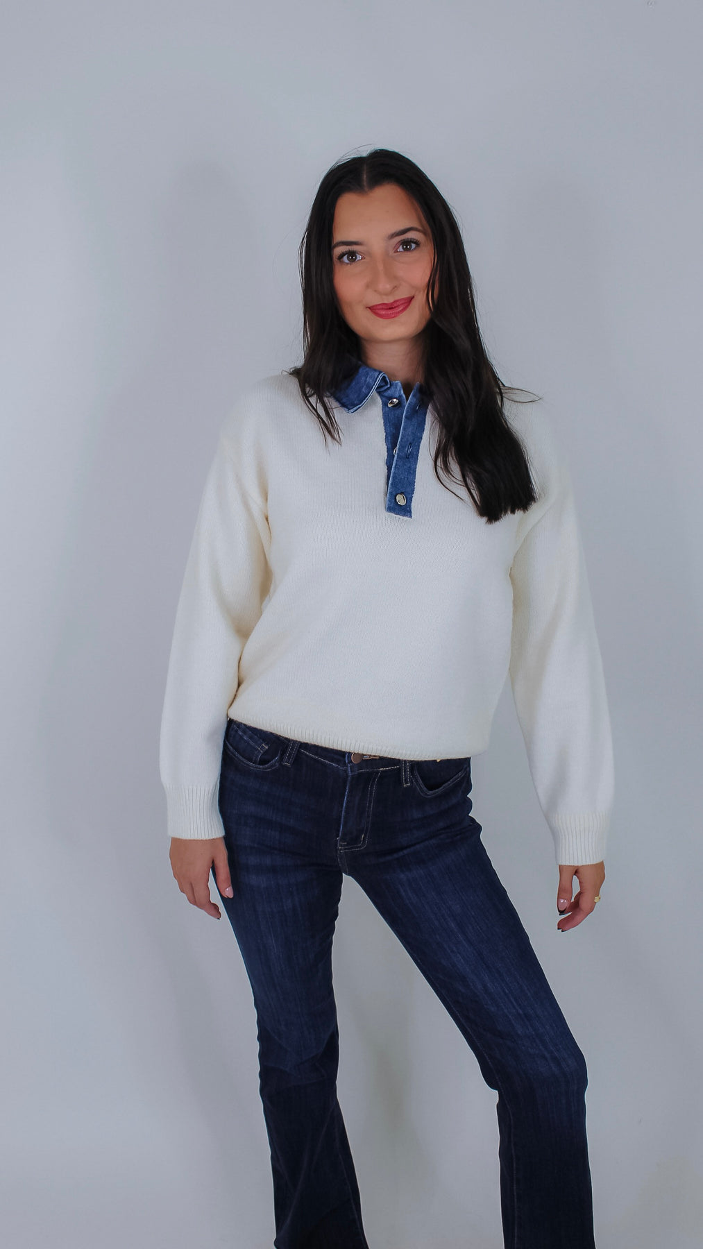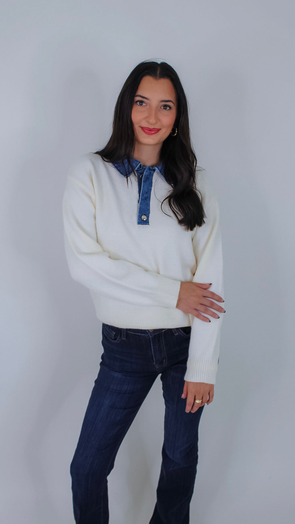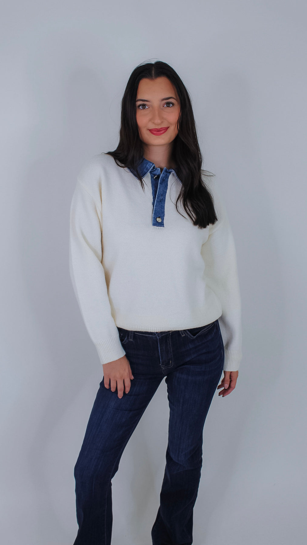Cozy meets cool with the Clara Ivory Sweater featuring a chic denim collar twist. This playful combo adds a fresh edge to your classic ivory knit, keeping you comfy and stylish from brunch dates to casual office days. Effortlessly mix and match while staying snug all season long!