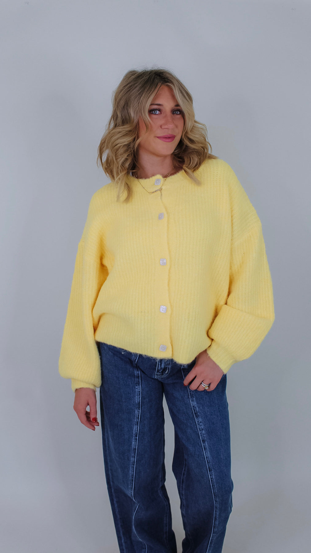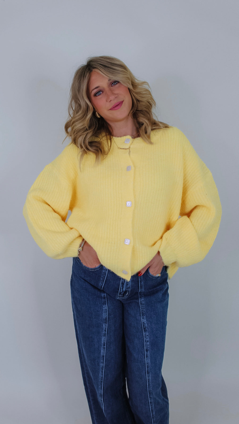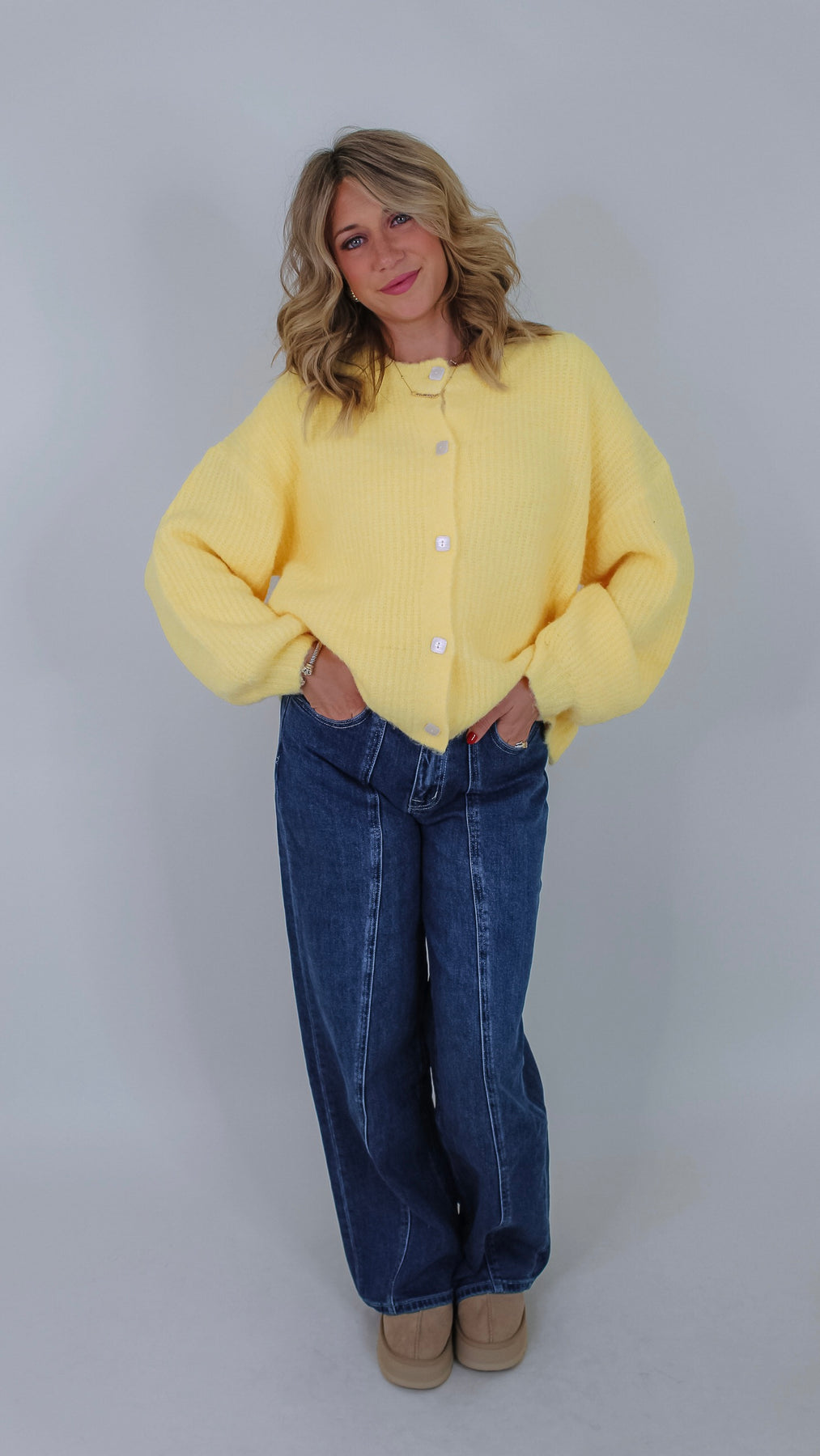 Brighten your cozy days with the Dean Butter Cardigan! This playful butter yellow sweater adds a splash of sunshine to any outfit while keeping you comfortably warm. Perfect for layering, its soft fabric invites you to stay snuggled up or step out in style with a cheerful pop of color.