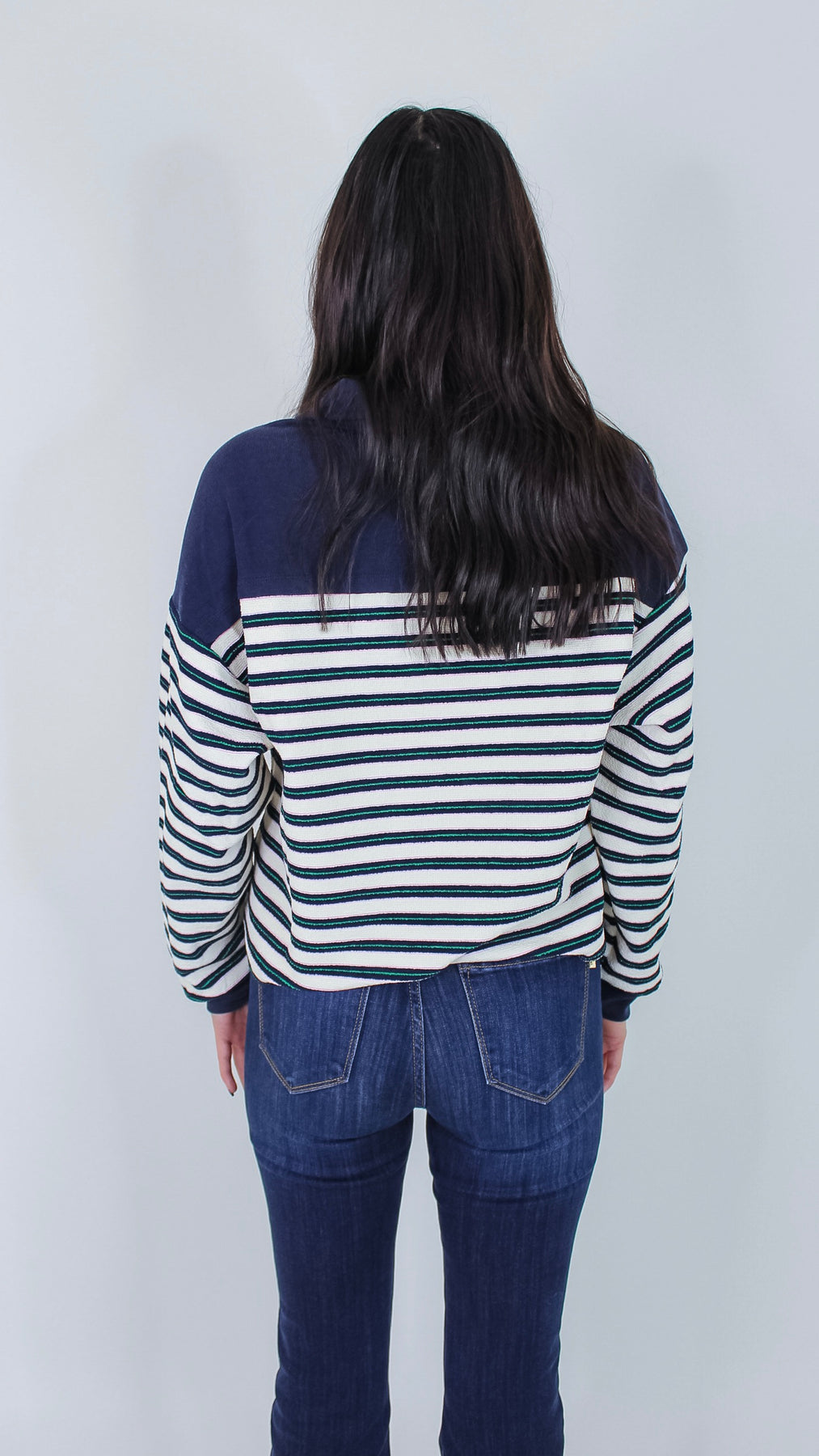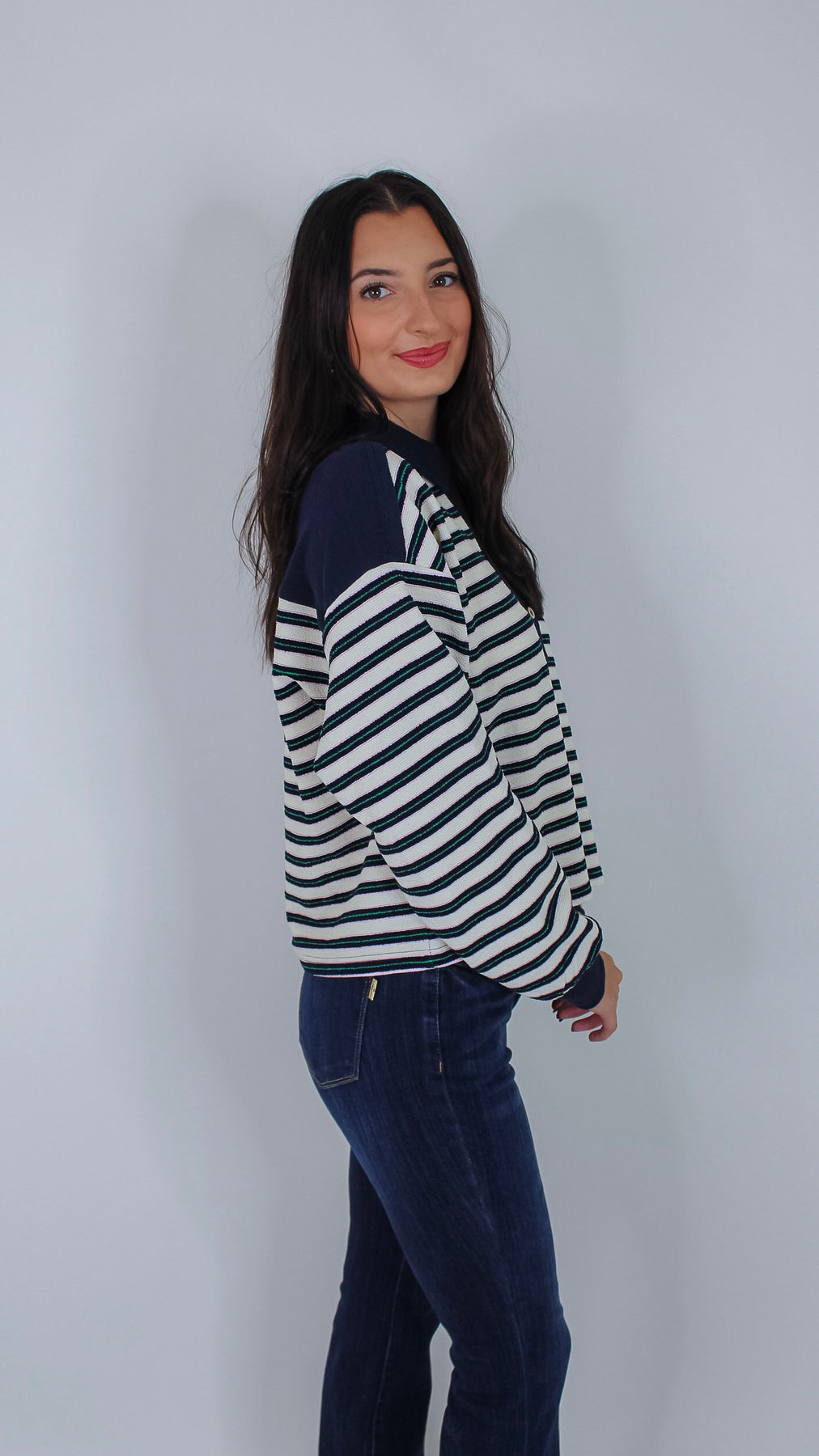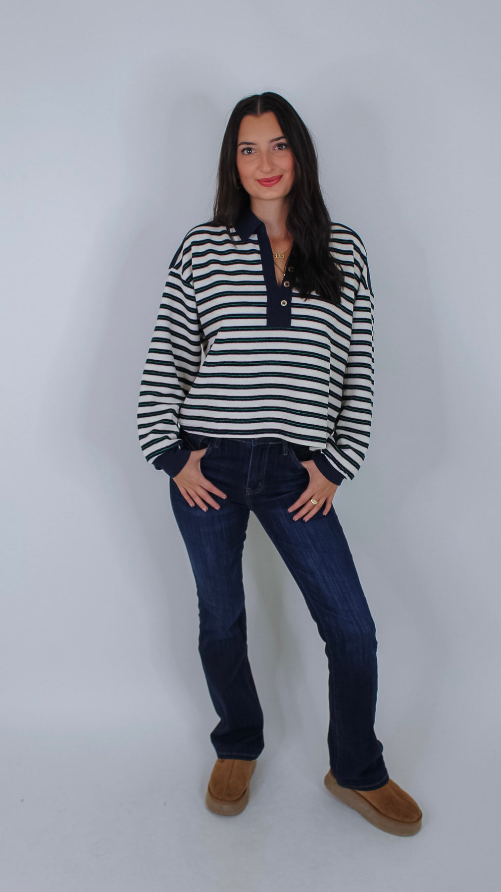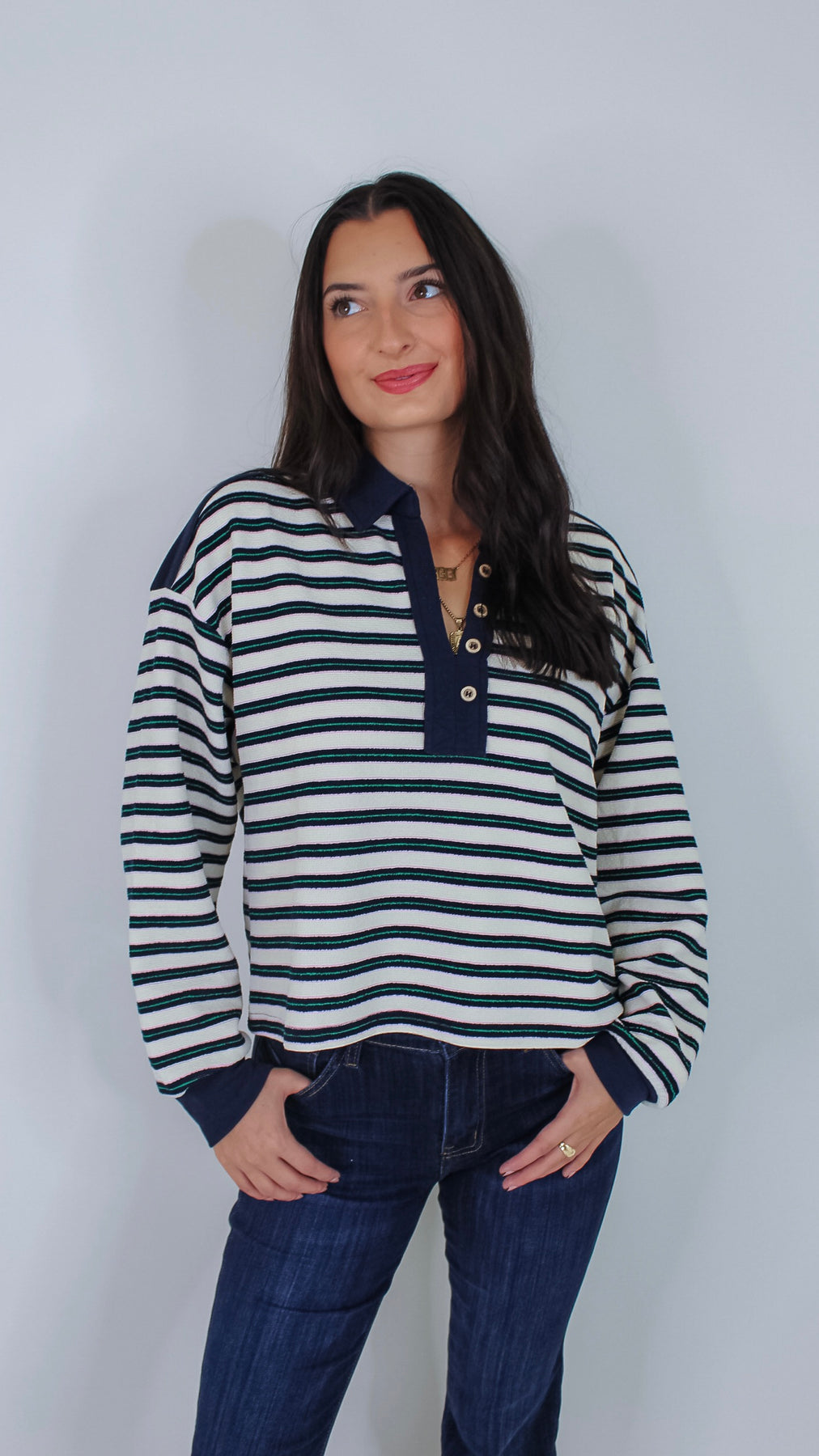 Add a splash of sporty charm with this Trinnie Navy Striped Varsity Top. Its classic navy stripes and crisp collar bring varsity vibes to your everyday look, perfect for playful layering or solo styling.