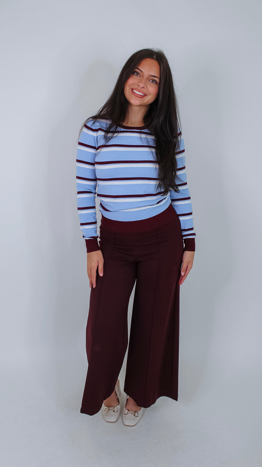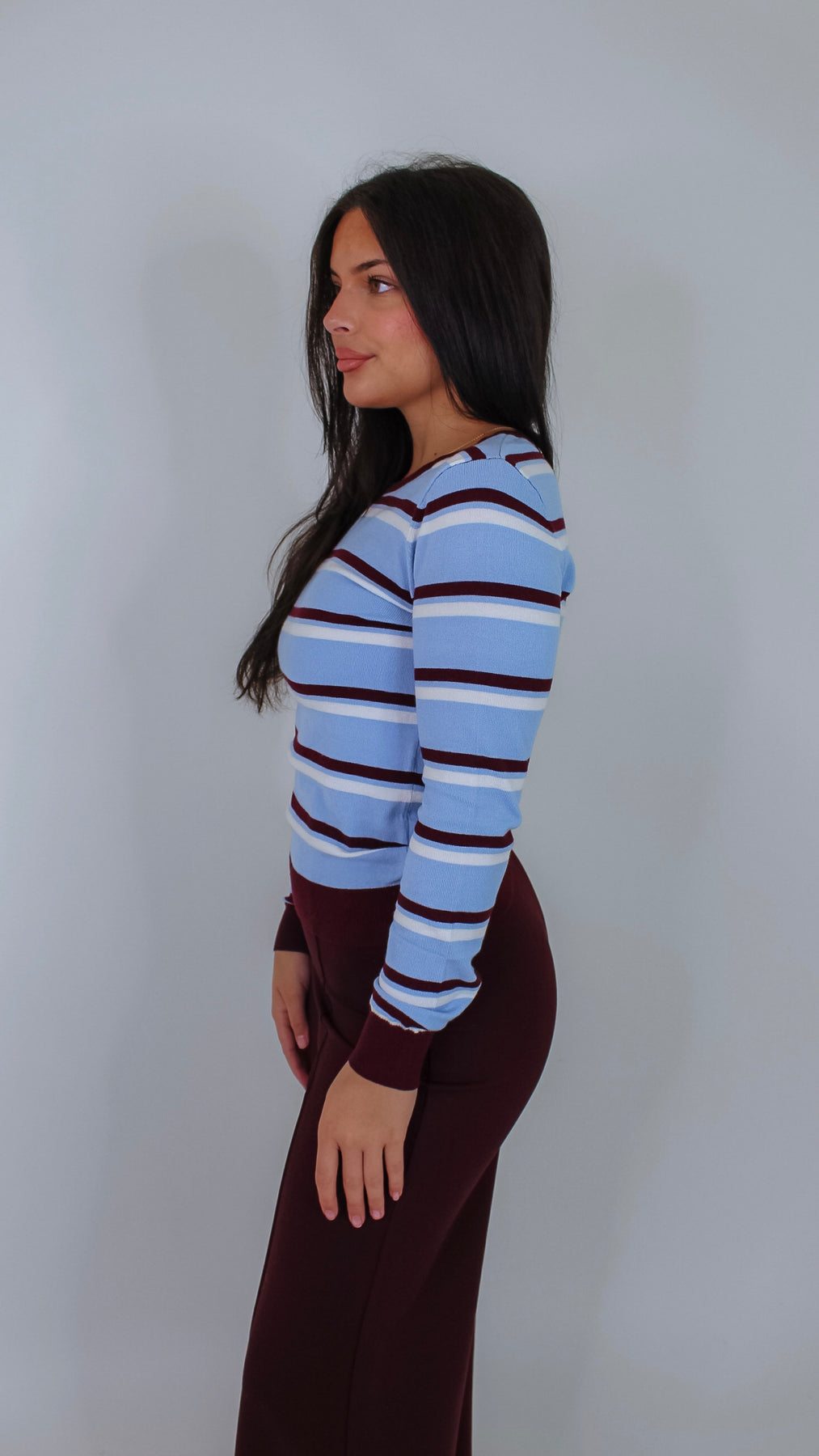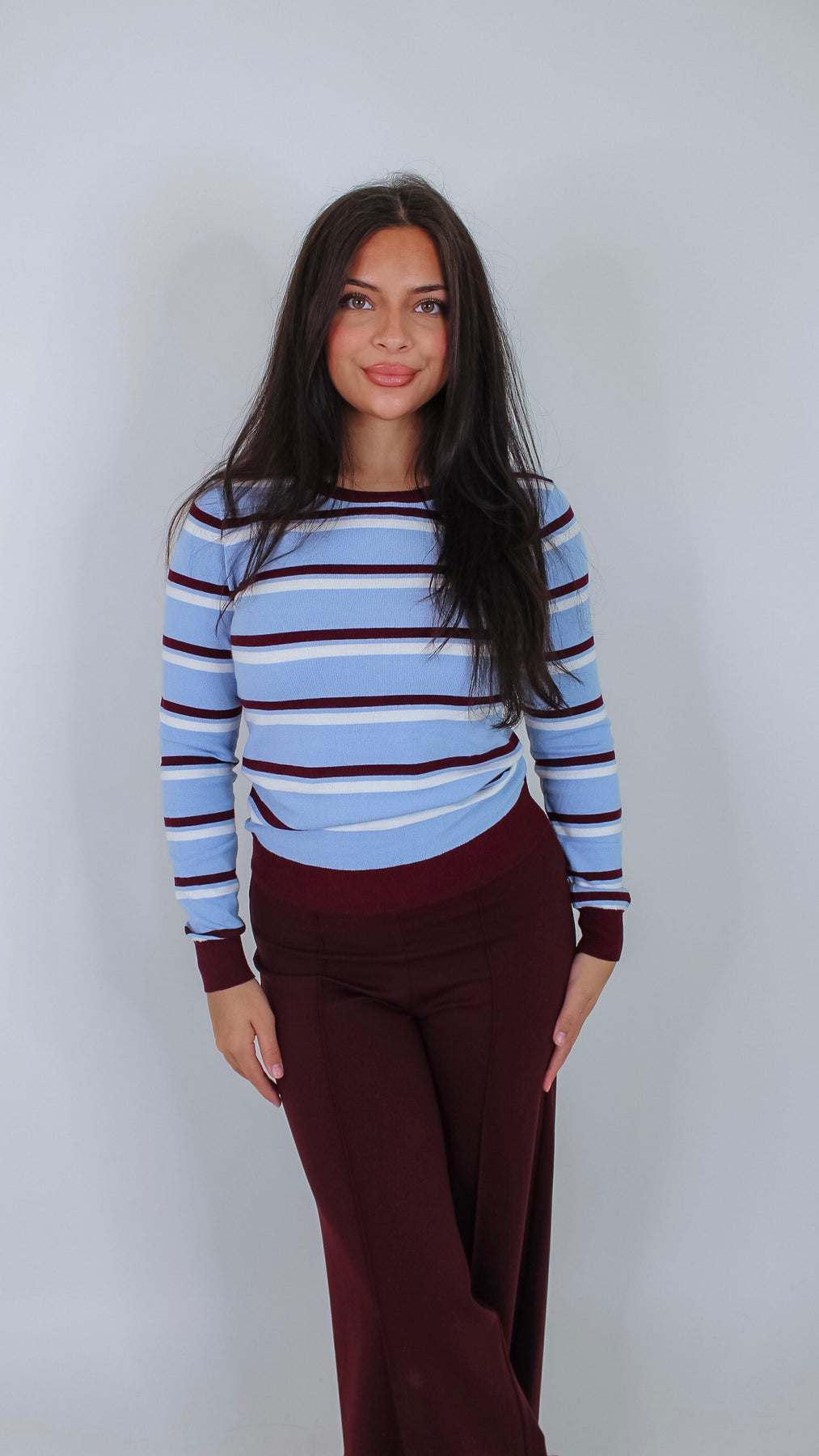Featuring a bold blue and maroon striped pattern, this long sleeve top is perfect for layering or wearing solo. The classic color combo works with everything in your closet, making it an easy go-to for casual days and cozy nights.