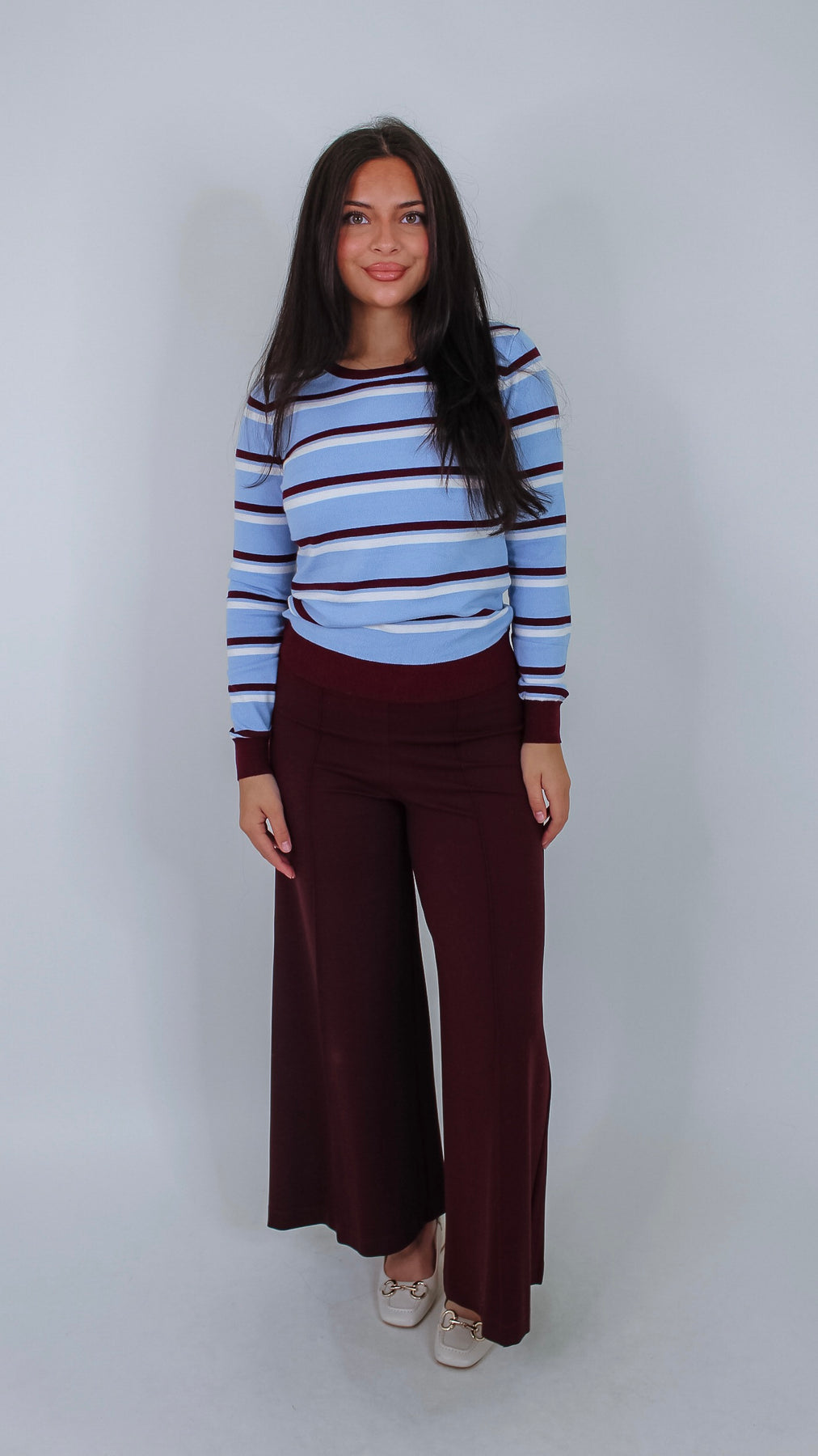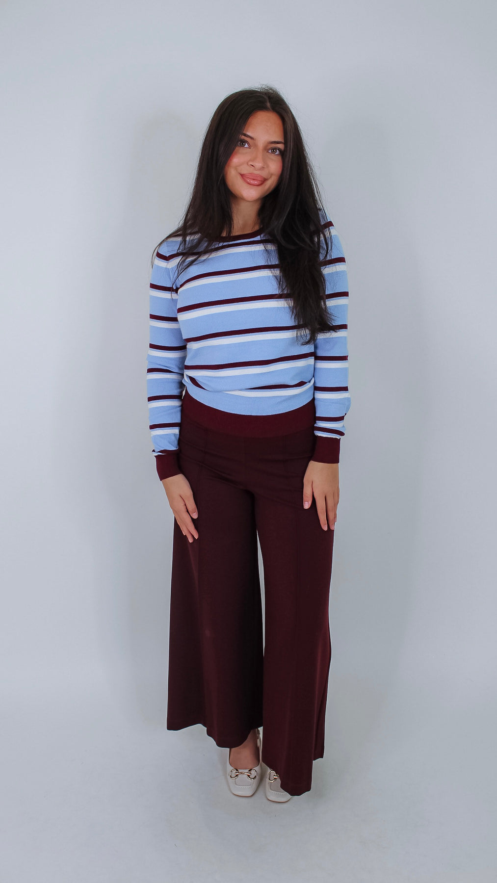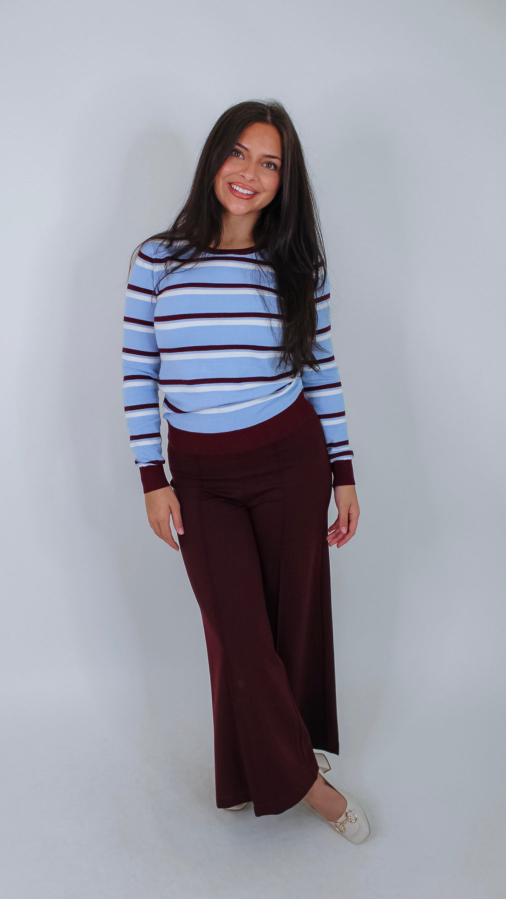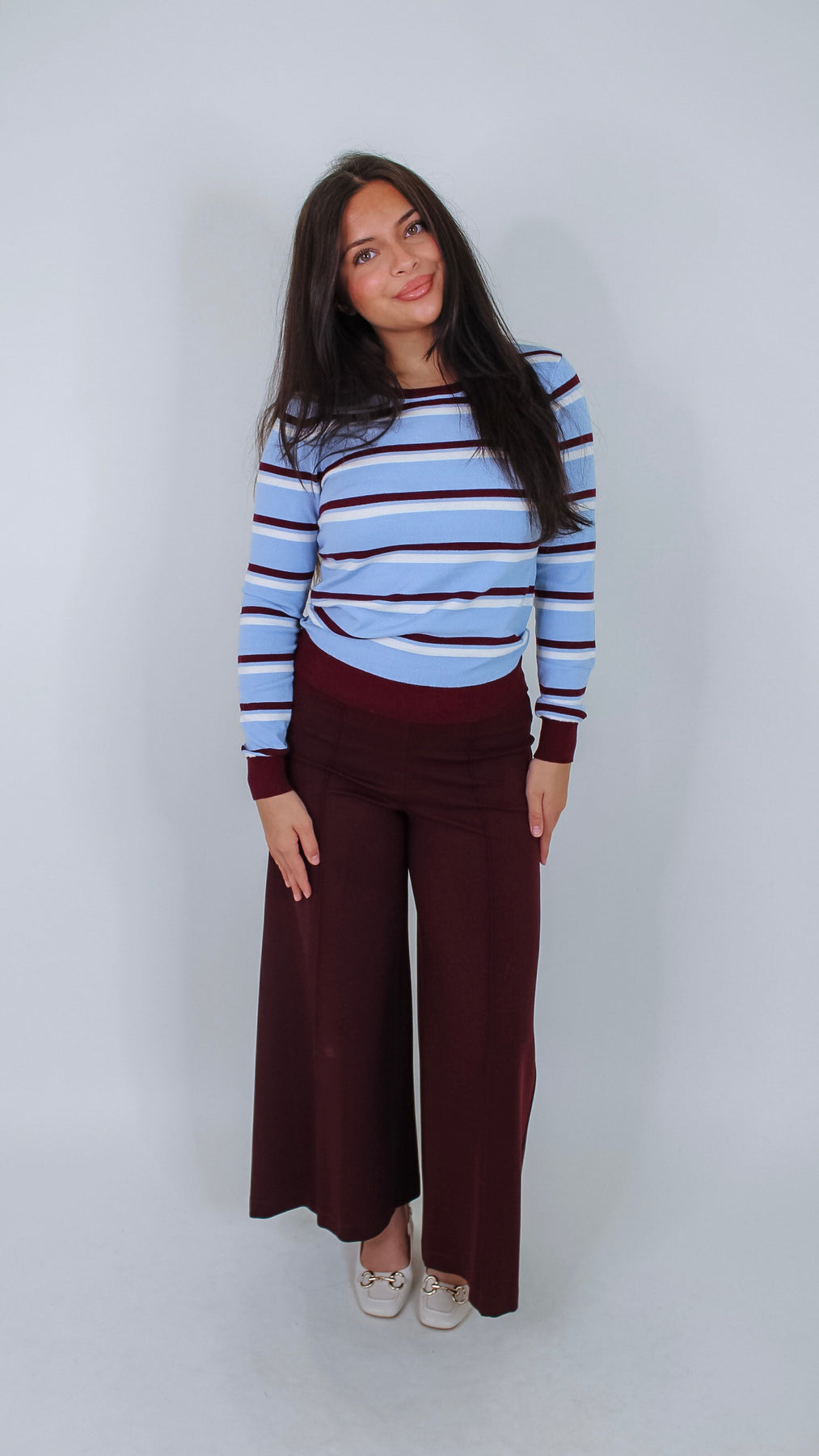 Featuring a bold blue and maroon striped pattern, this long sleeve top is perfect for layering or wearing solo. The classic color combo works with everything in your closet, making it an easy go-to for casual days and cozy nights.