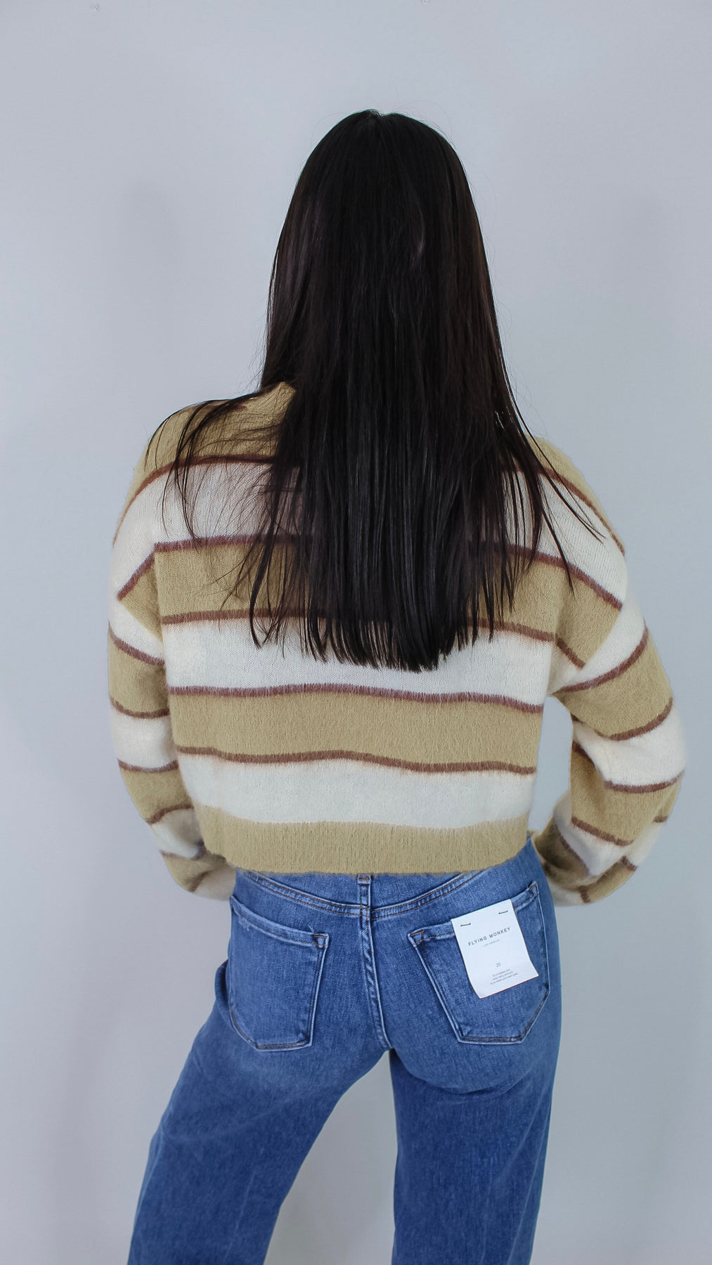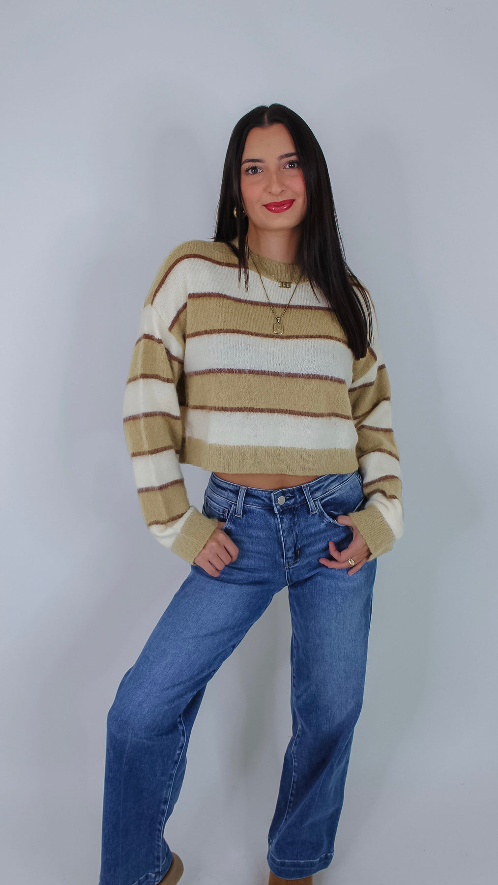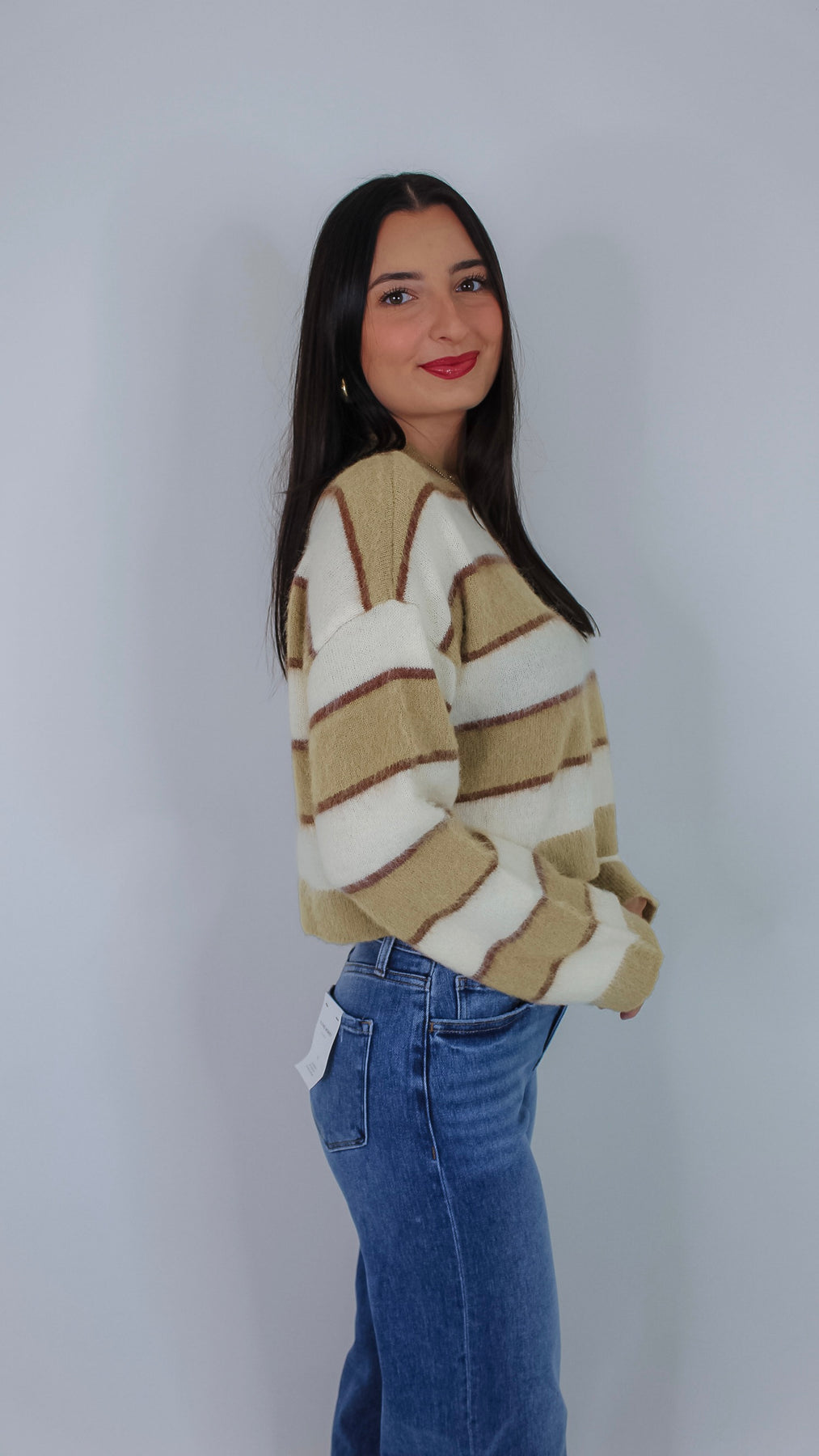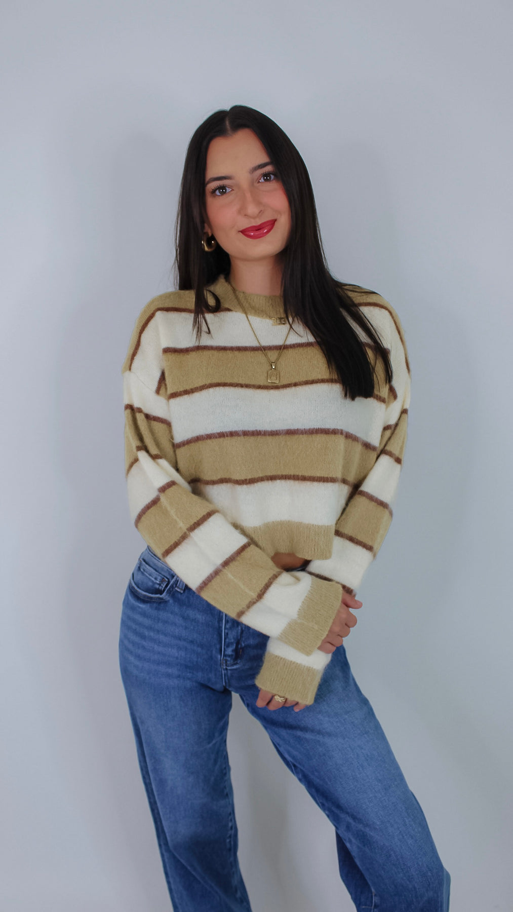 Cozy up in the Amari Striped Sweater, featuring playful olive and cream stripes that bring a fresh twist to your casual look. Soft, comfortable, and effortlessly stylish, it’s perfect for layering on cooler days or adding a pop of color to your outfit. Make every day a little brighter with this charming sweater!