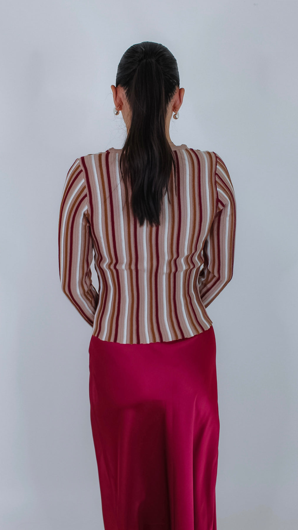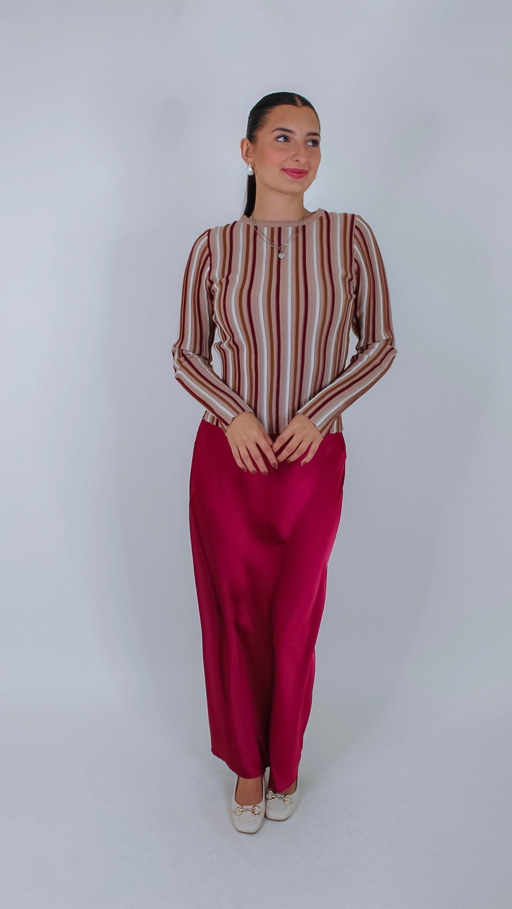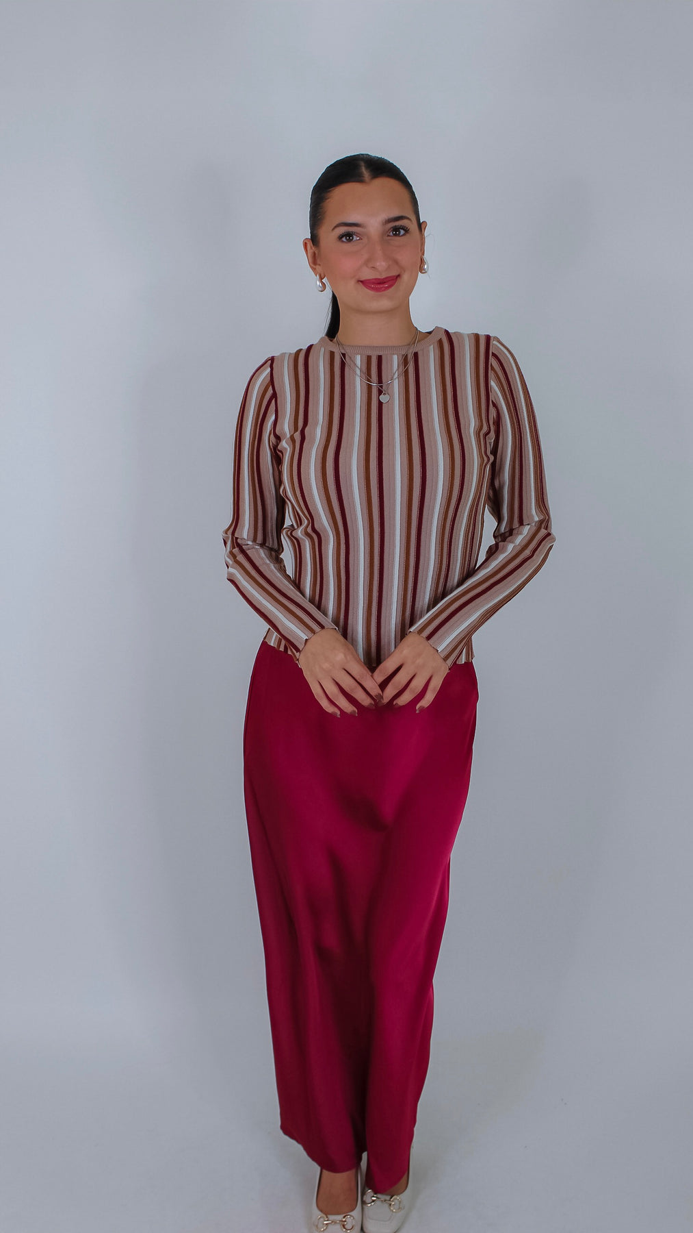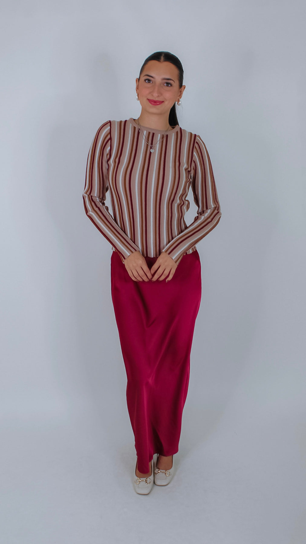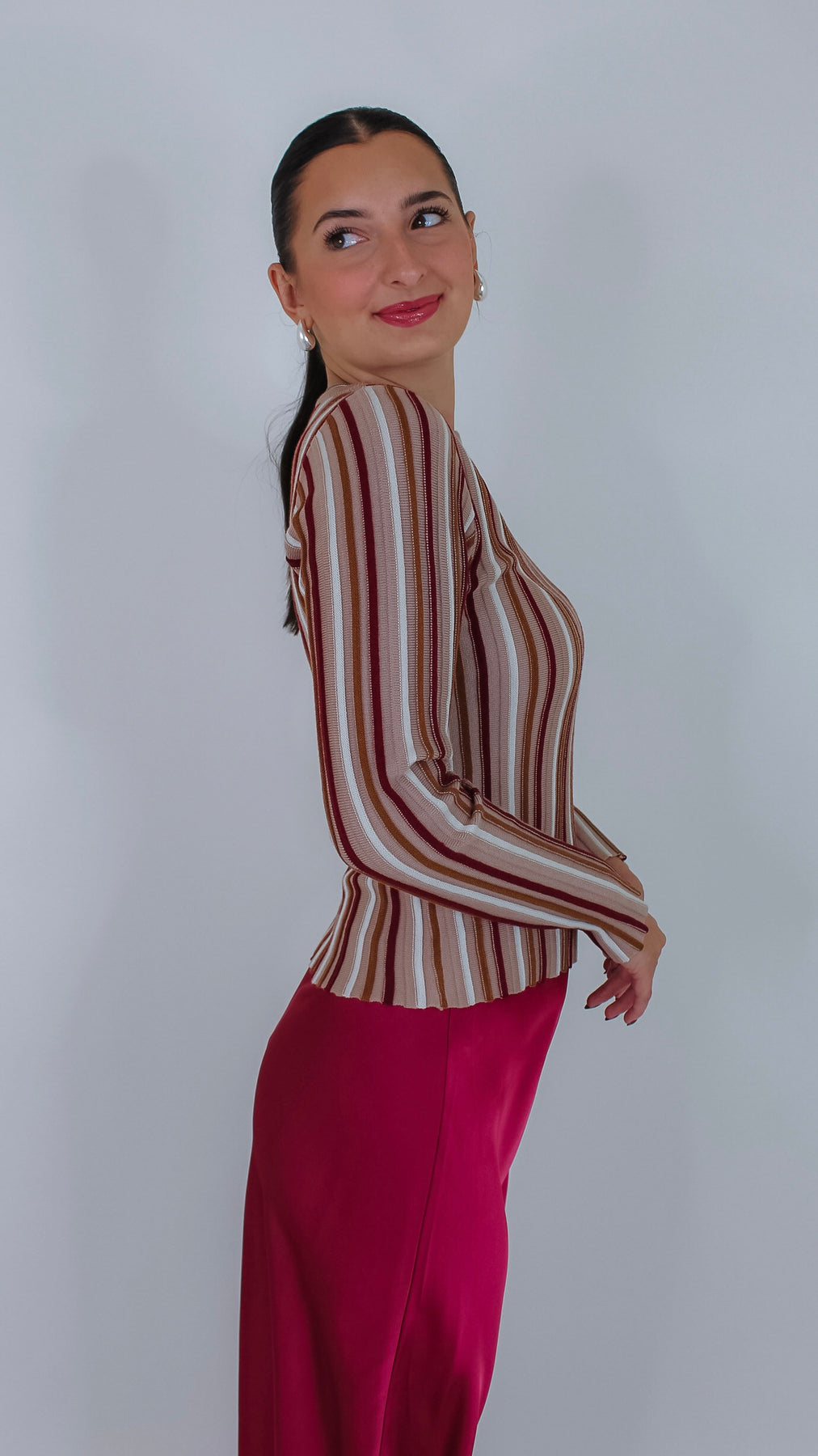 Bring a fun twist to your wardrobe with the Aura Taupe/Burgundy Striped Top. Its cozy long sleeves and playful stripes in taupe and rich burgundy make it perfect for layering on cooler days. Whether you're pairing it with jeans or a skirt, this top adds a pop of color to any outfit.