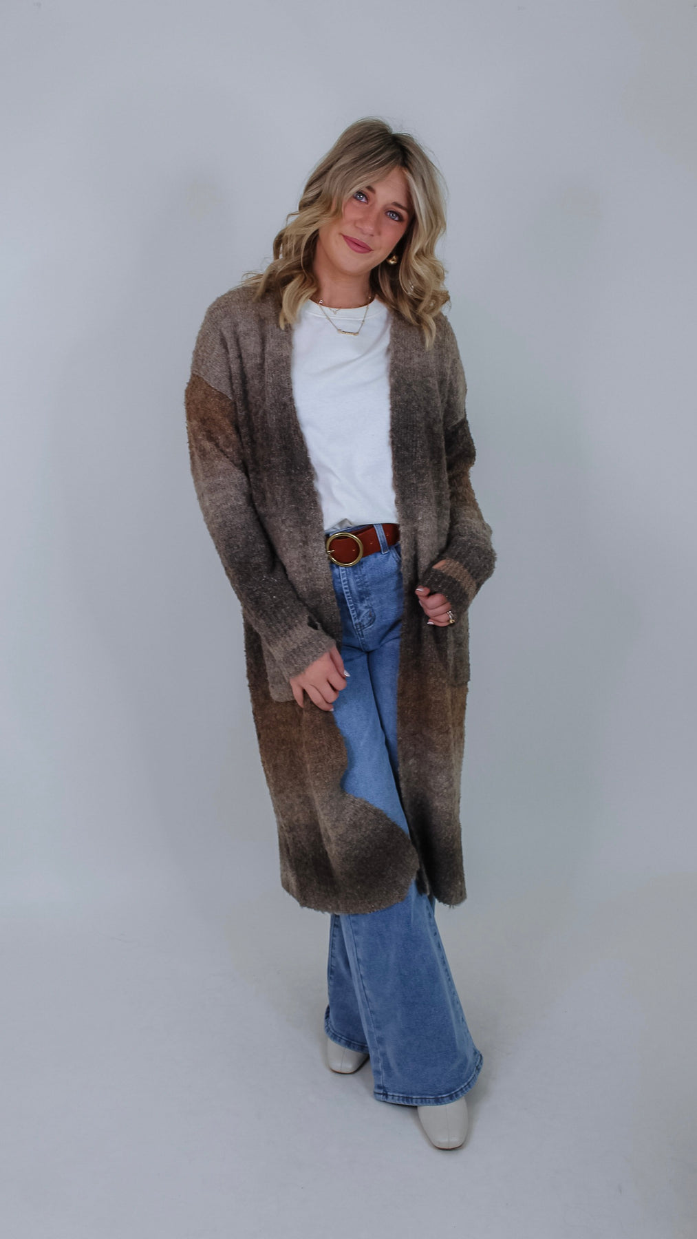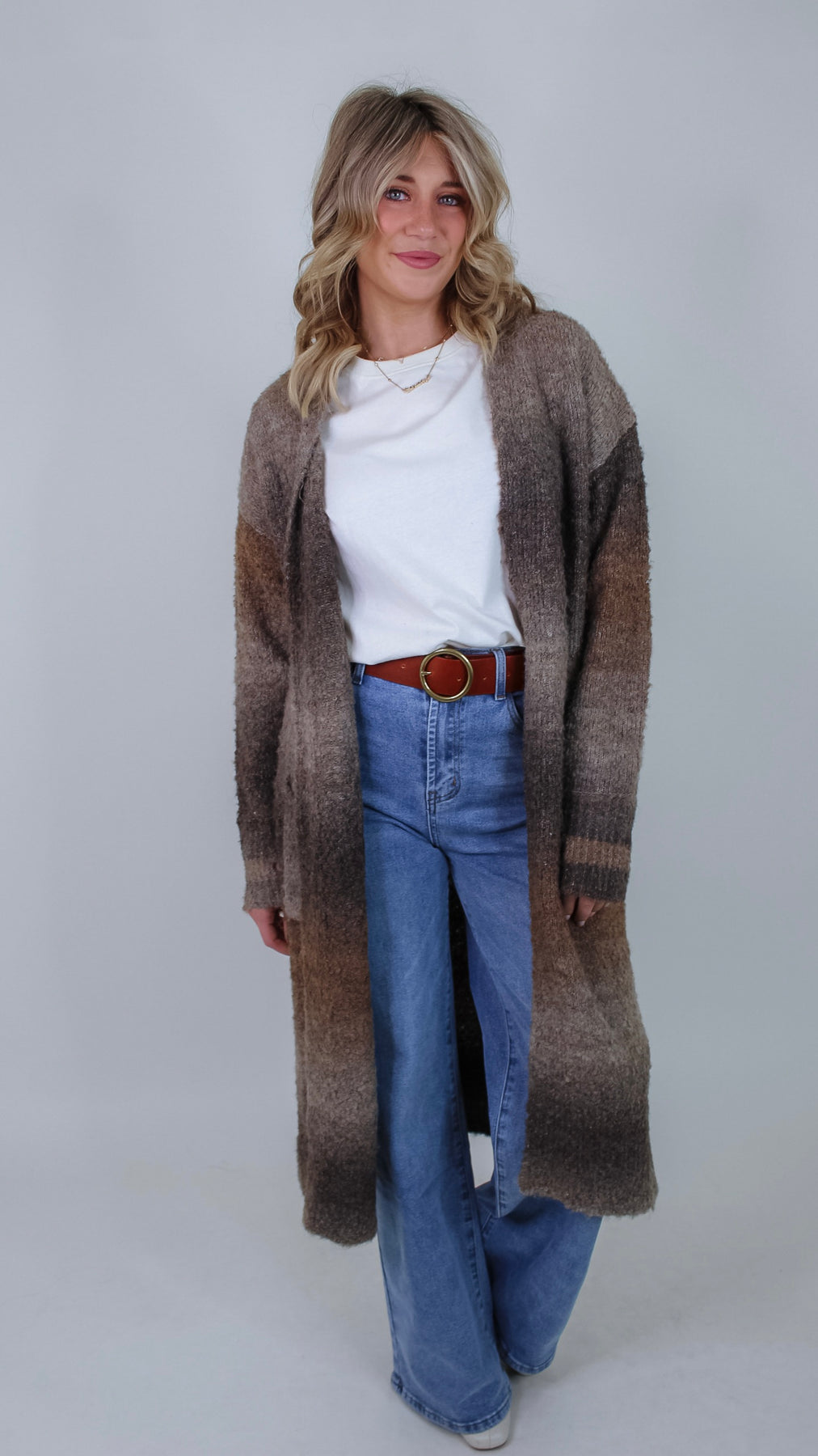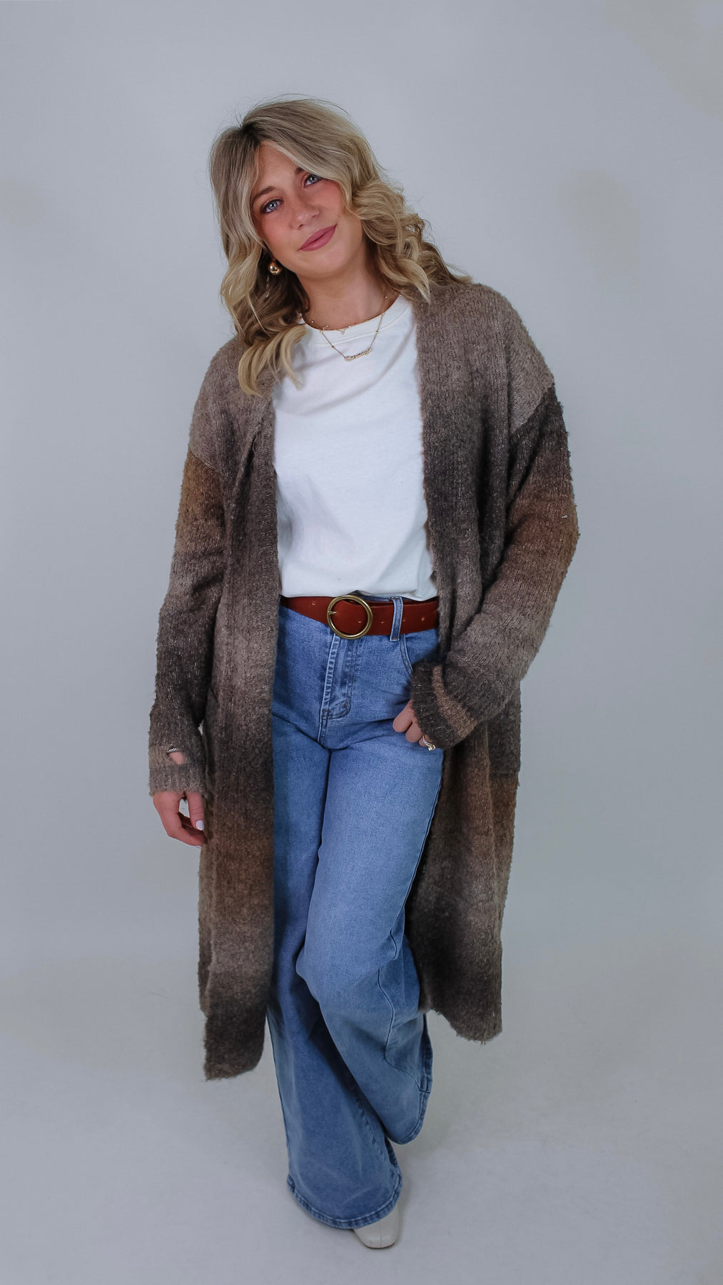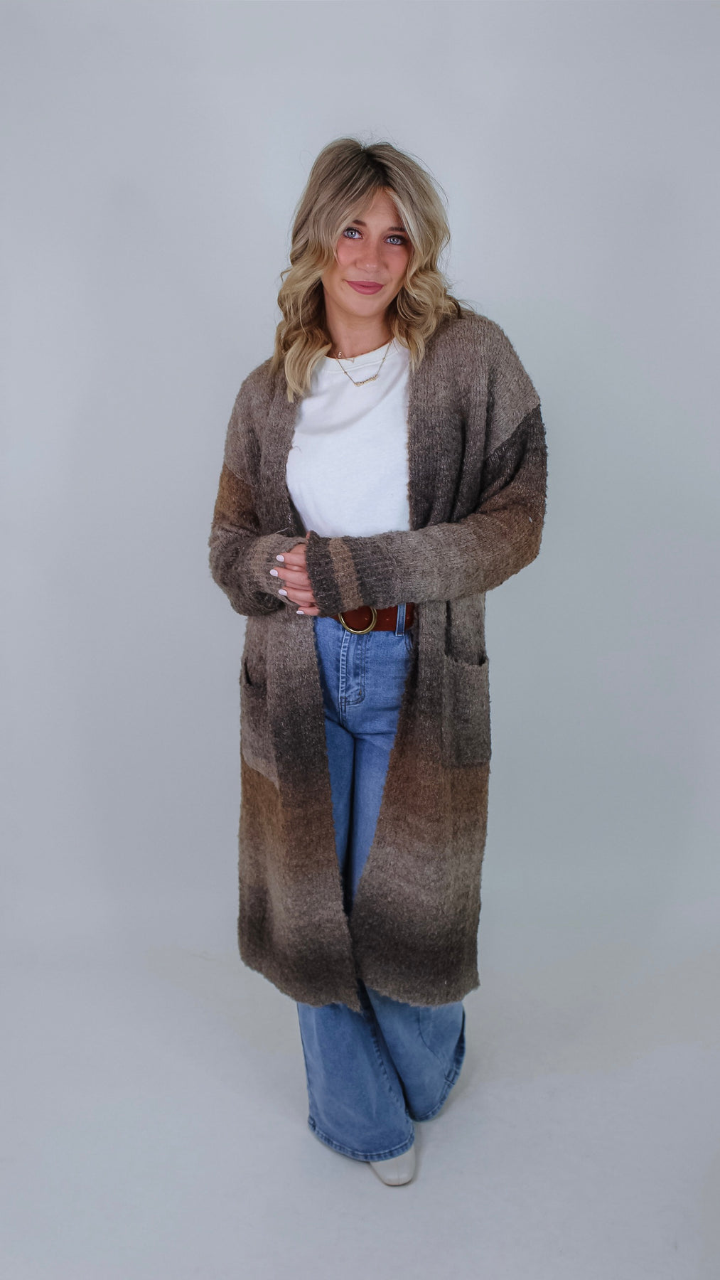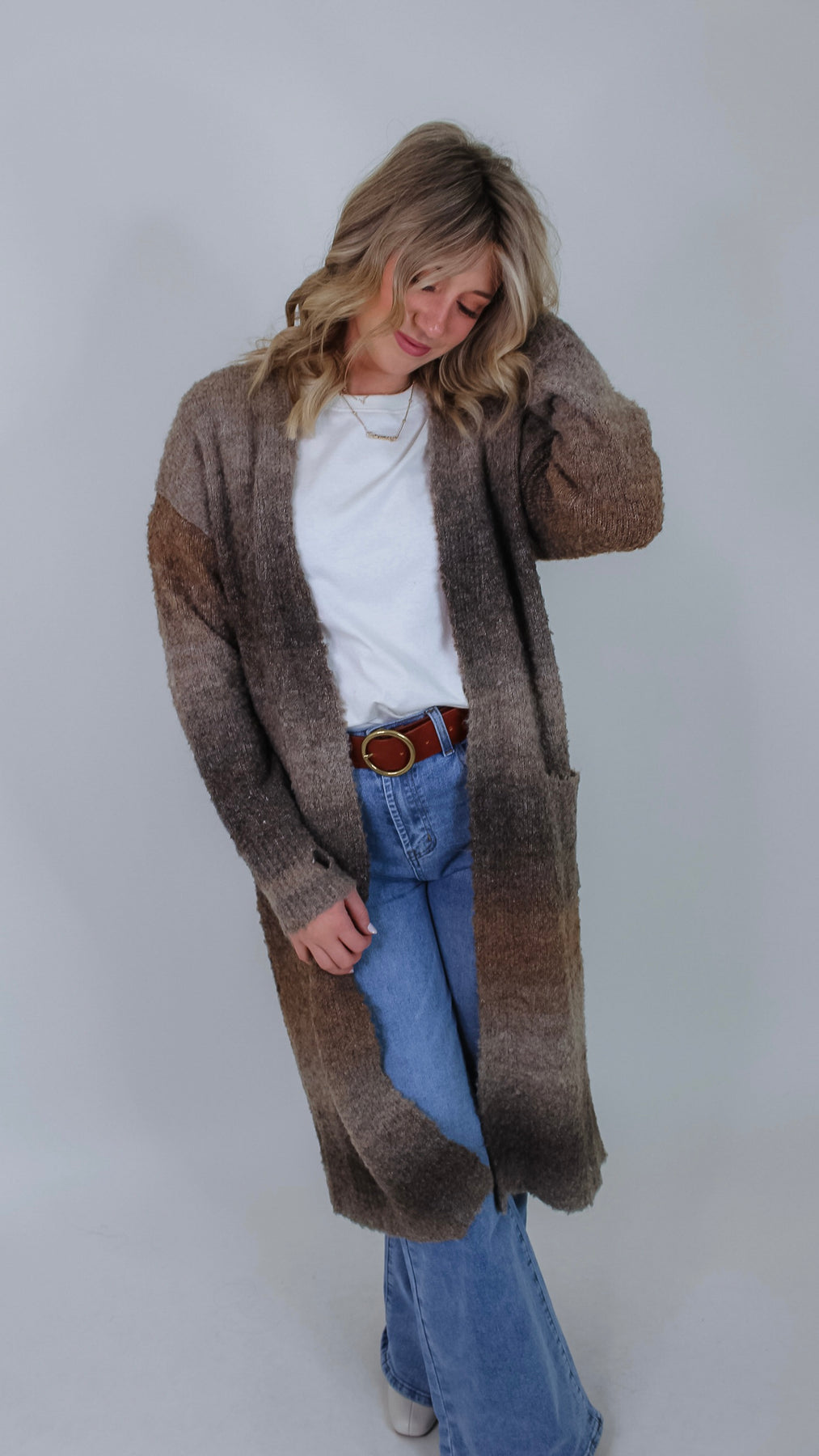 Wrap yourself in cozy charm with the City Limits Brown Ombre Cardigan. Its soft gradient shades add a touch of fun to your look, while the long fit keeps you comfortable on cooler days. Perfect for layering over your favorite outfit, this cardigan effortlessly blends warmth with style!