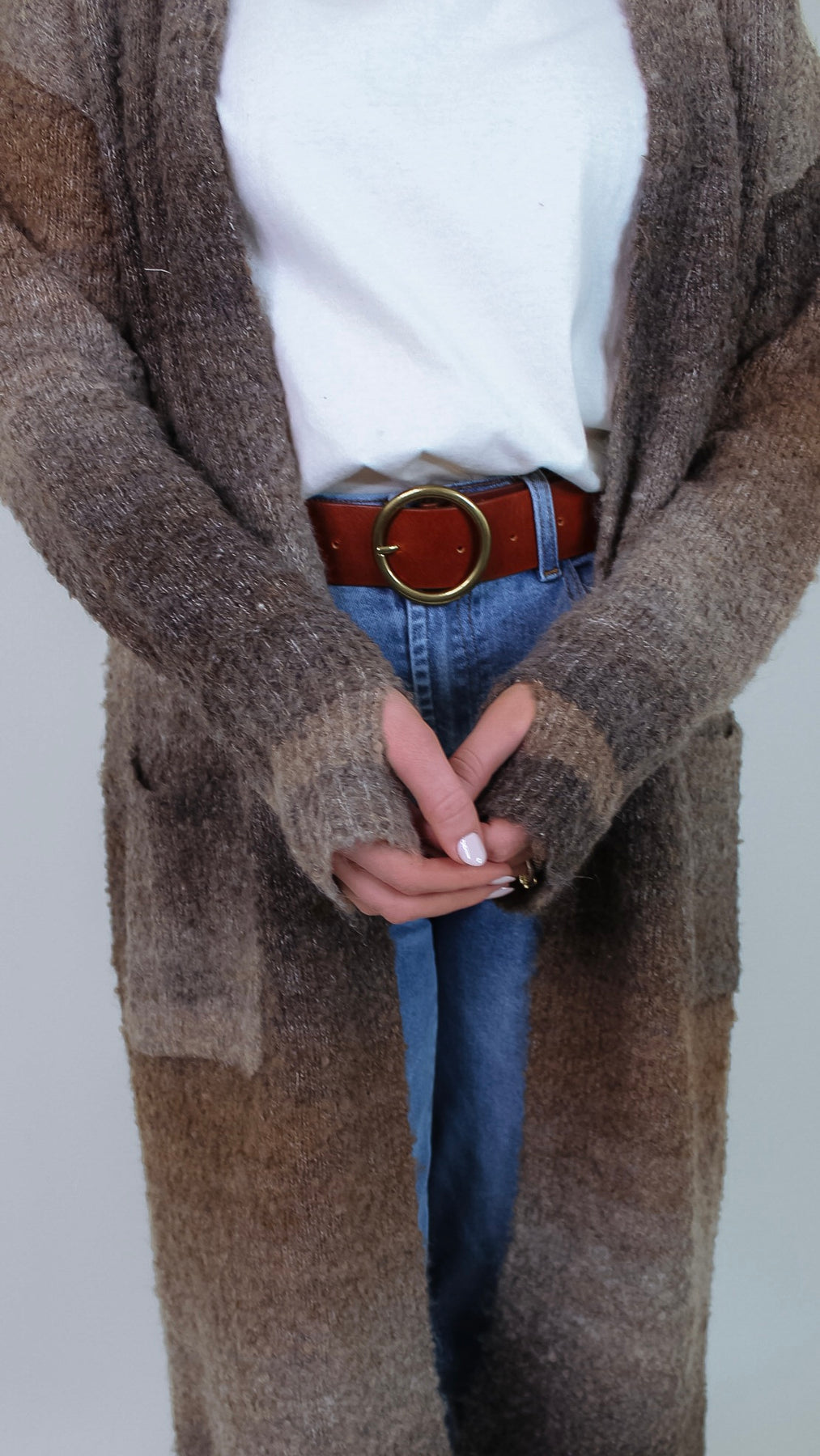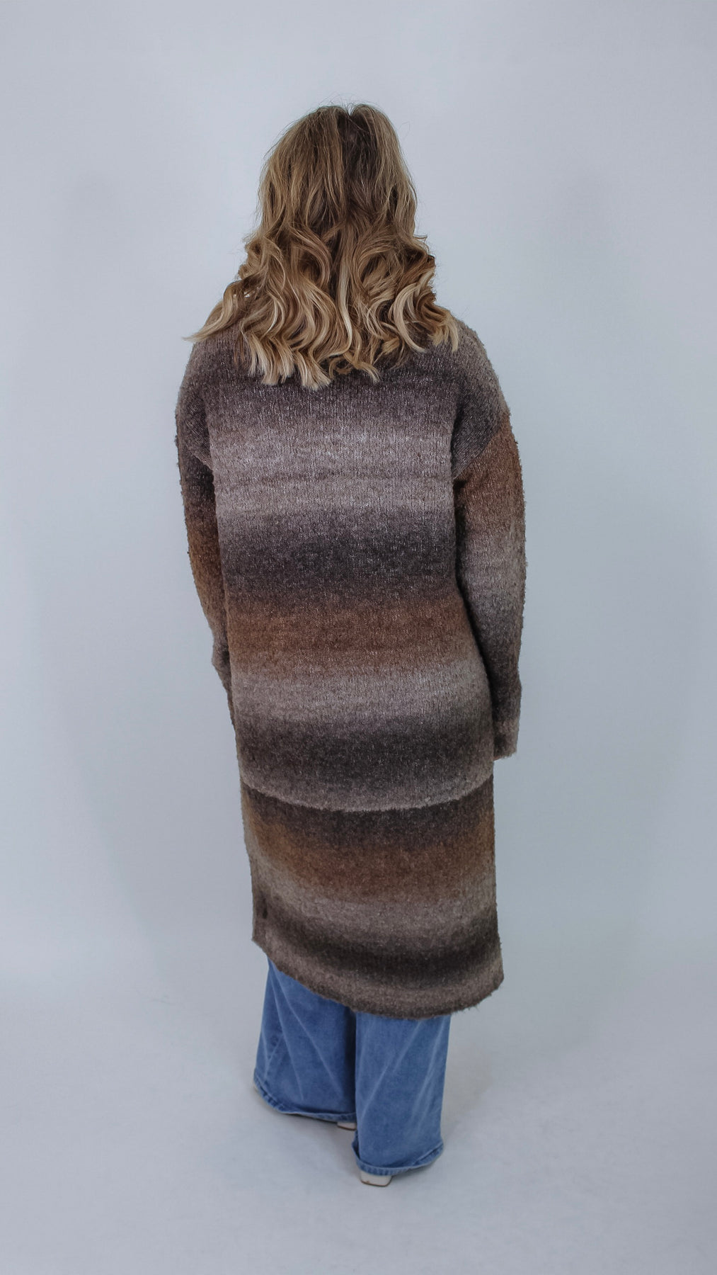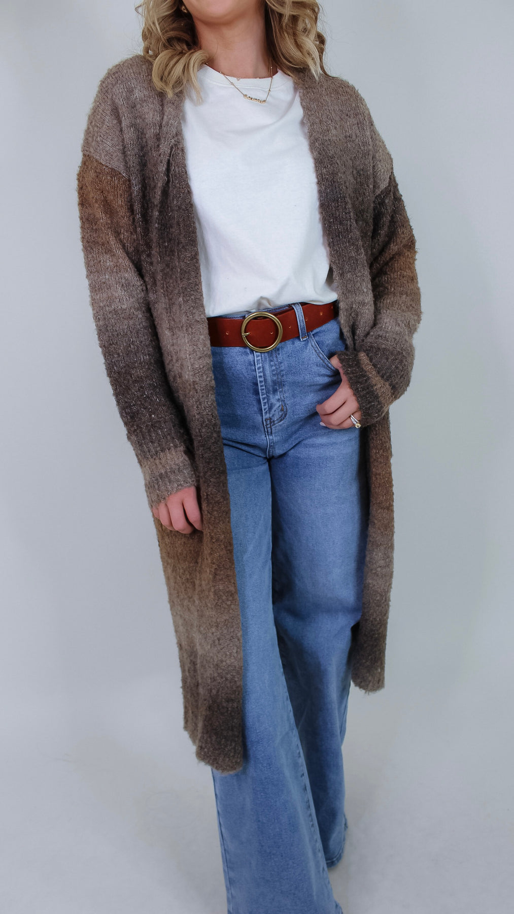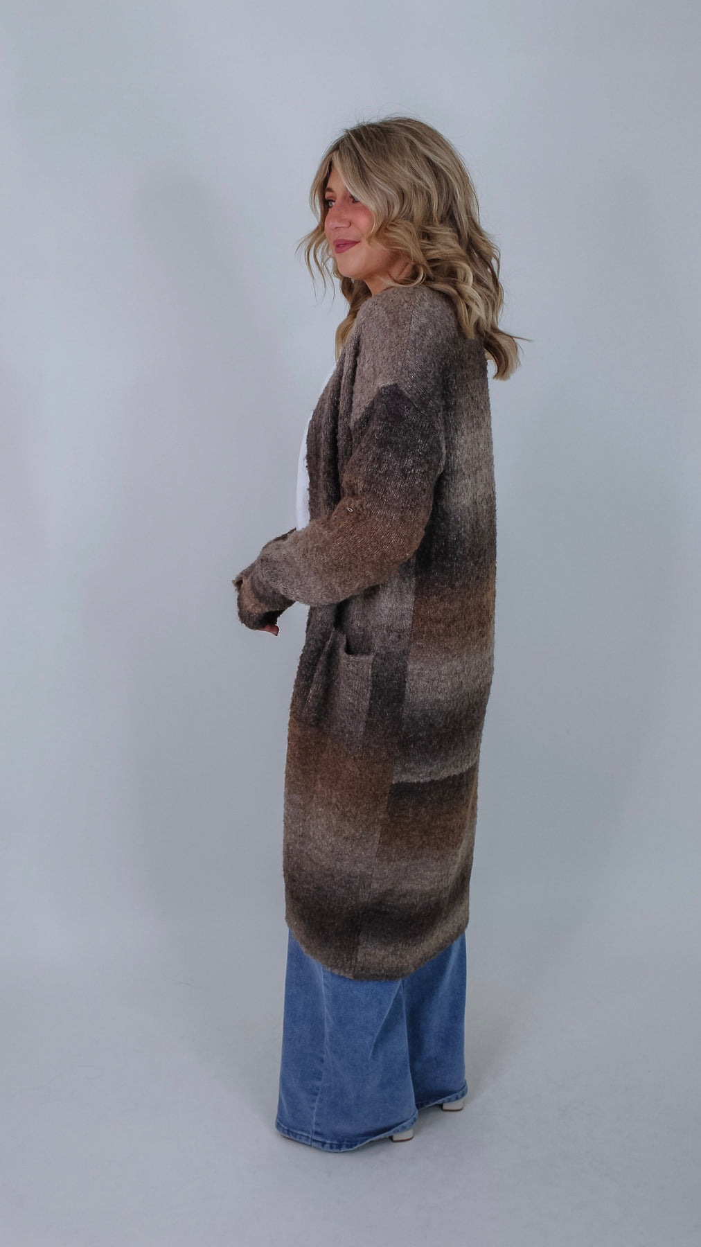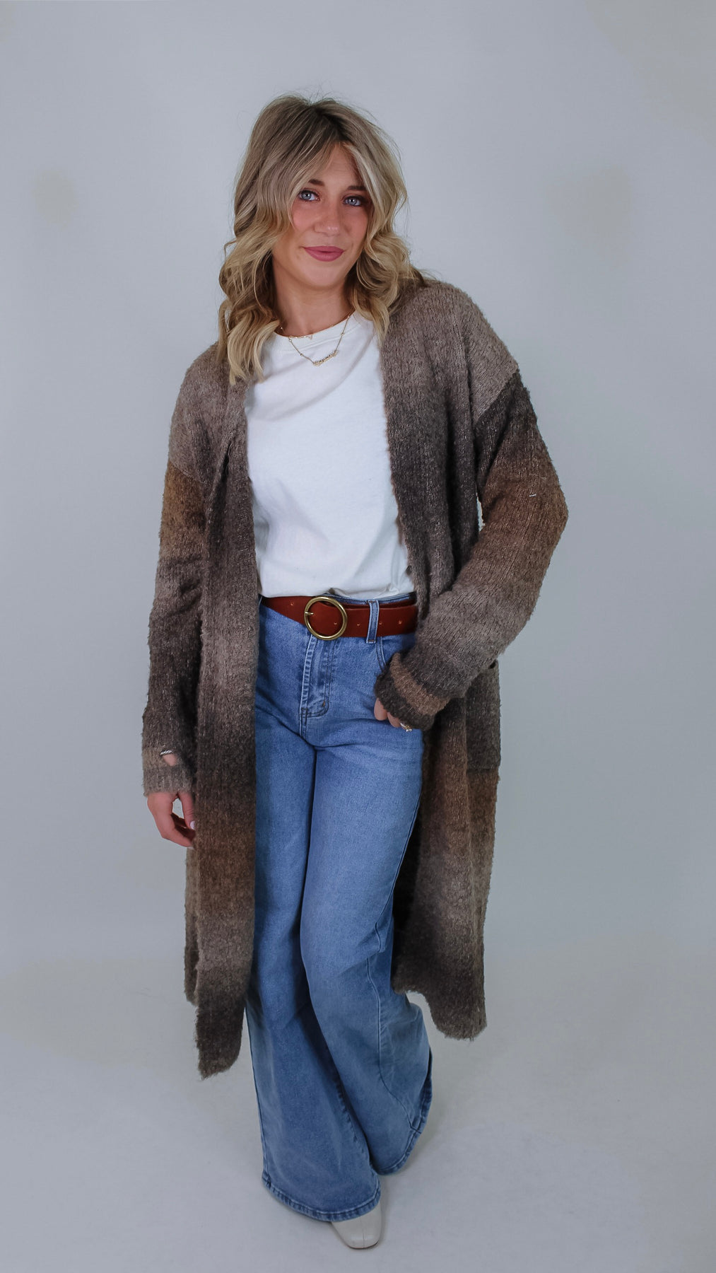 Wrap yourself in cozy charm with the City Limits Brown Ombre Cardigan. Its soft gradient shades add a touch of fun to your look, while the long fit keeps you comfortable on cooler days. Perfect for layering over your favorite outfit, this cardigan effortlessly blends warmth with style!