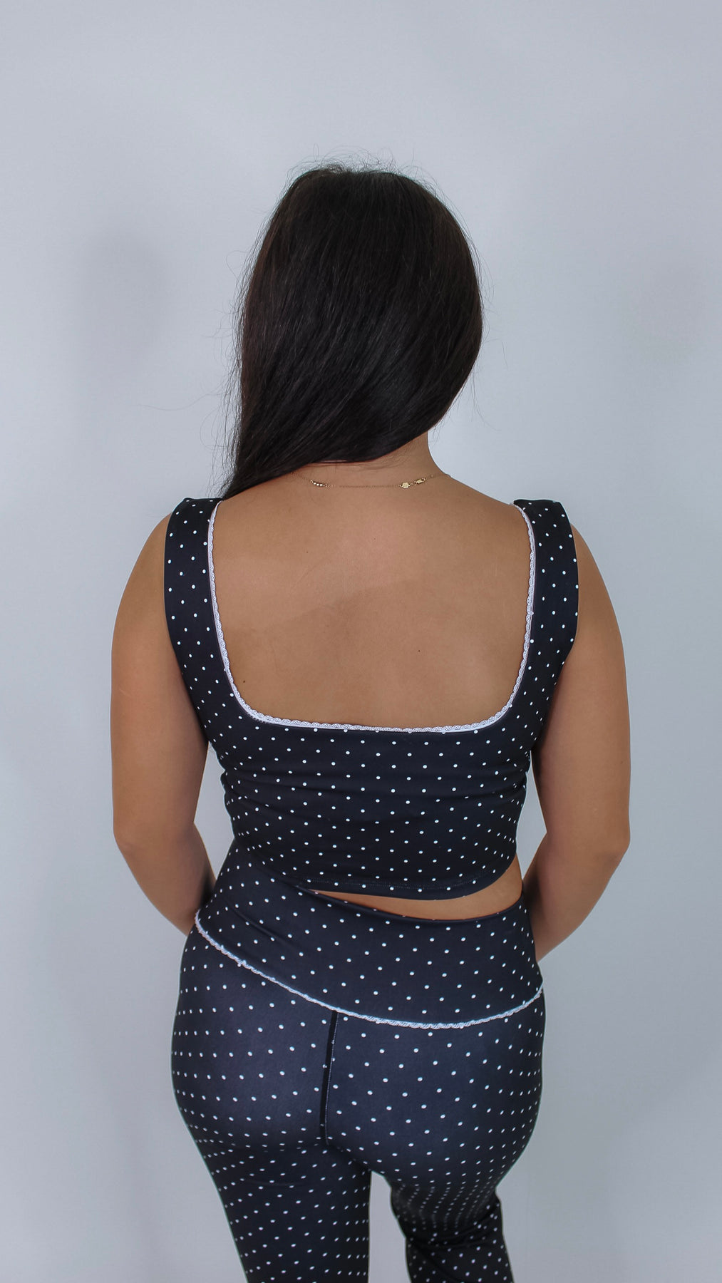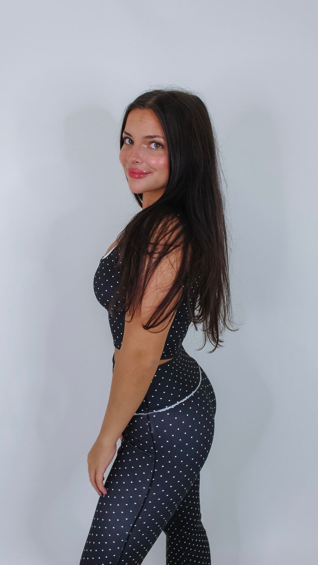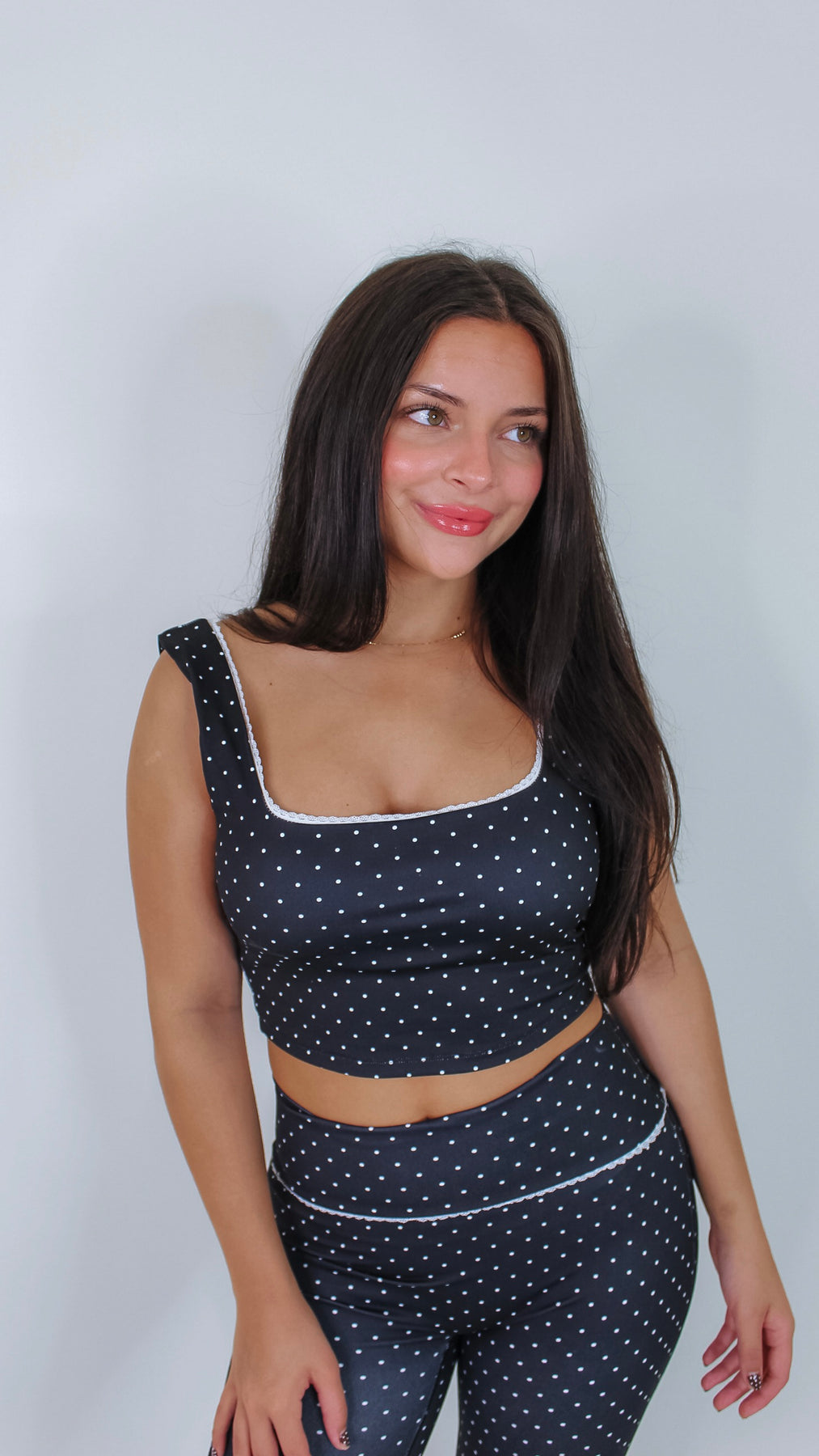 Add a fun twist to your wardrobe with the Darline Black Polka Dot Tank. Its playful black and white polka dot pattern and cropped fit make it perfect for sunny days and casual outings. Pair it with the matching pants for a flirty, retro-inspired look that’s full of personality.