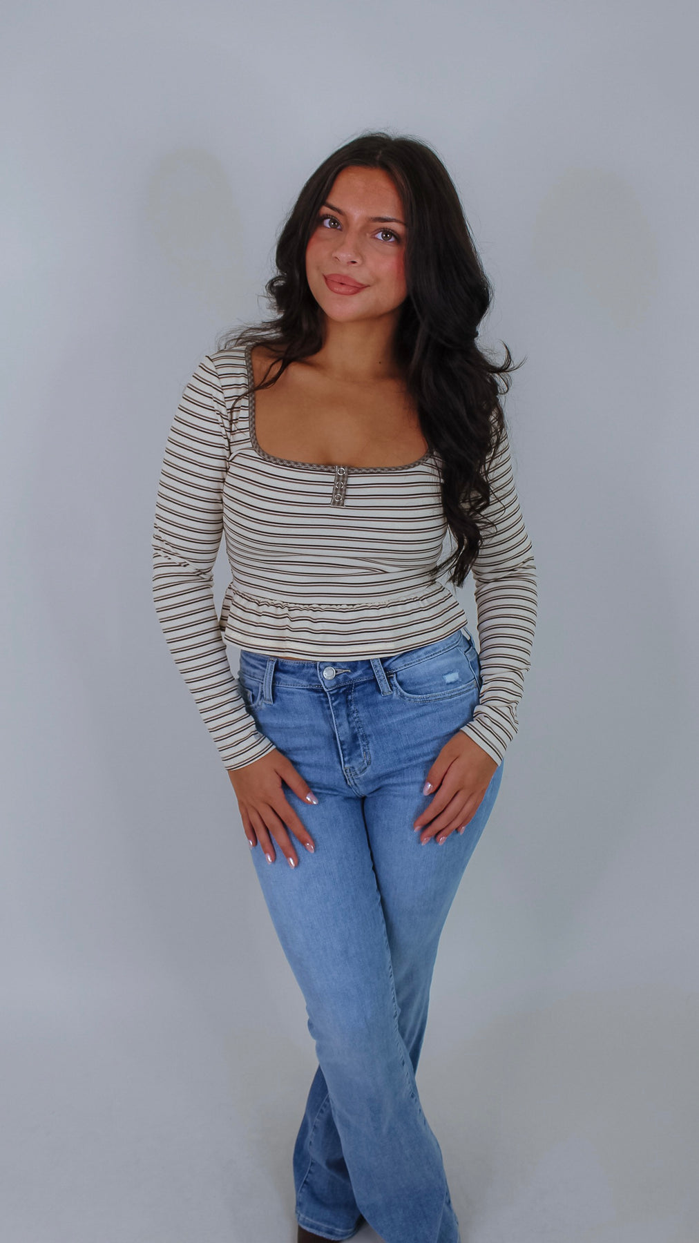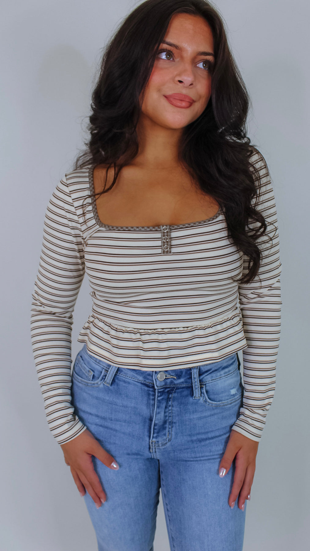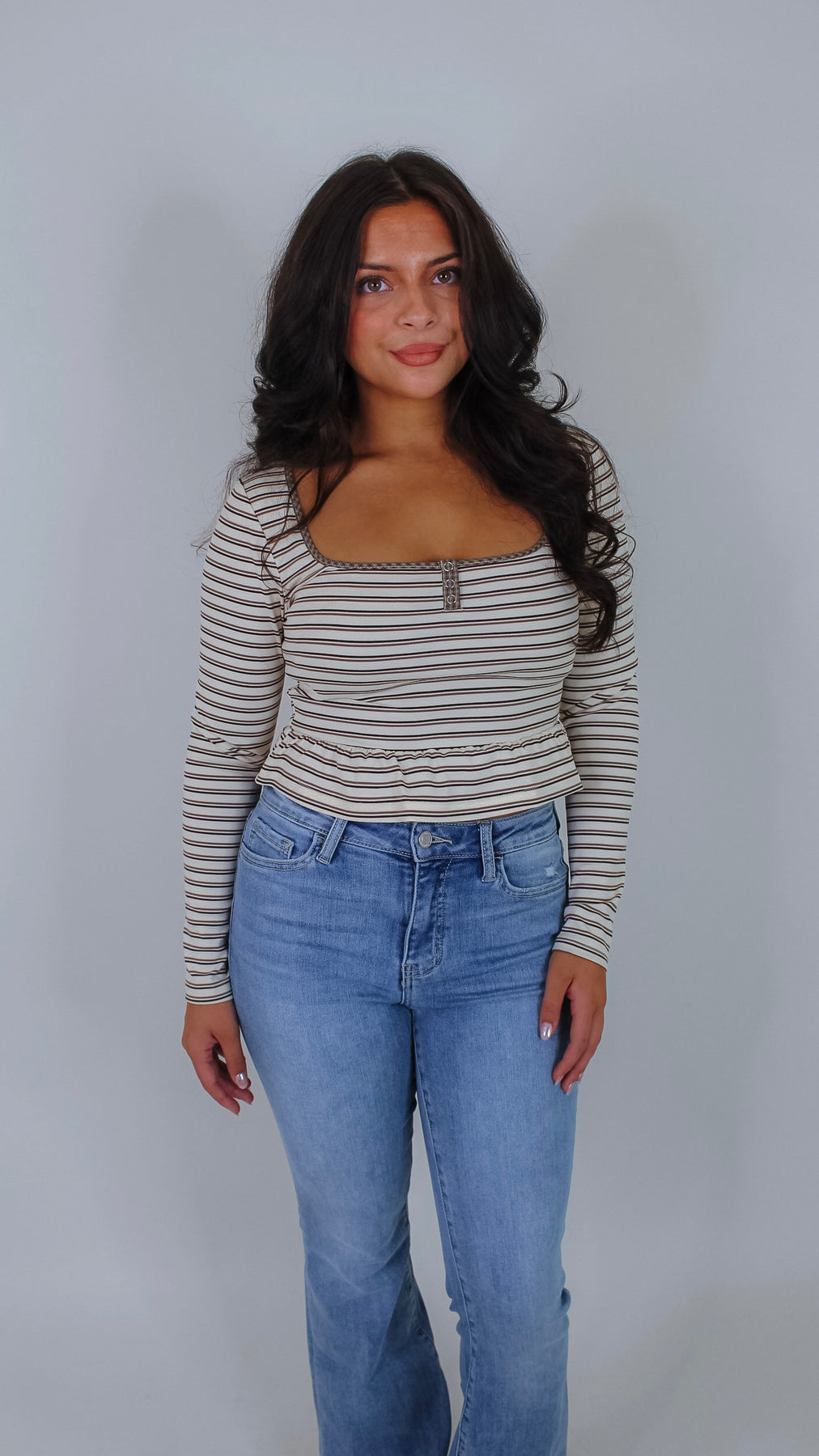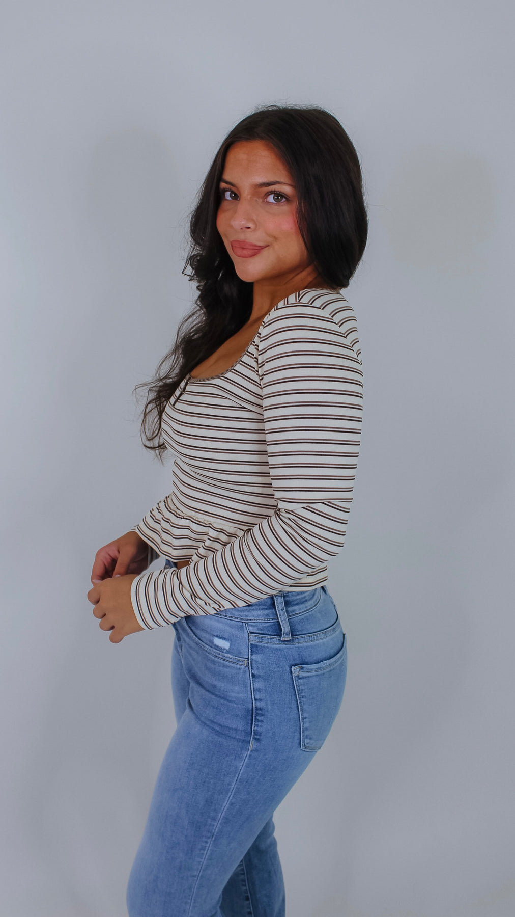 Elevate your wardrobe with the Everett Cream Striped Top, a sophisticated piece that seamlessly transitions from office to weekend. The classic striped pattern in warm beige tones offers timeless versatility, while the flattering peplum silhouette creates a polished, feminine shape. Crafted for comfort and style, this top pairs effortlessly with tailored trousers, denim, or skirts for endless outfit possibilities.