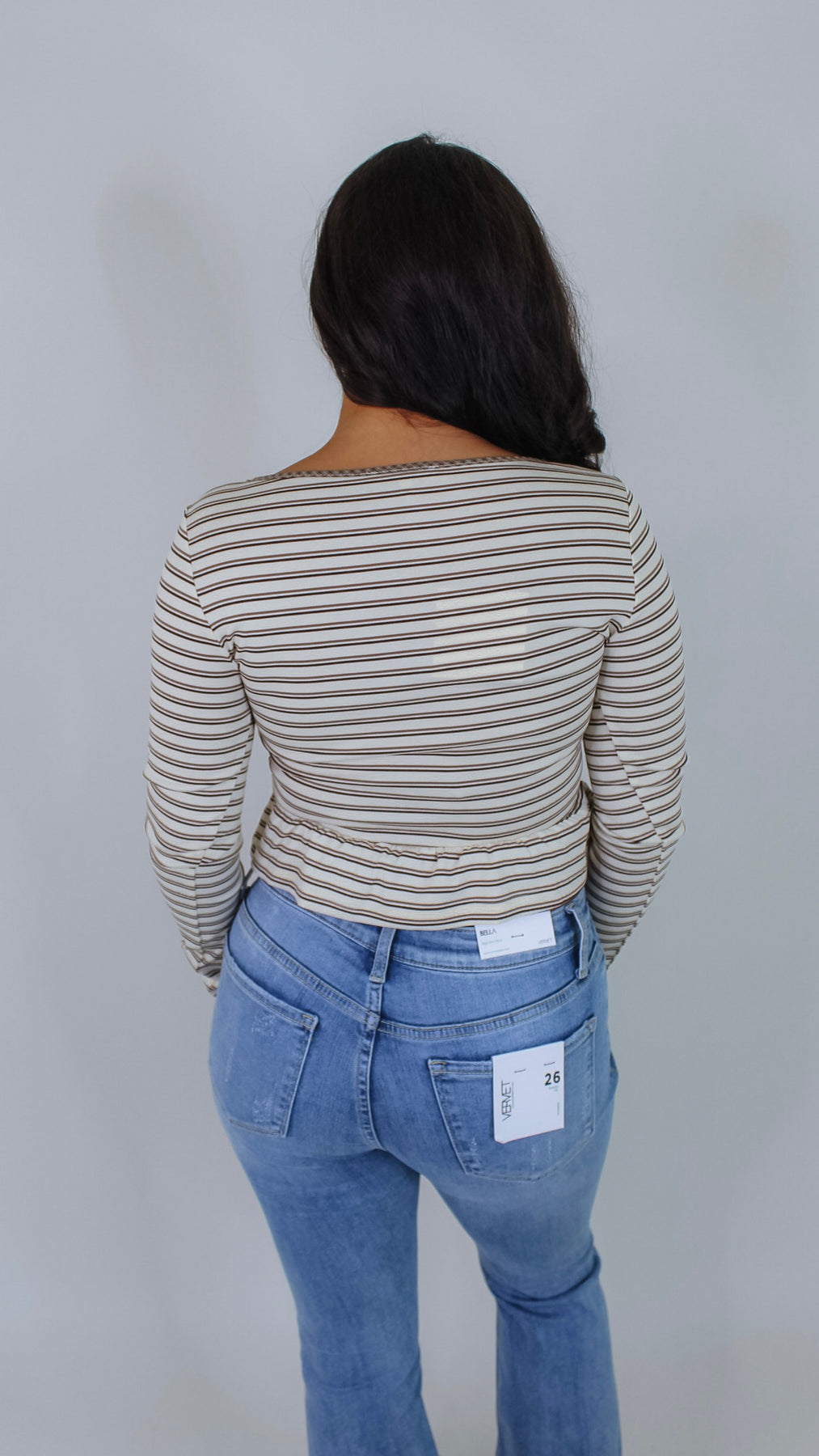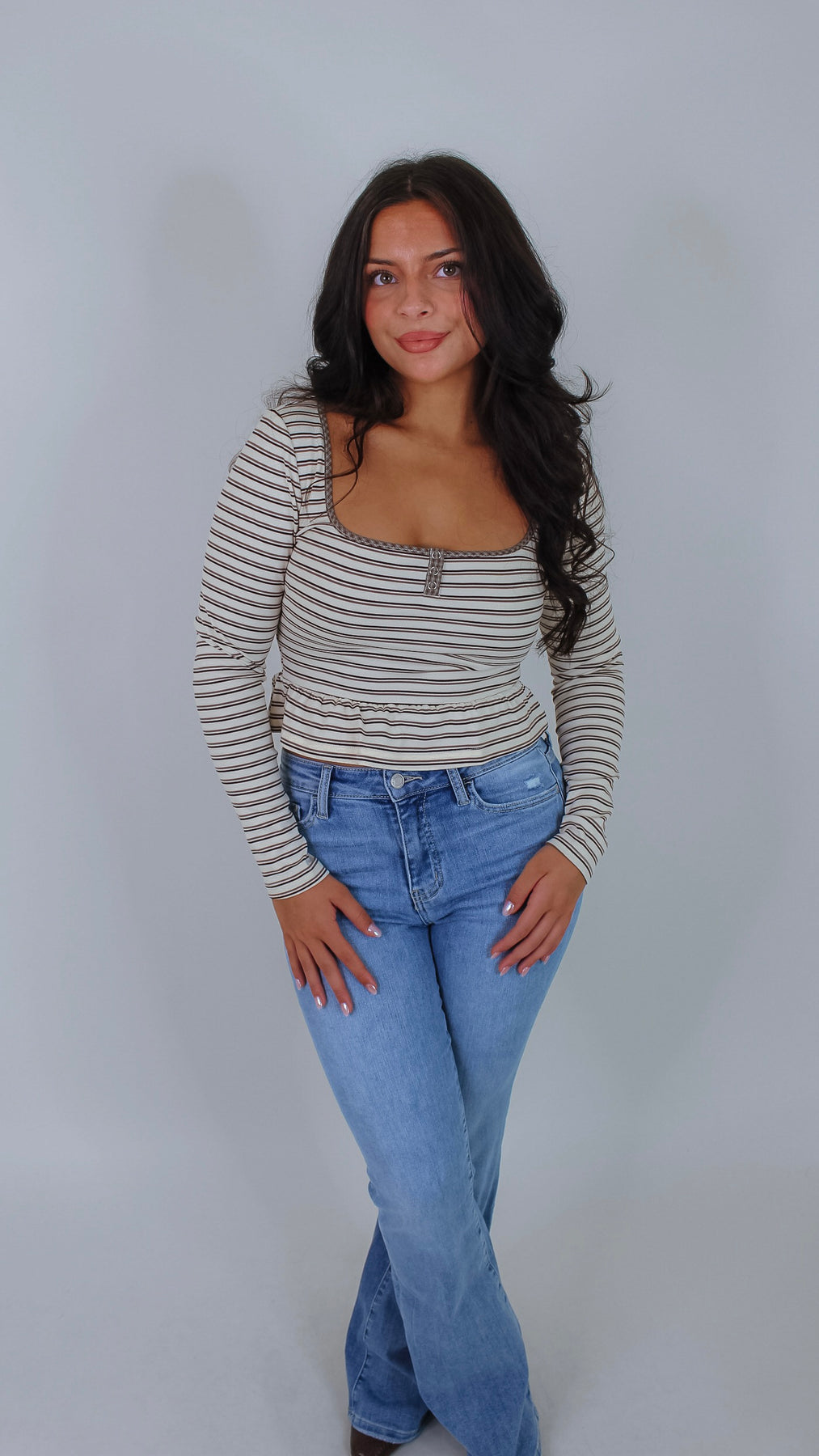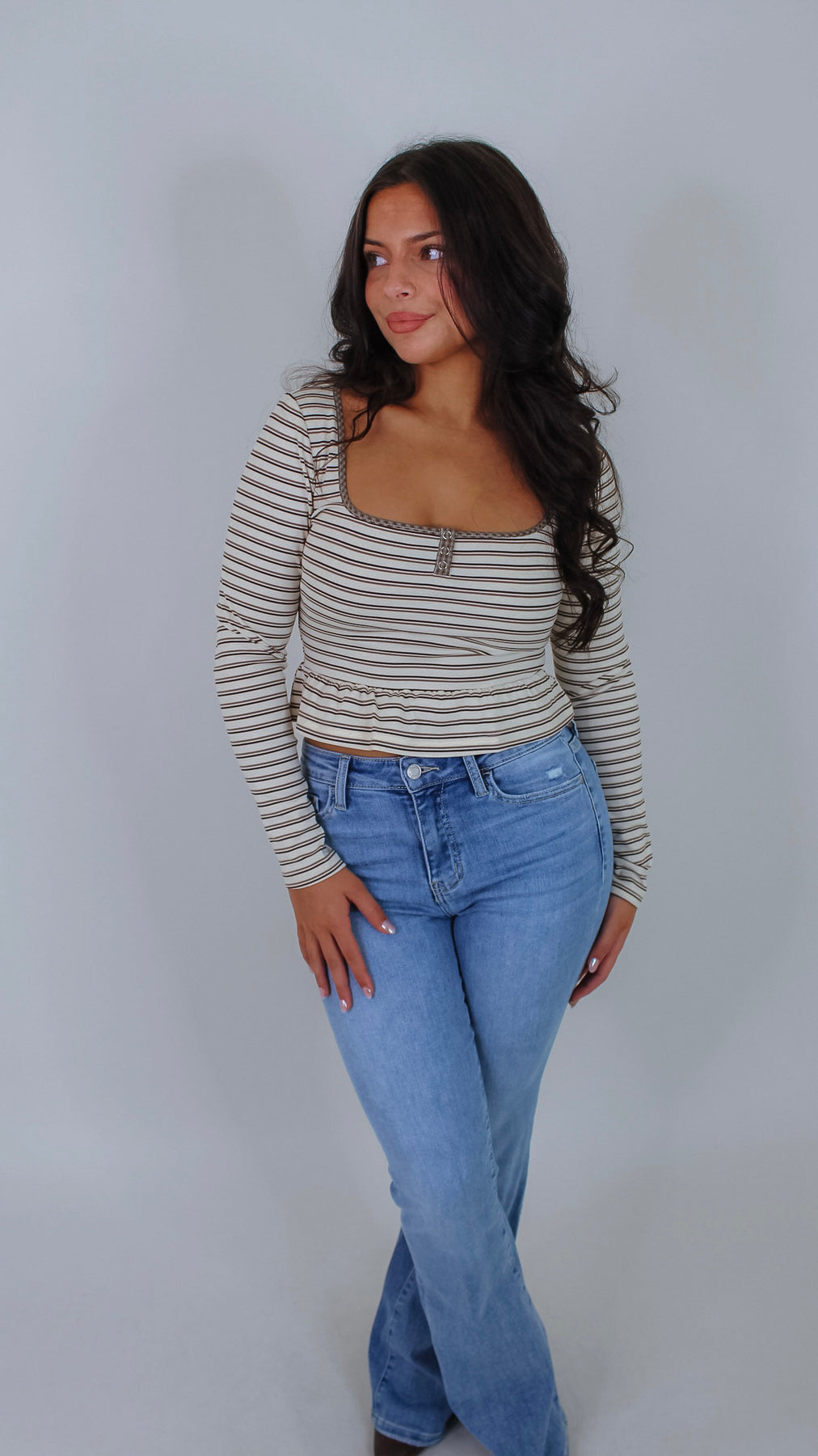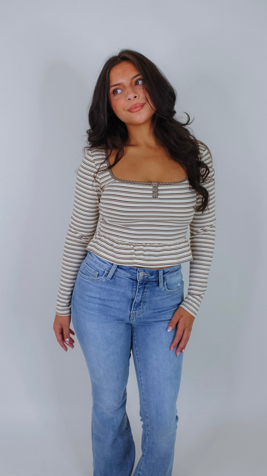 Elevate your wardrobe with the Everett Cream Striped Top, a sophisticated piece that seamlessly transitions from office to weekend. The classic striped pattern in warm beige tones offers timeless versatility, while the flattering peplum silhouette creates a polished, feminine shape. Crafted for comfort and style, this top pairs effortlessly with tailored trousers, denim, or skirts for endless outfit possibilities.