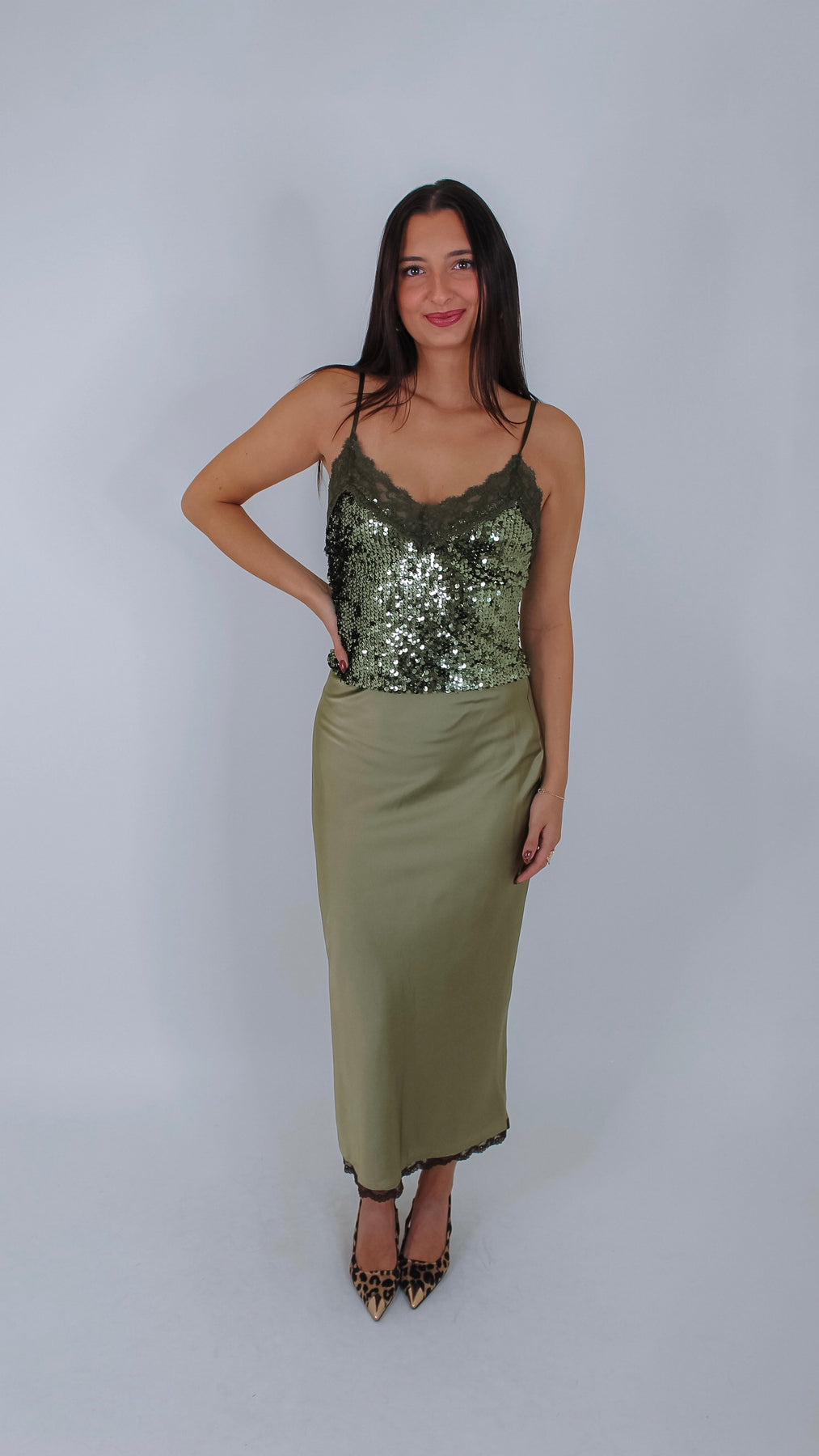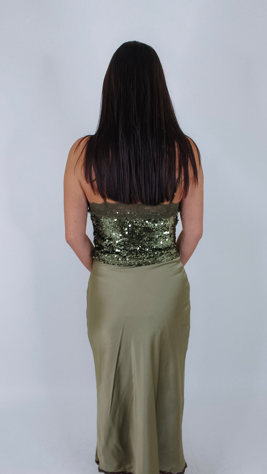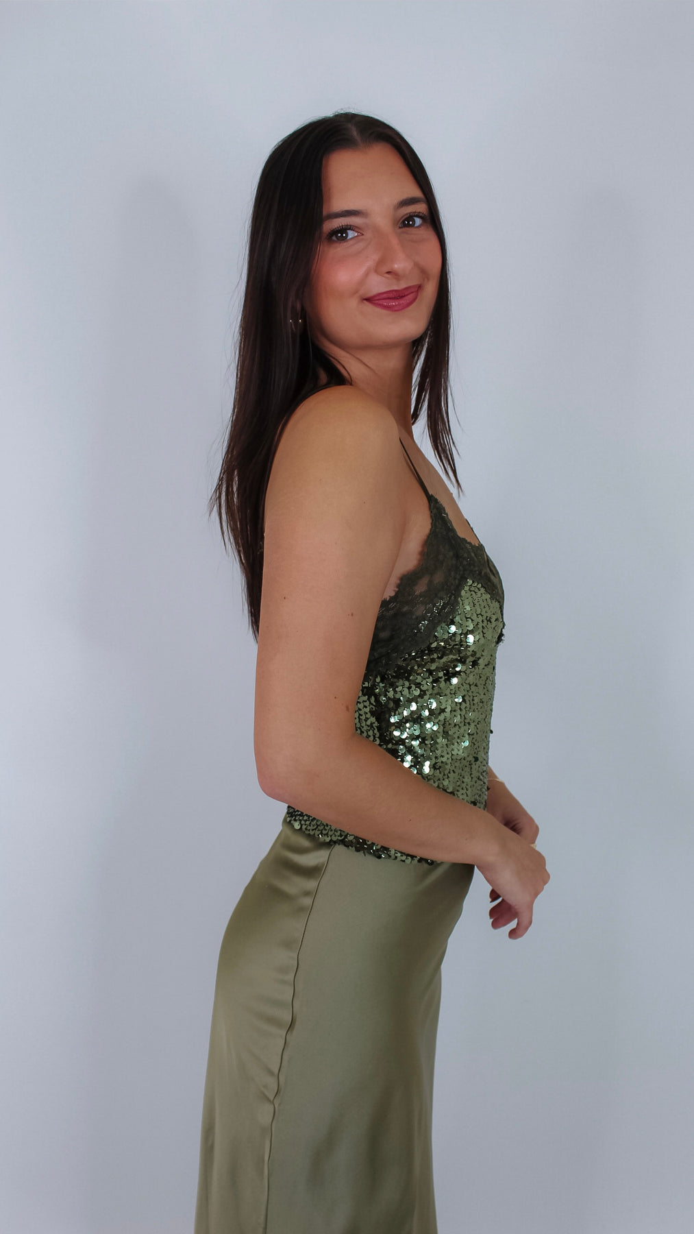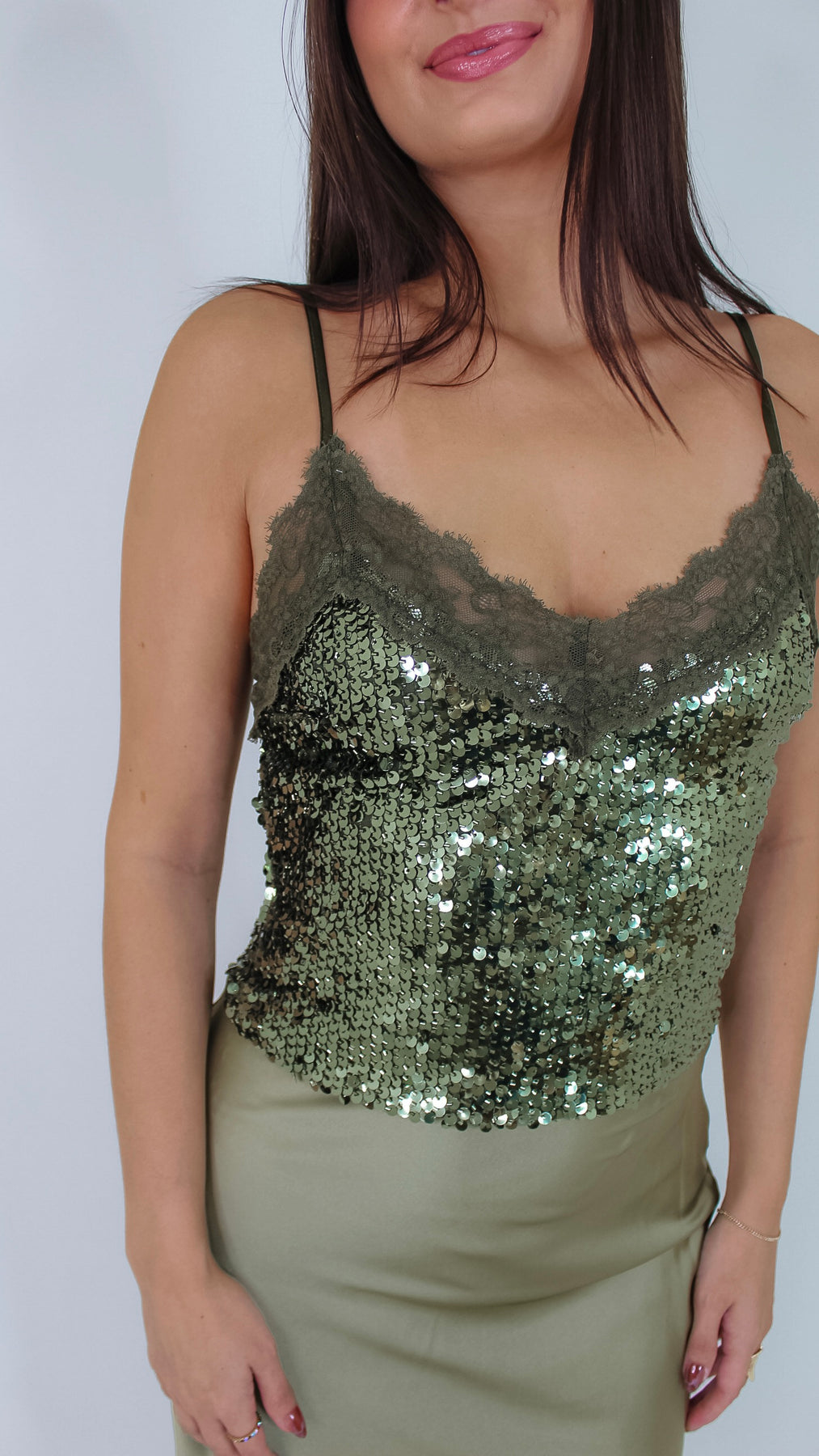 Sparkle and shine in this olive green sequin cami top that adds a touch of glam to any outfit. Lightweight and playful, it’s perfect for dancing the night away or turning heads at brunch. Pair it with jeans or a skirt for instant fun and flair.