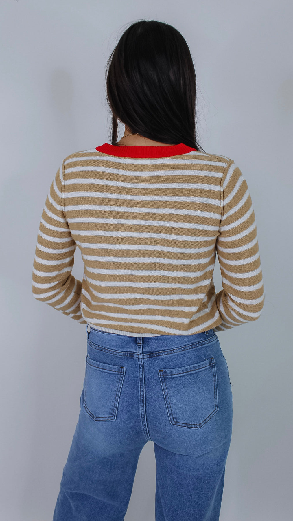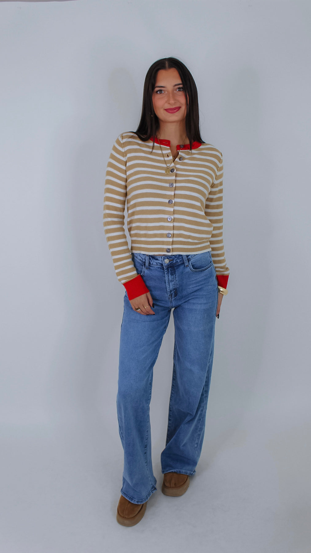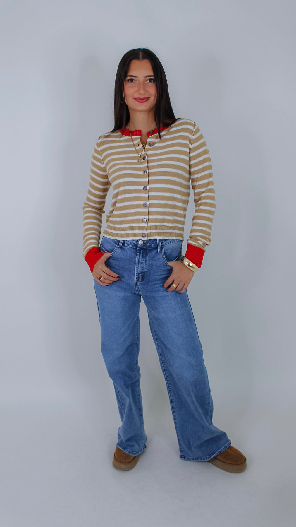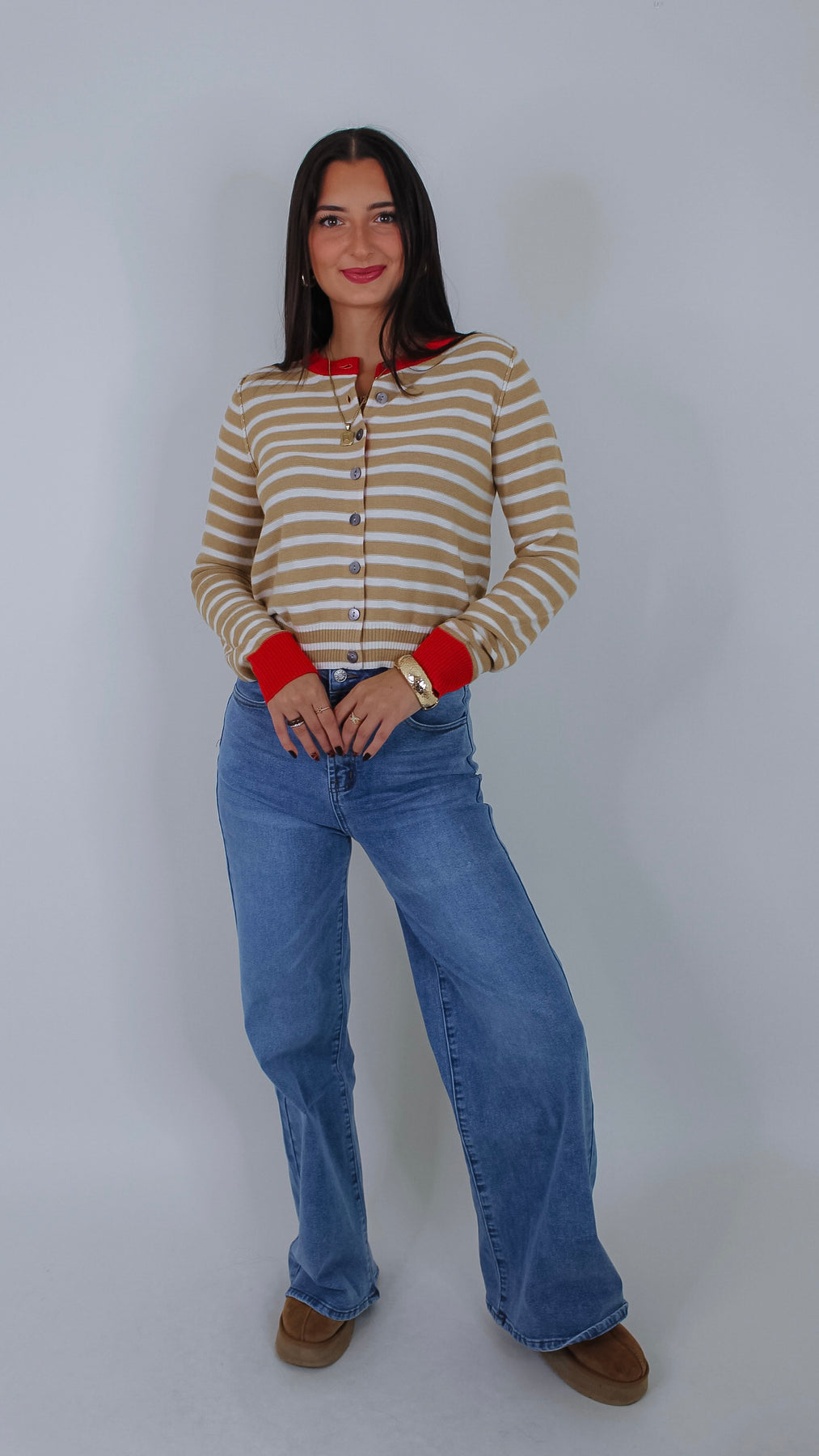 Cozy up in the Holden Camel Striped Cardigan, featuring warm camel tones with playful red collar detail that adds a pop of color to your look. Its soft fabric and relaxed fit make it perfect for layering on chilly days with a fun, stylish twist.