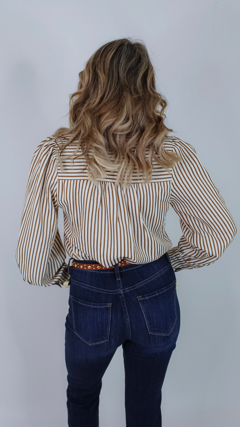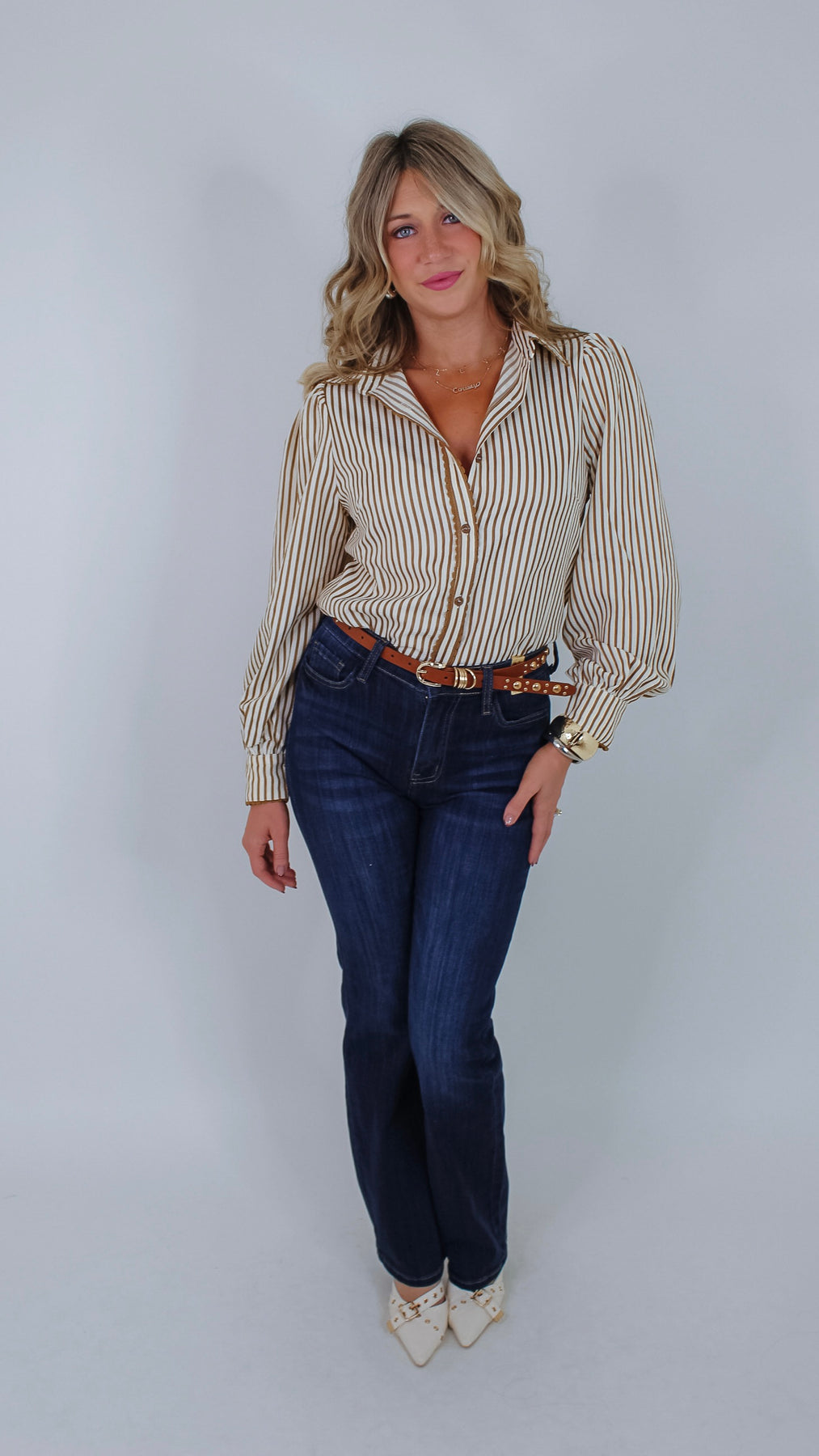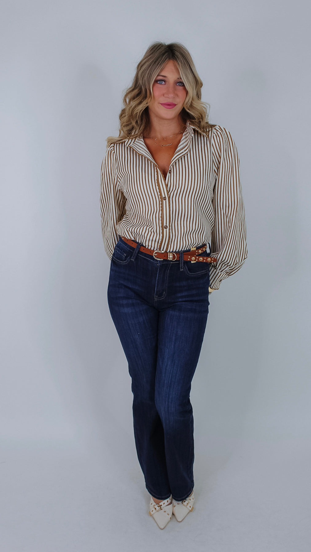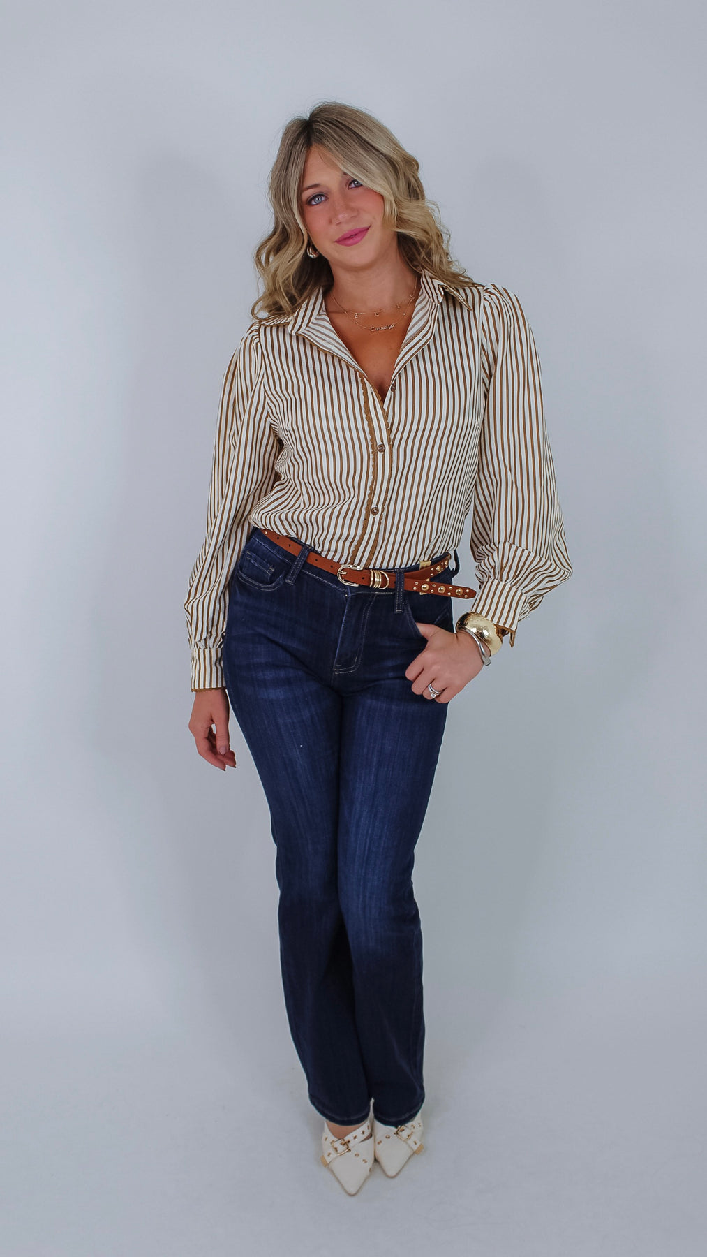 This Katie Striped Top in mocha and ivory is your new go-to for effortless style. The playful stripes and classic button-up design add a fresh twist to your everyday look. Perfect for layering or wearing solo, it’s as comfortable as it is cute!