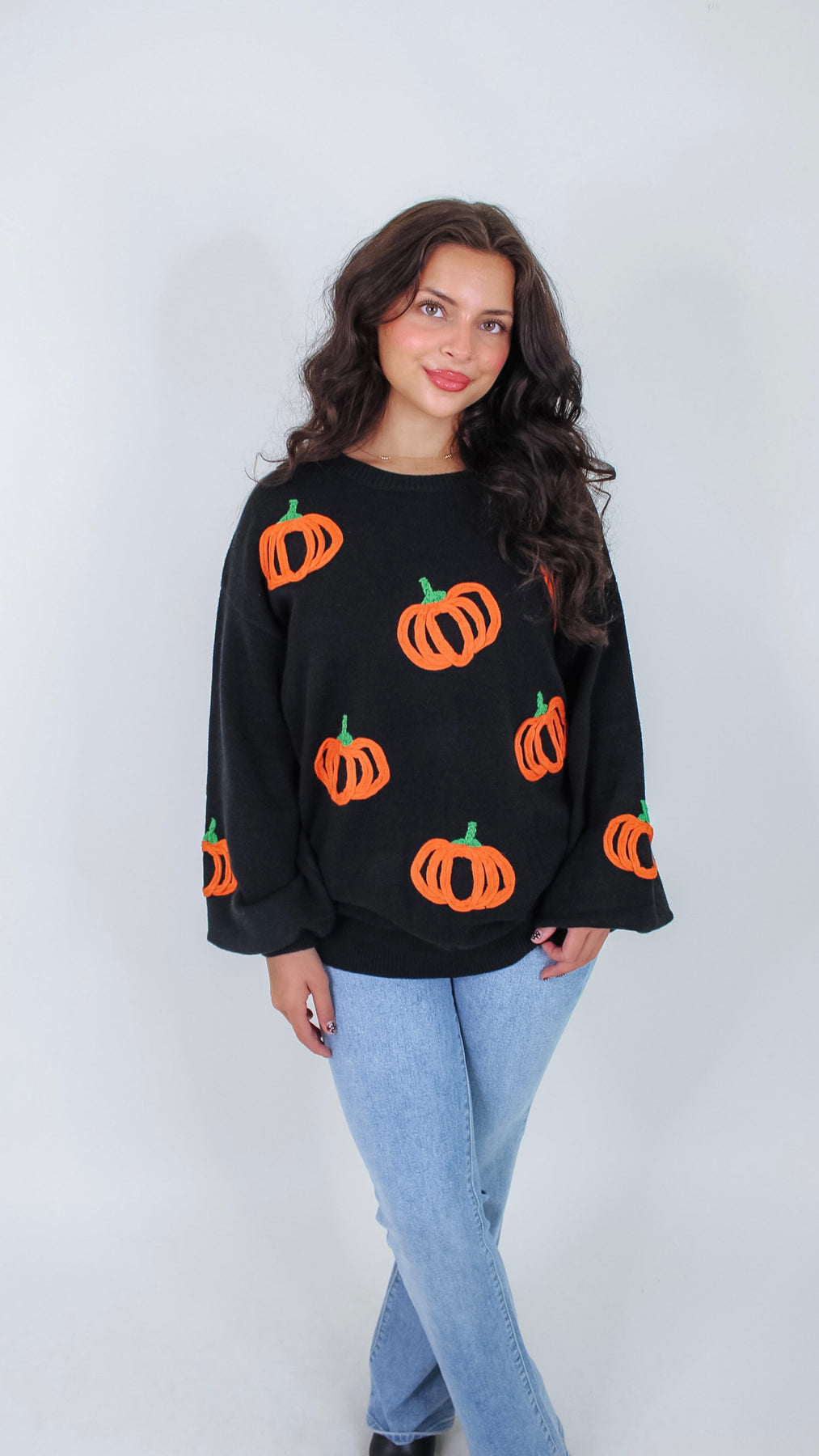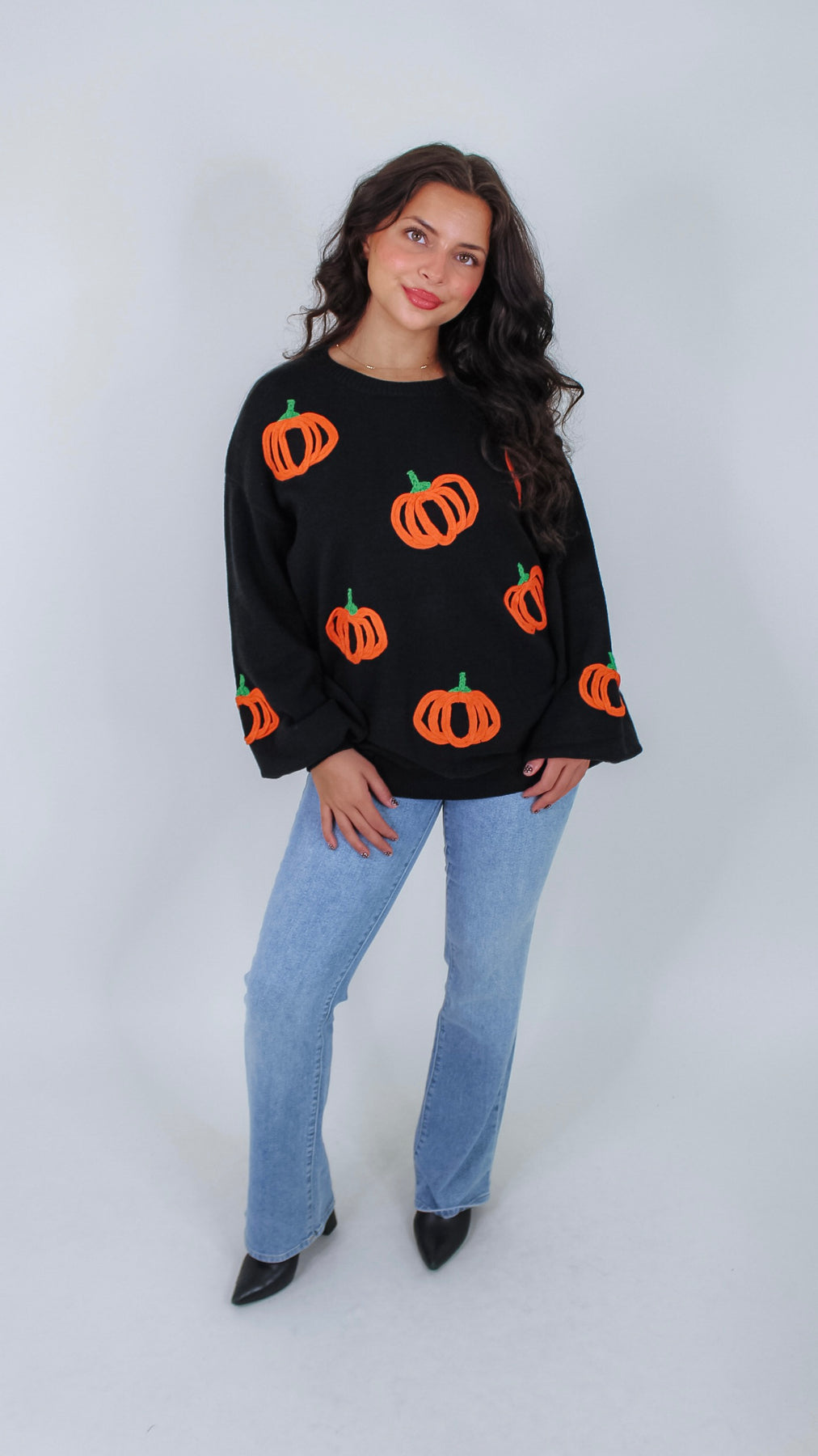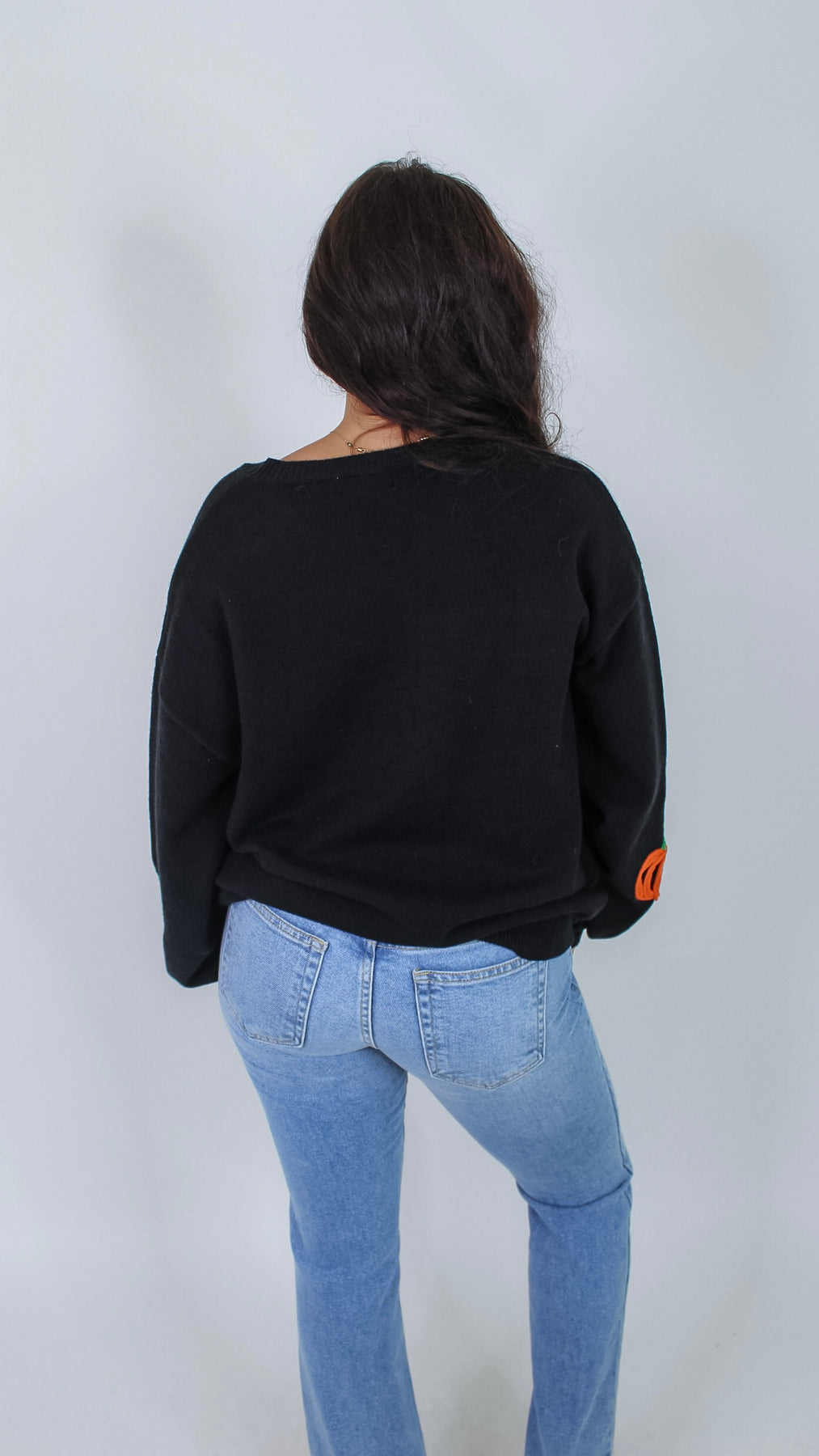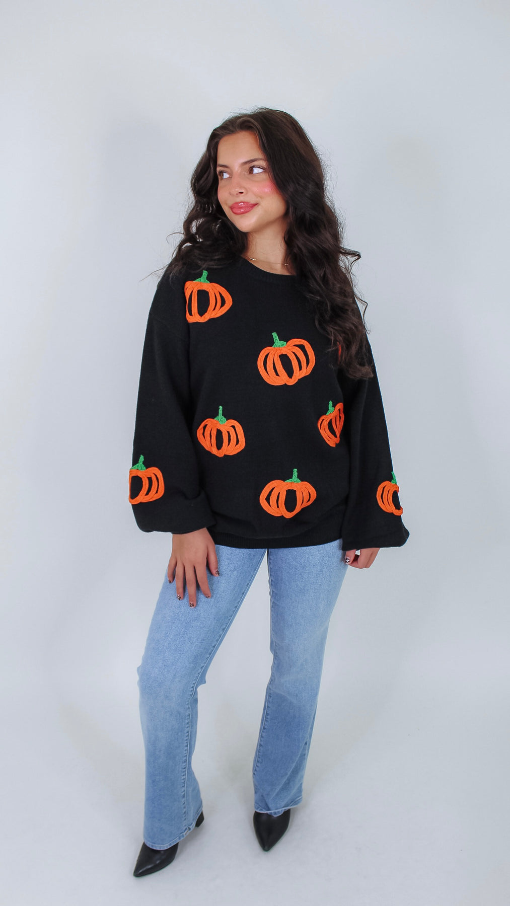 Get cozy for the spooky season with this playful black sweater featuring bright orange pumpkin graphics. Perfect for crisp autumn days, it adds a fun pop of Halloween spirit to your wardrobe while keeping you warm and stylish.