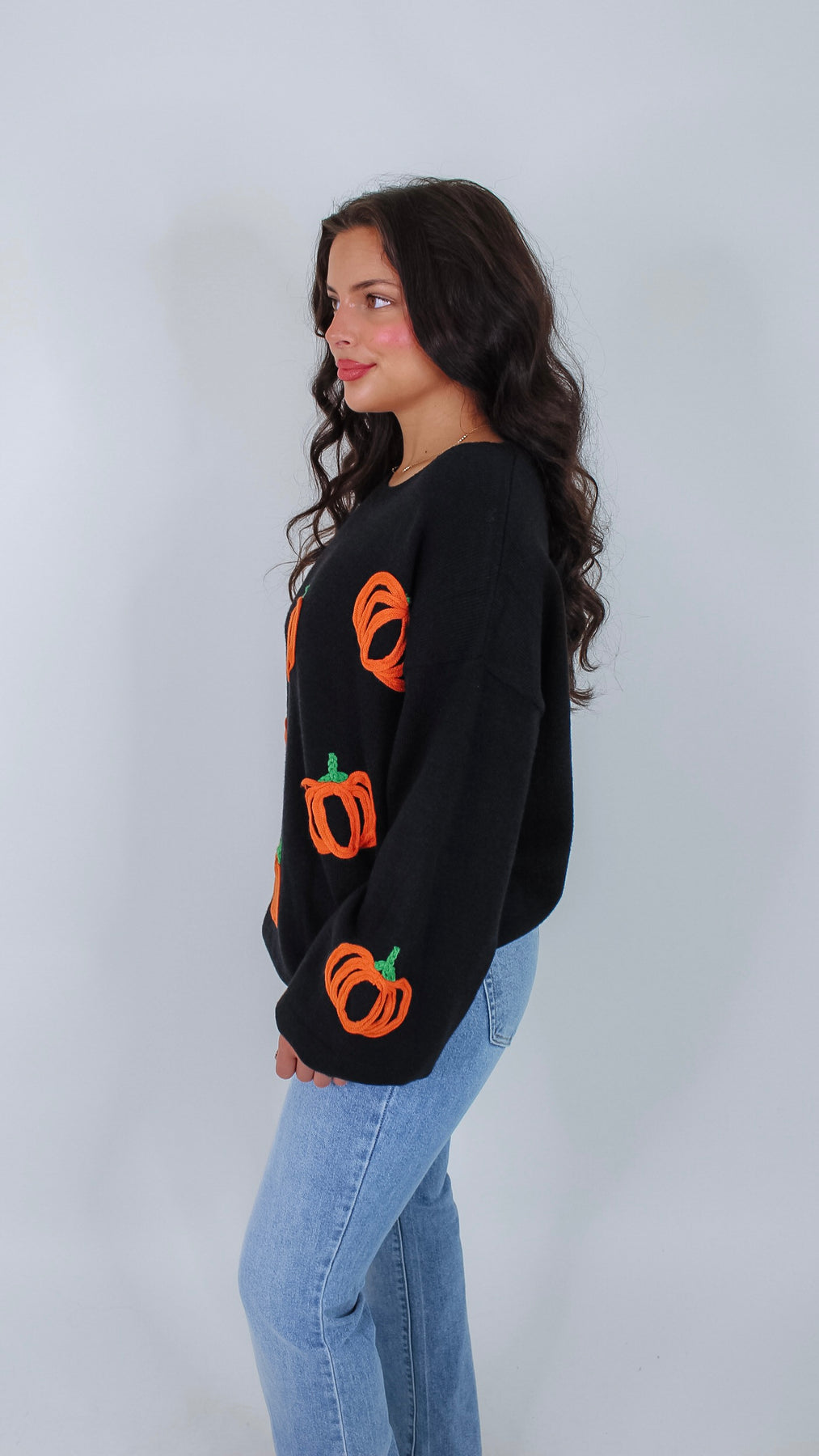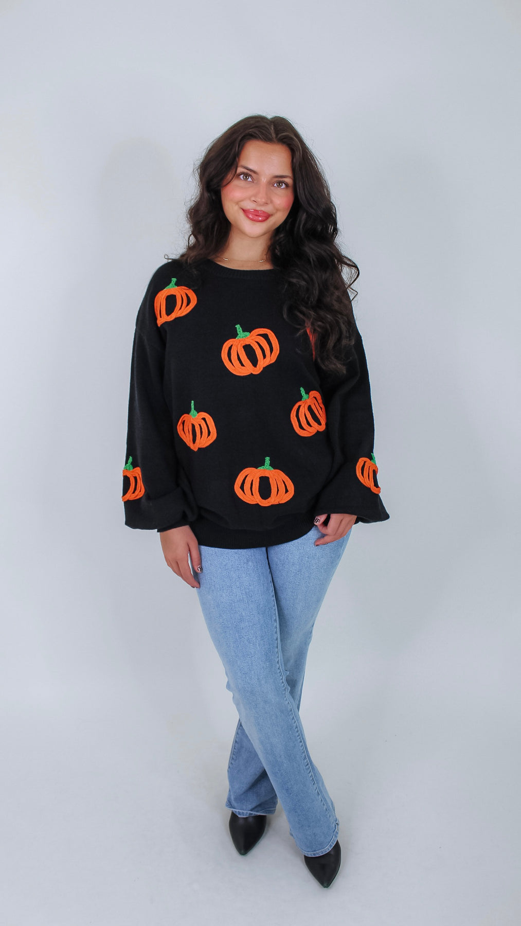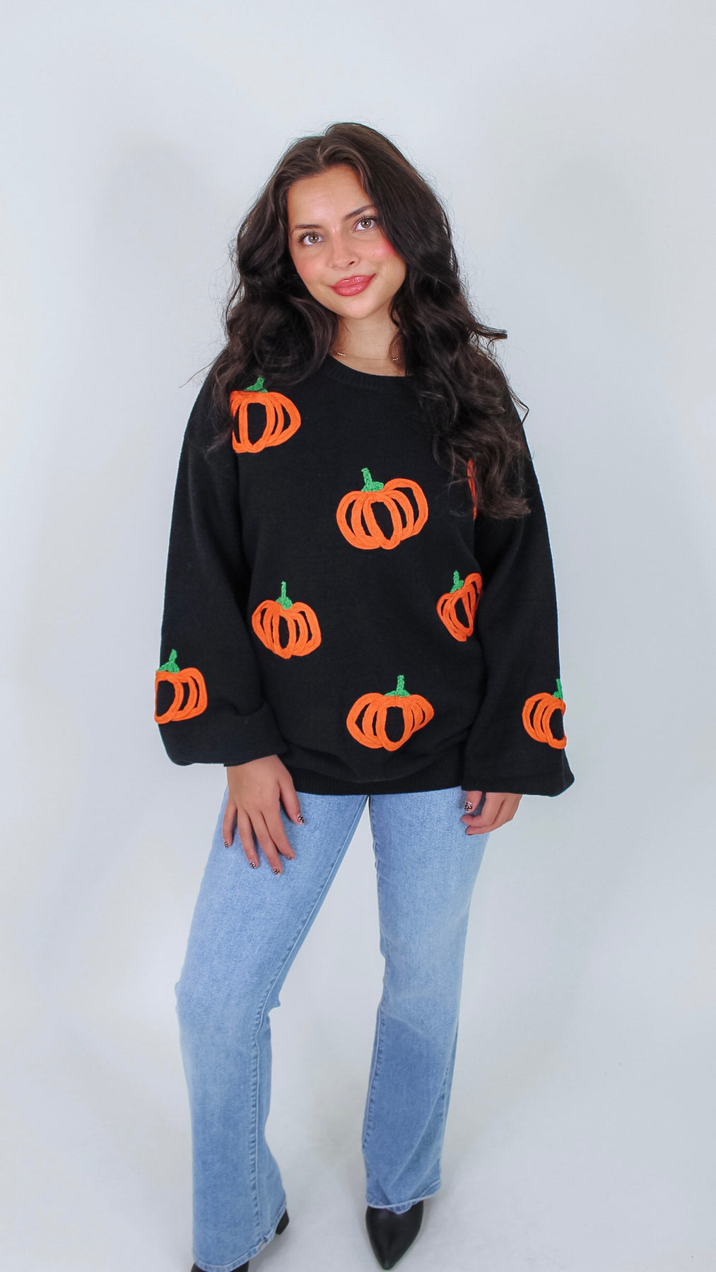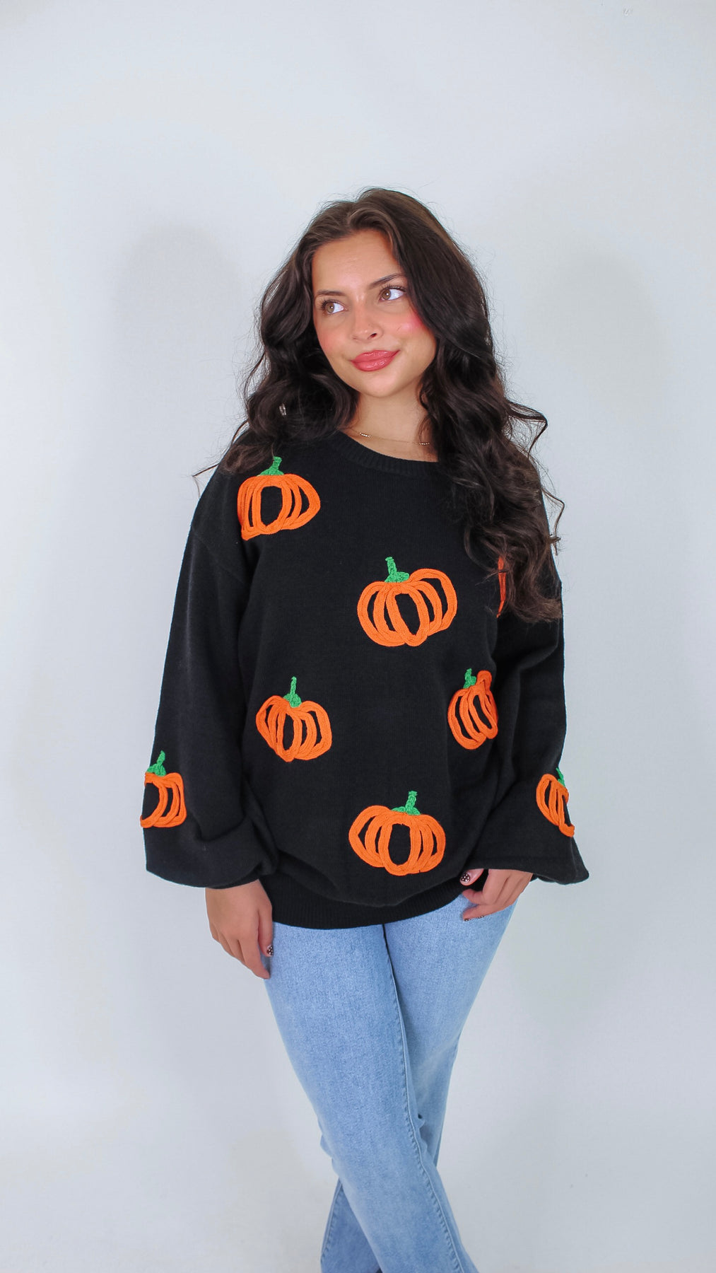 Get cozy for the spooky season with this playful black sweater featuring bright orange pumpkin graphics. Perfect for crisp autumn days, it adds a fun pop of Halloween spirit to your wardrobe while keeping you warm and stylish.