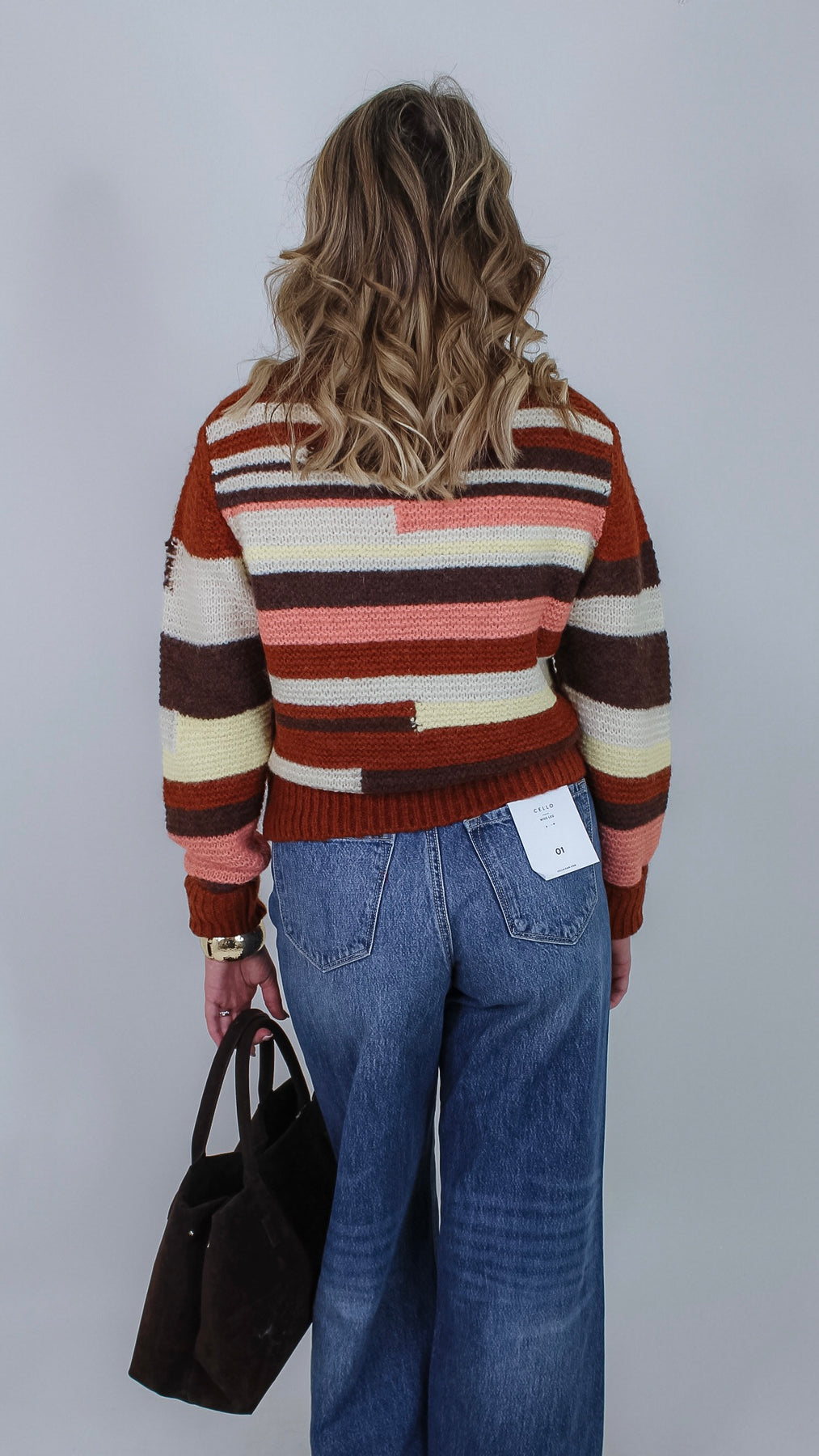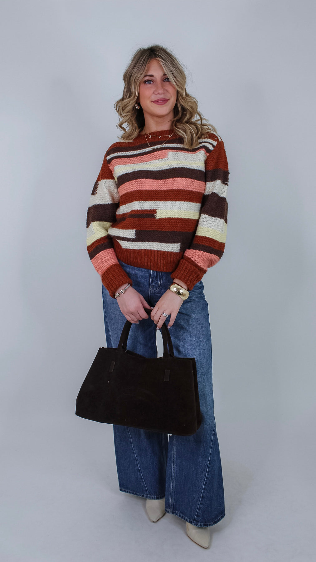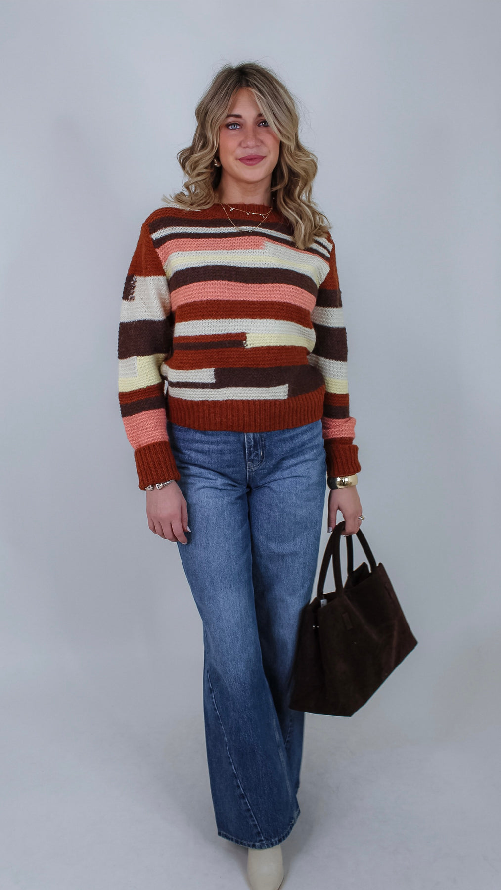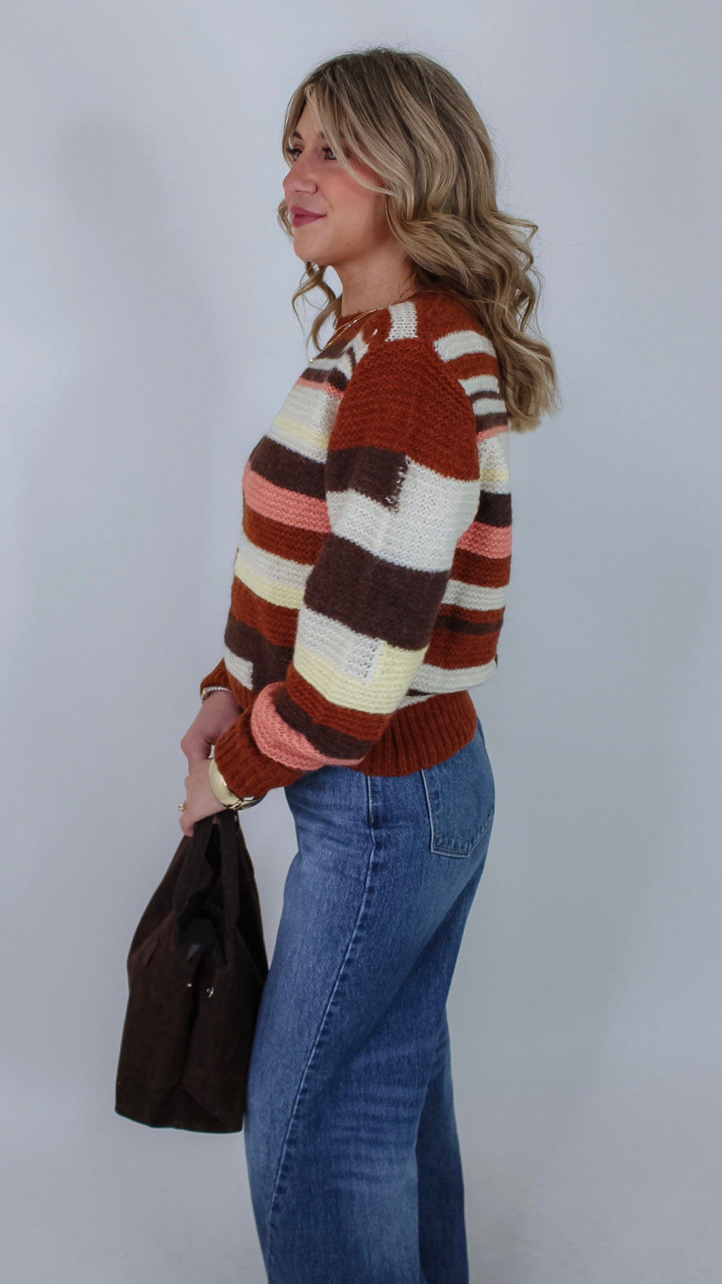 This cozy sweater layers warm brown, rust, and blush pink in a cheerful striped pattern that's anything but boring. Perfect for adding a pop of color to your fall wardrobe while keeping things effortlessly chic. Throw it on with your favorite jeans and you're ready to take on the day!