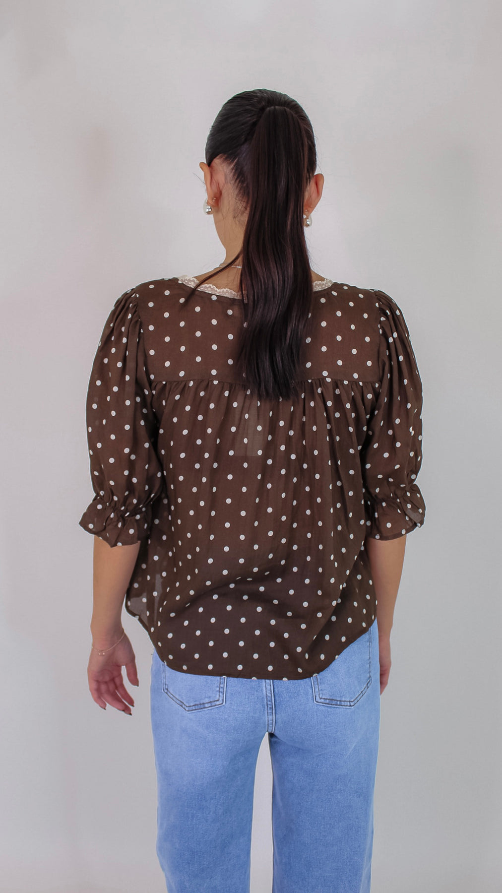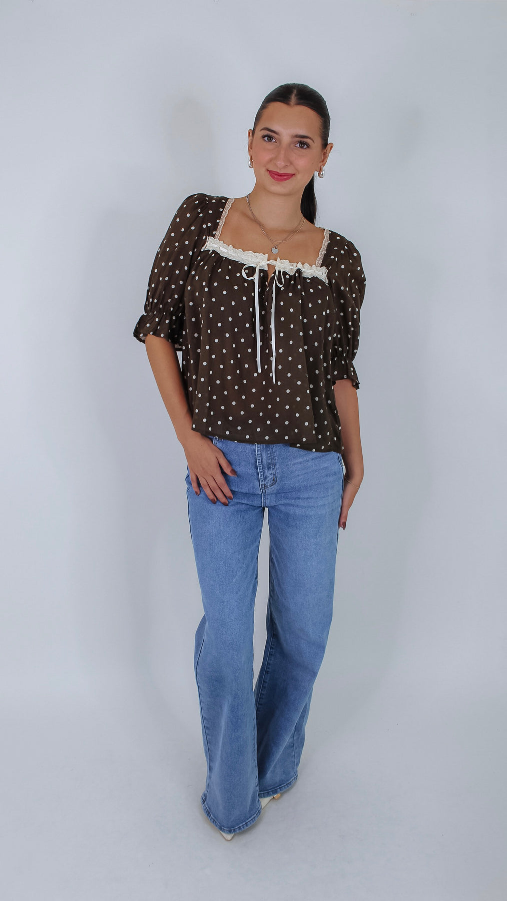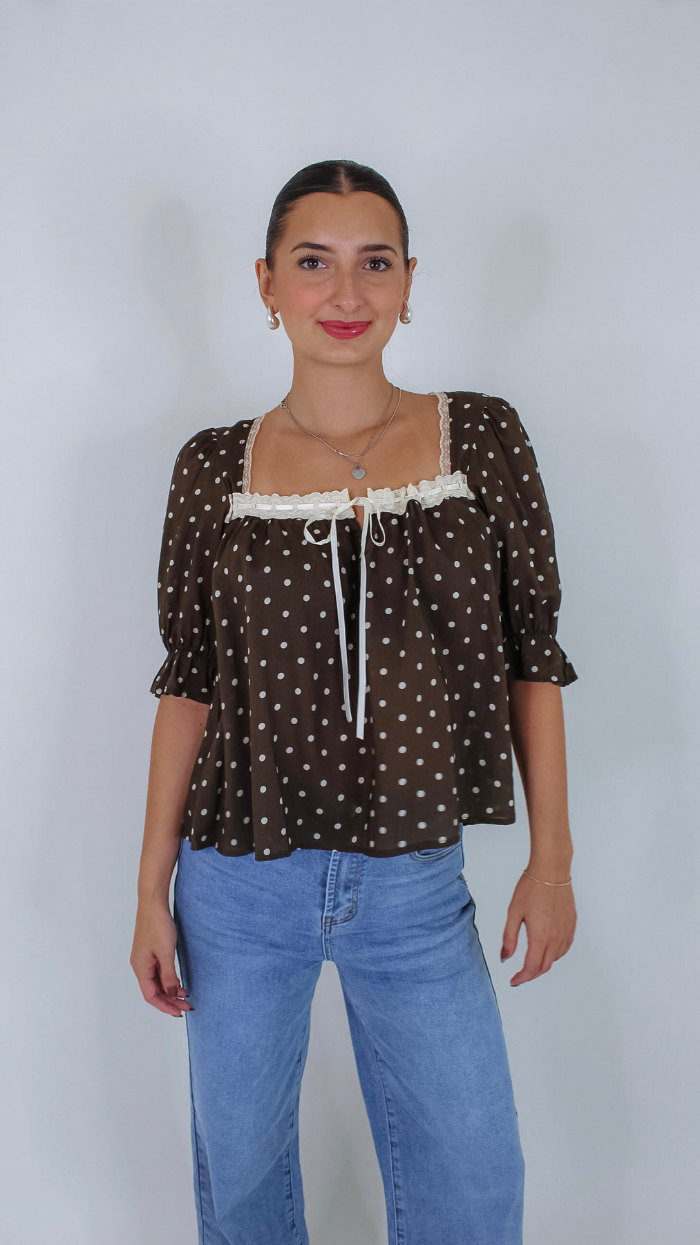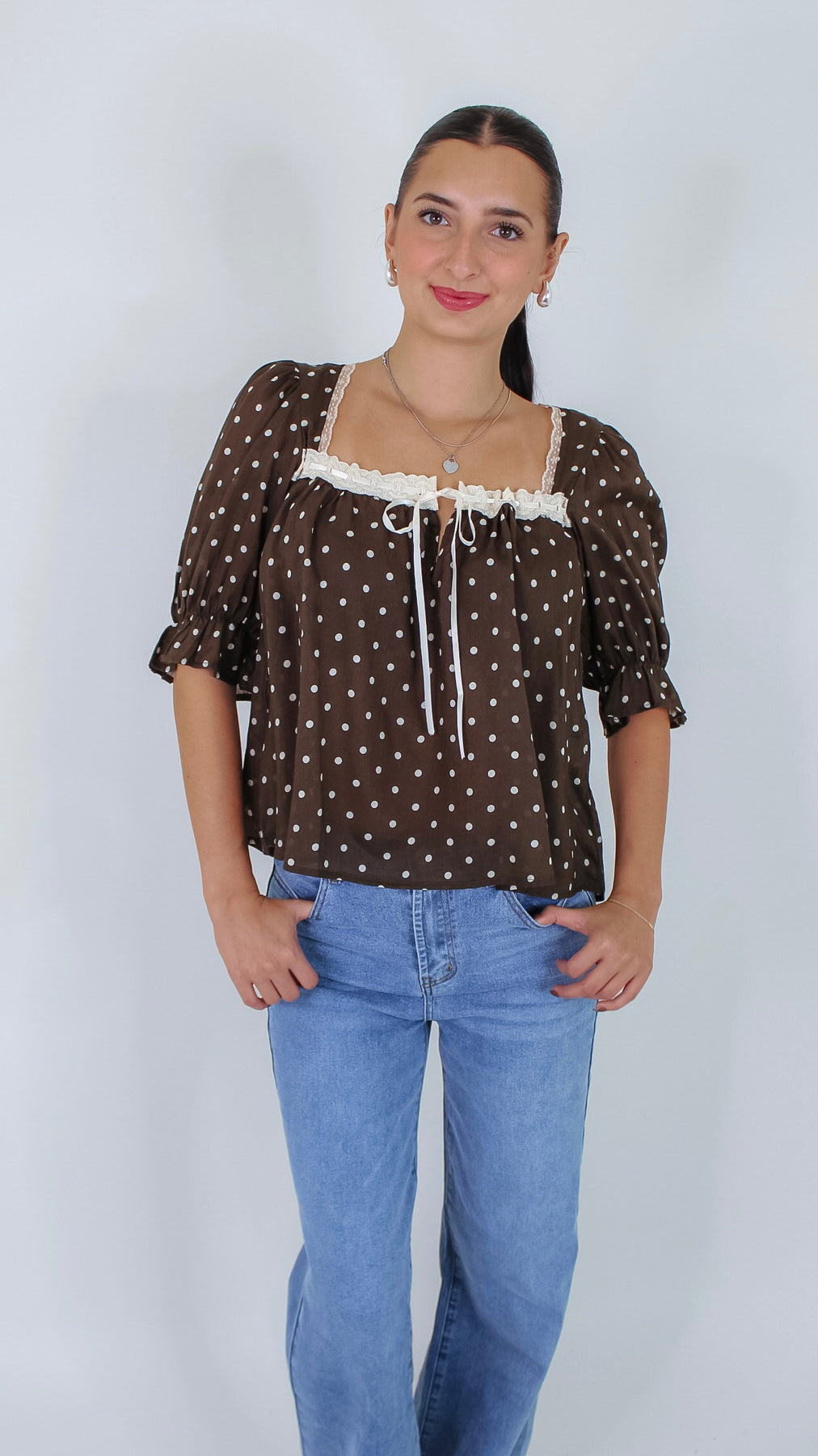 Step out in style with the Robin Brown Polka Dot Top! This playful short sleeve piece features charming brown polka dots that add a fun, retro vibe to your look. Perfect for sunny days or layering under a jacket, its breathable fabric keeps you comfy while turning heads with every wear.