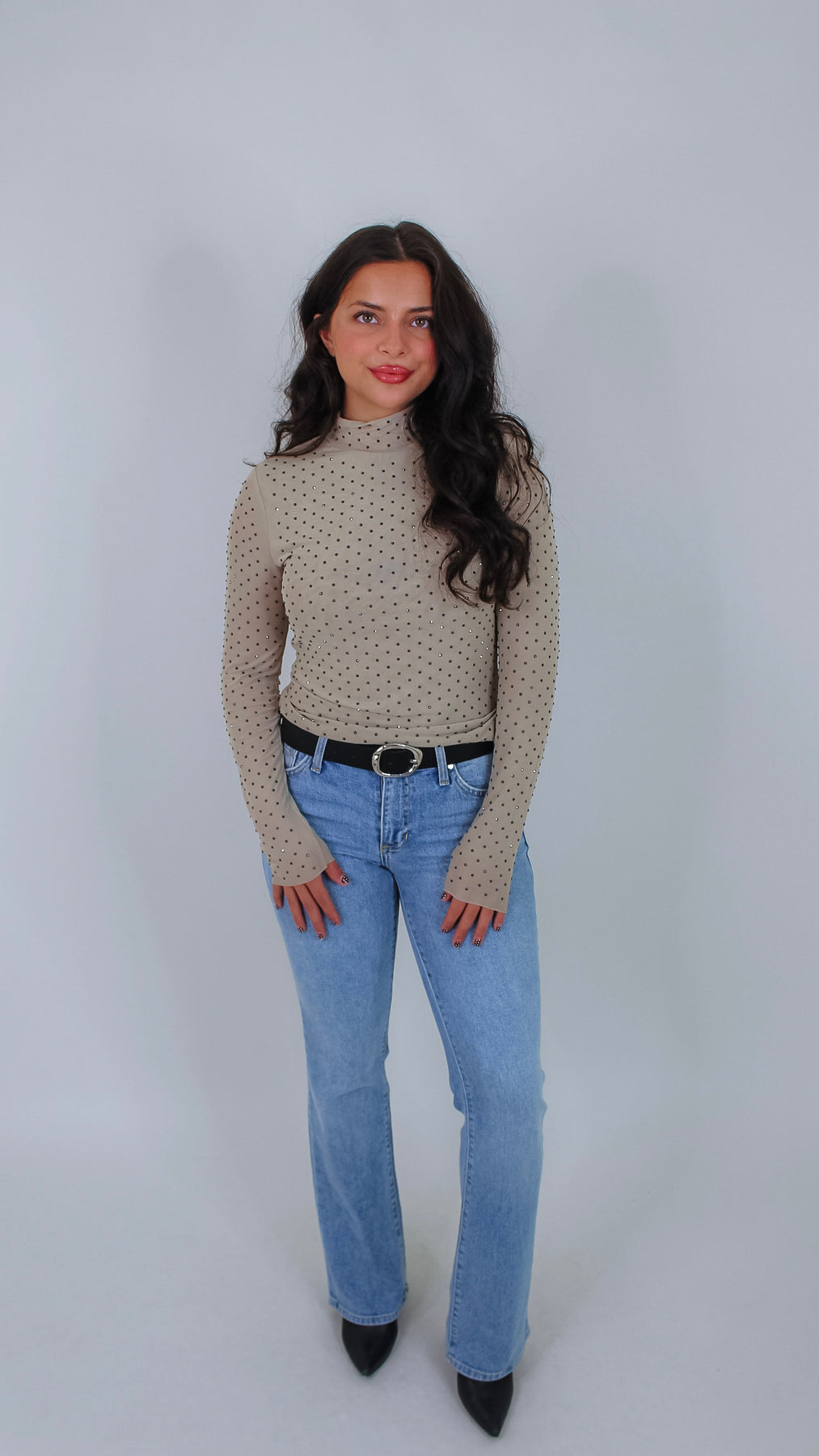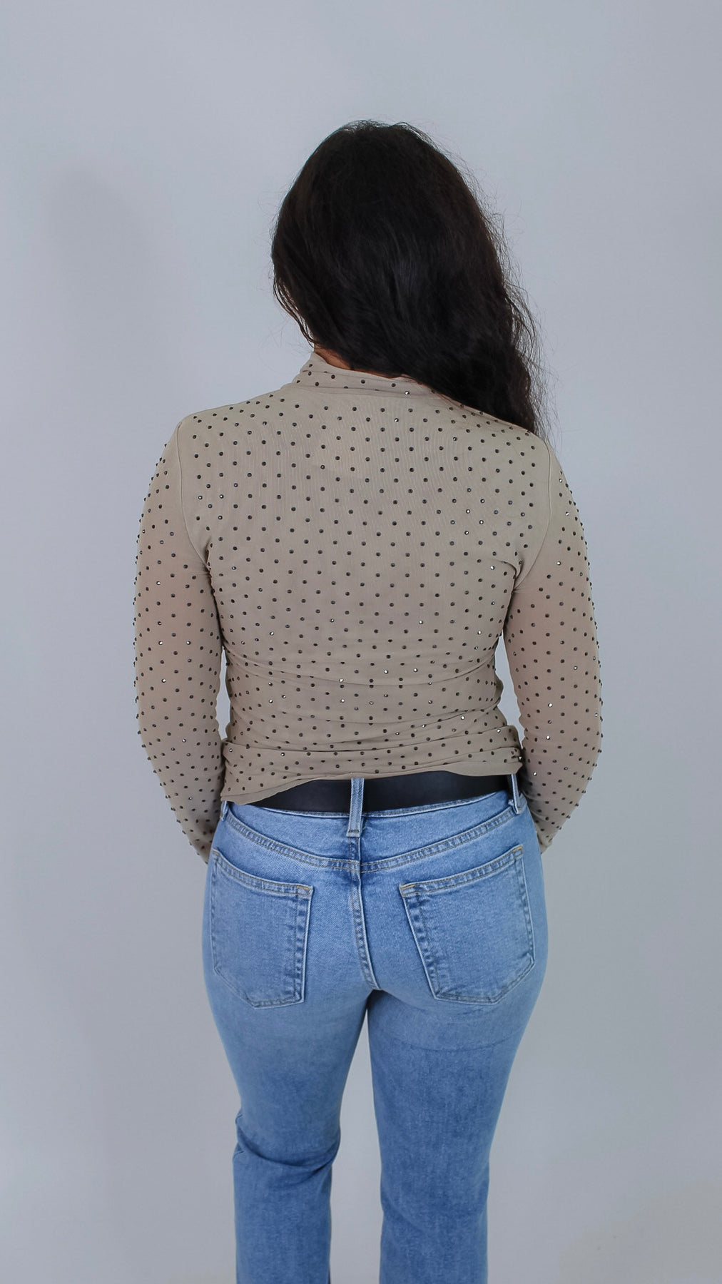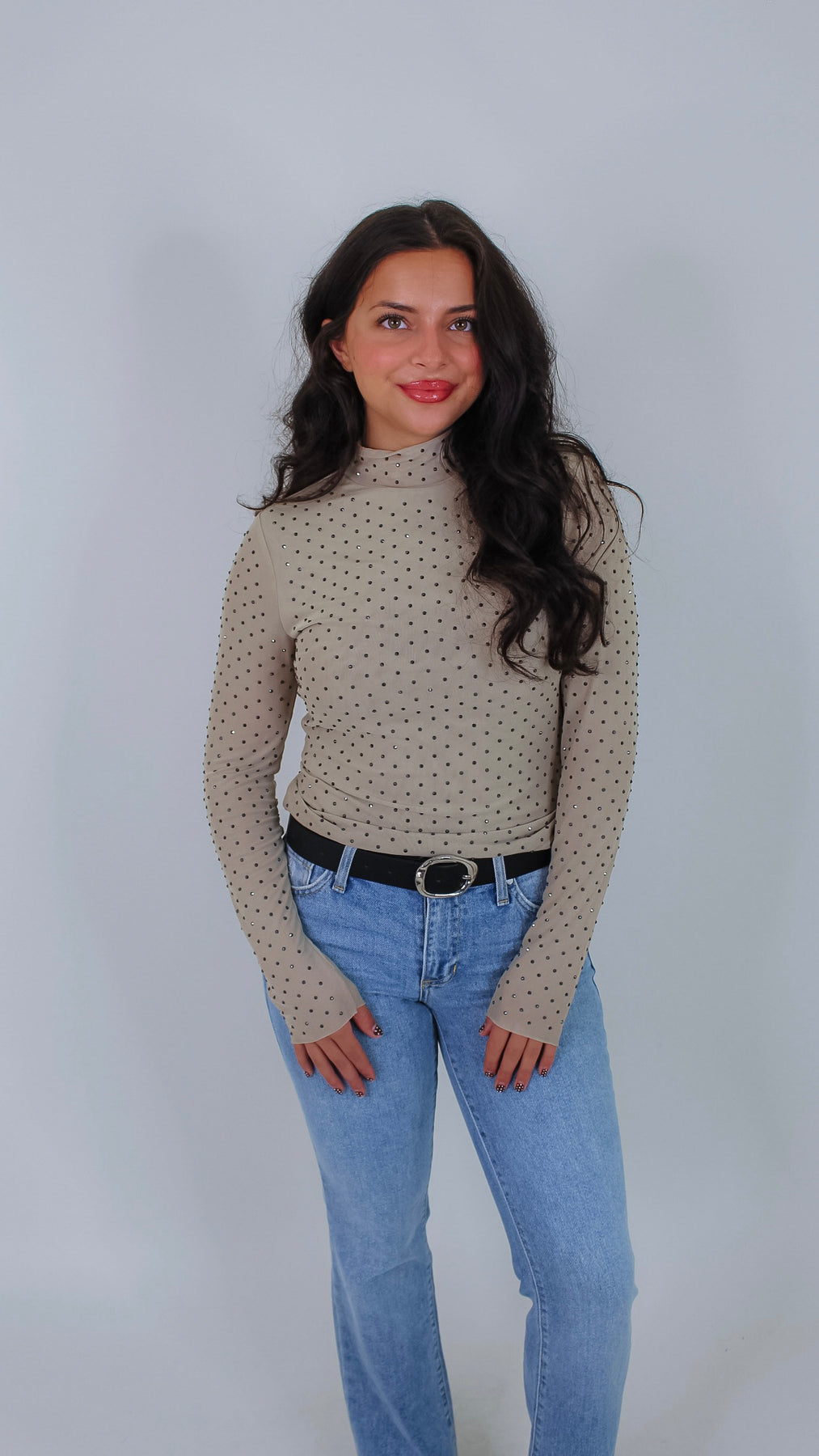 Elevate your style with this playful beige long sleeve mock neck top, sparkling with rhinestones all over. The shimmering mesh fabric adds a touch of glam, perfect for turning heads whether you’re out for a night on the town or adding sparkle to your everyday look.