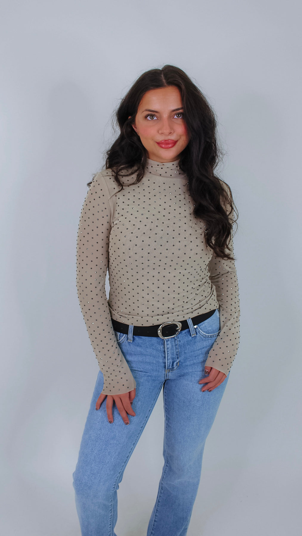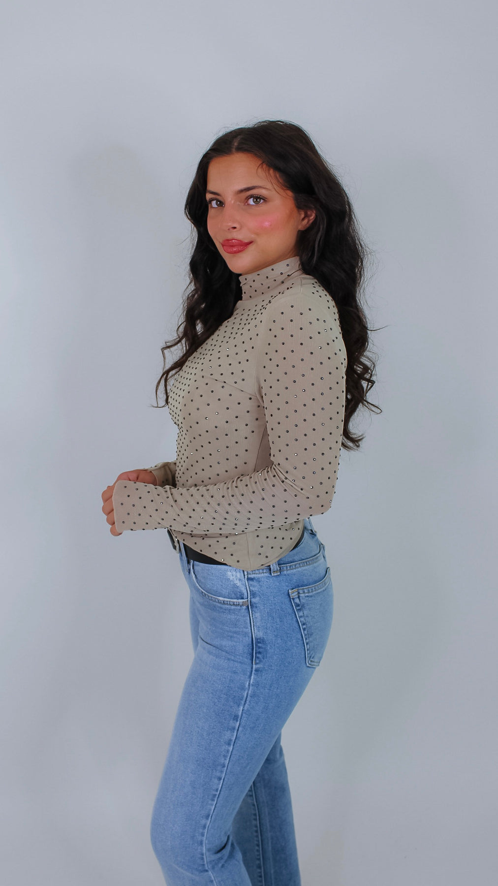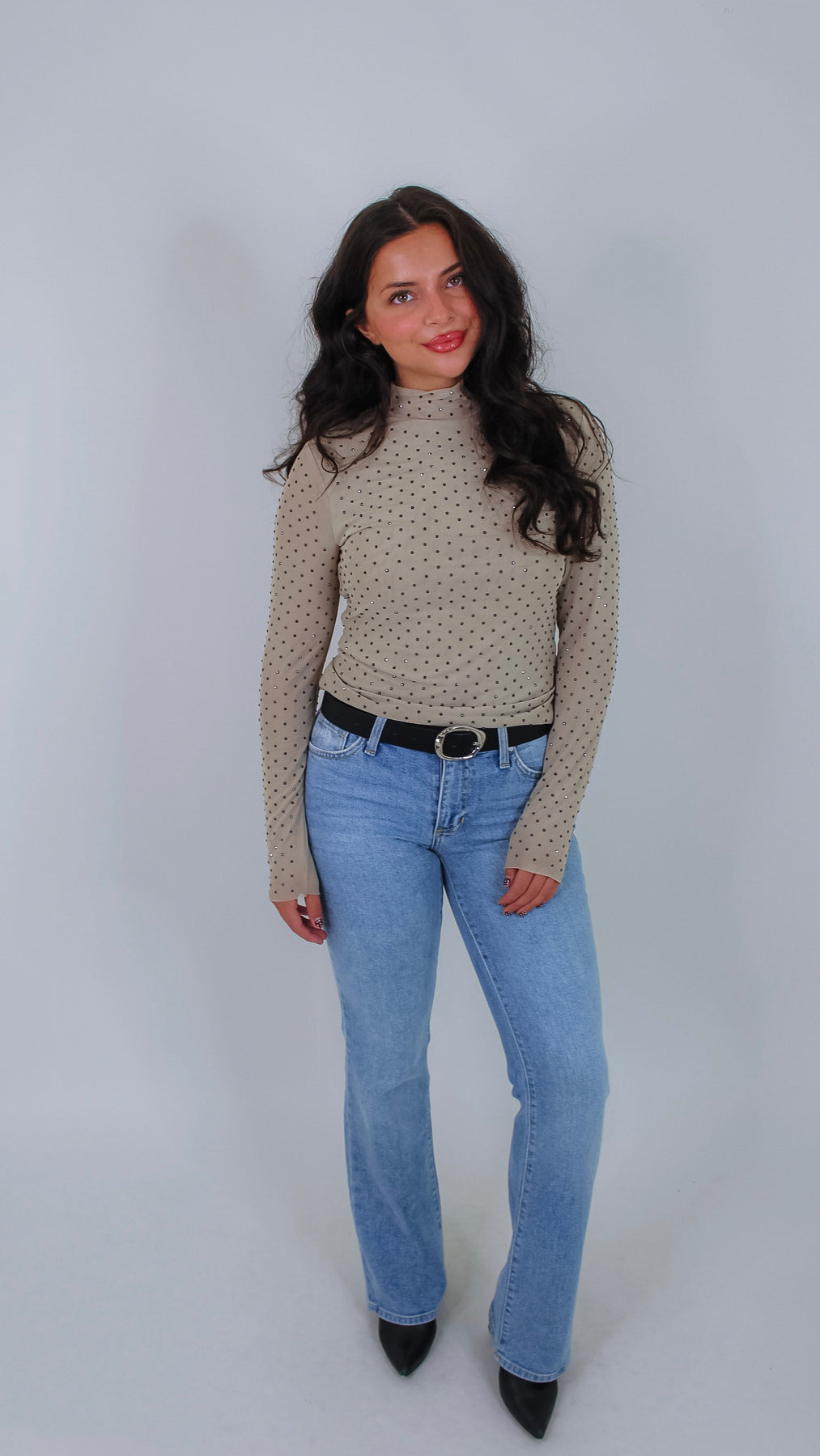 Elevate your style with this playful beige long sleeve mock neck top, sparkling with rhinestones all over. The shimmering mesh fabric adds a touch of glam, perfect for turning heads whether you’re out for a night on the town or adding sparkle to your everyday look.