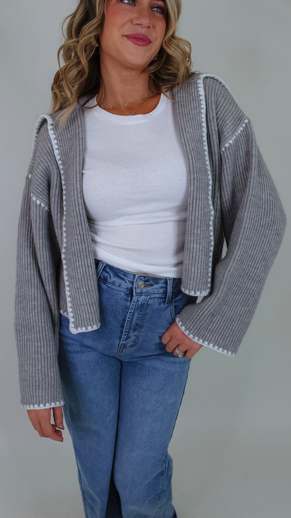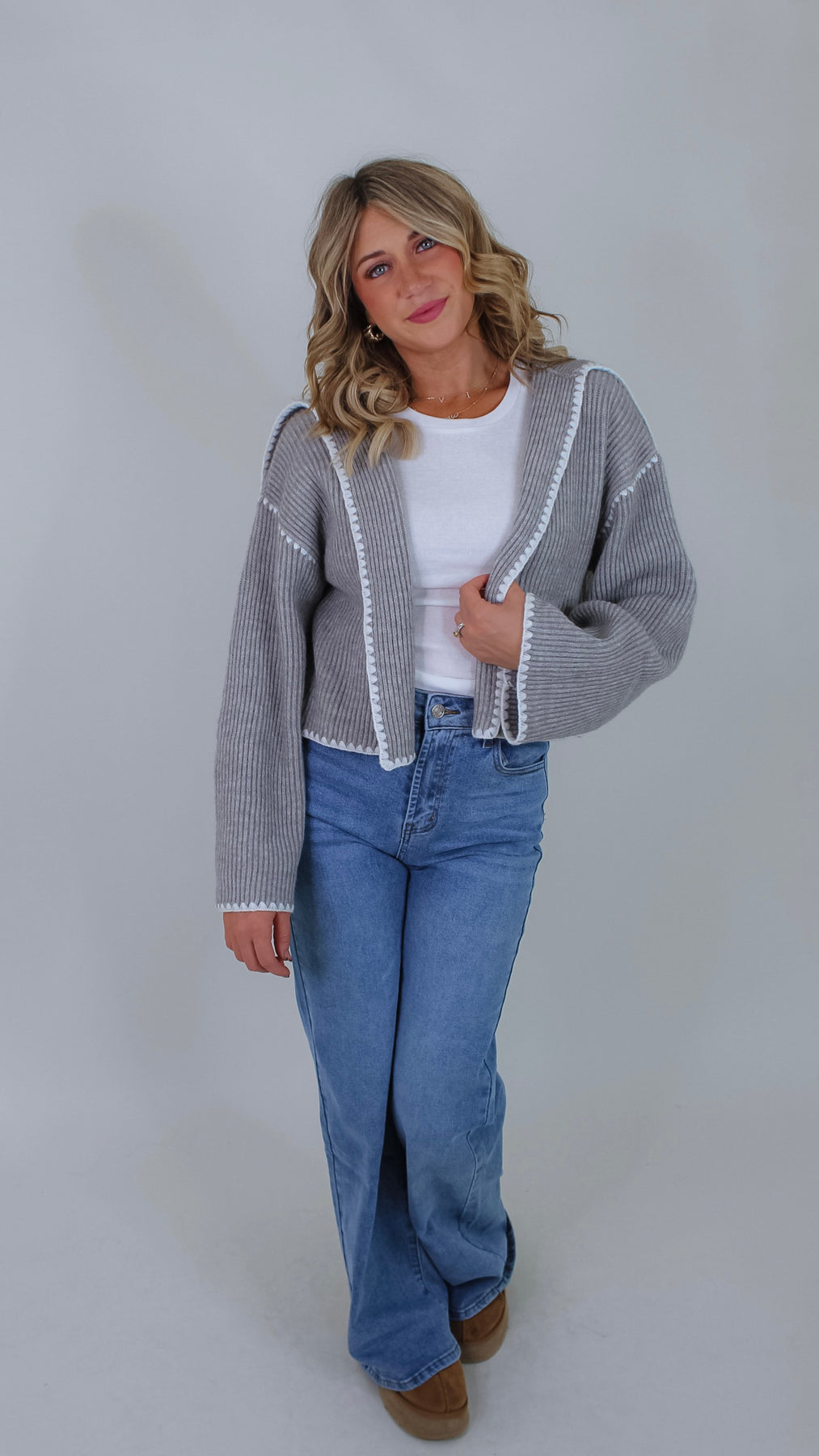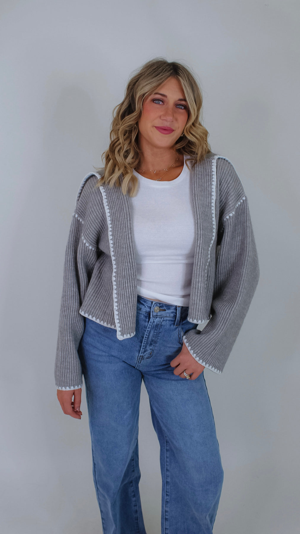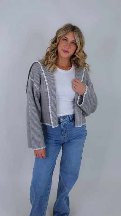 Cozy up in the Darla Grey Cardigan, featuring a soft grey fabric with charming white stitch details that add a fun, whimsical touch. Its open front design makes layering effortless, perfect for popping on over your favorite tee or dress to brighten up any outfit.