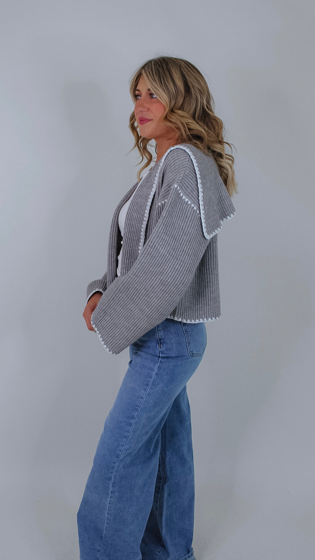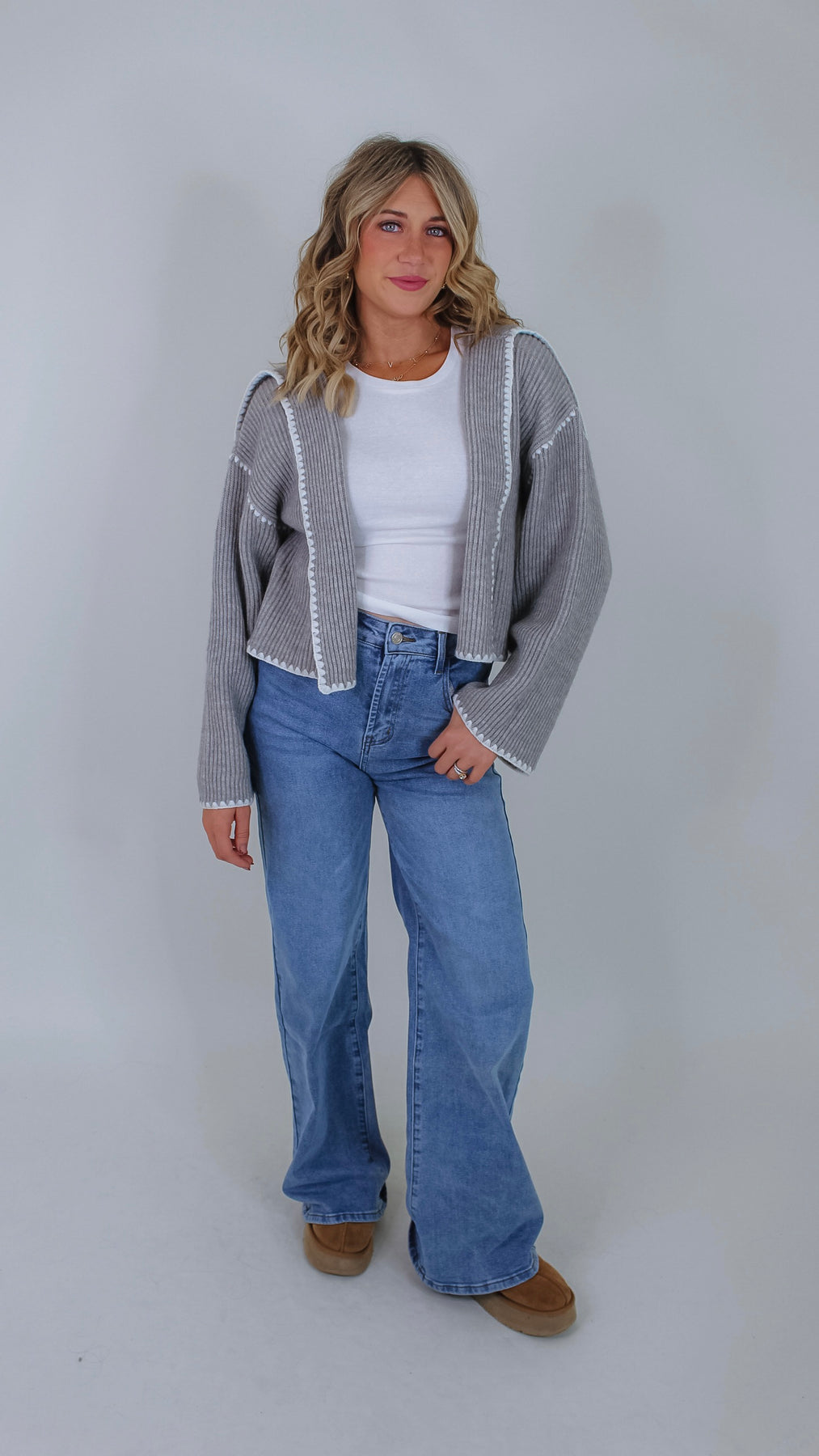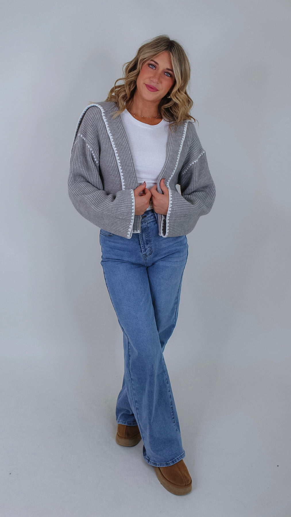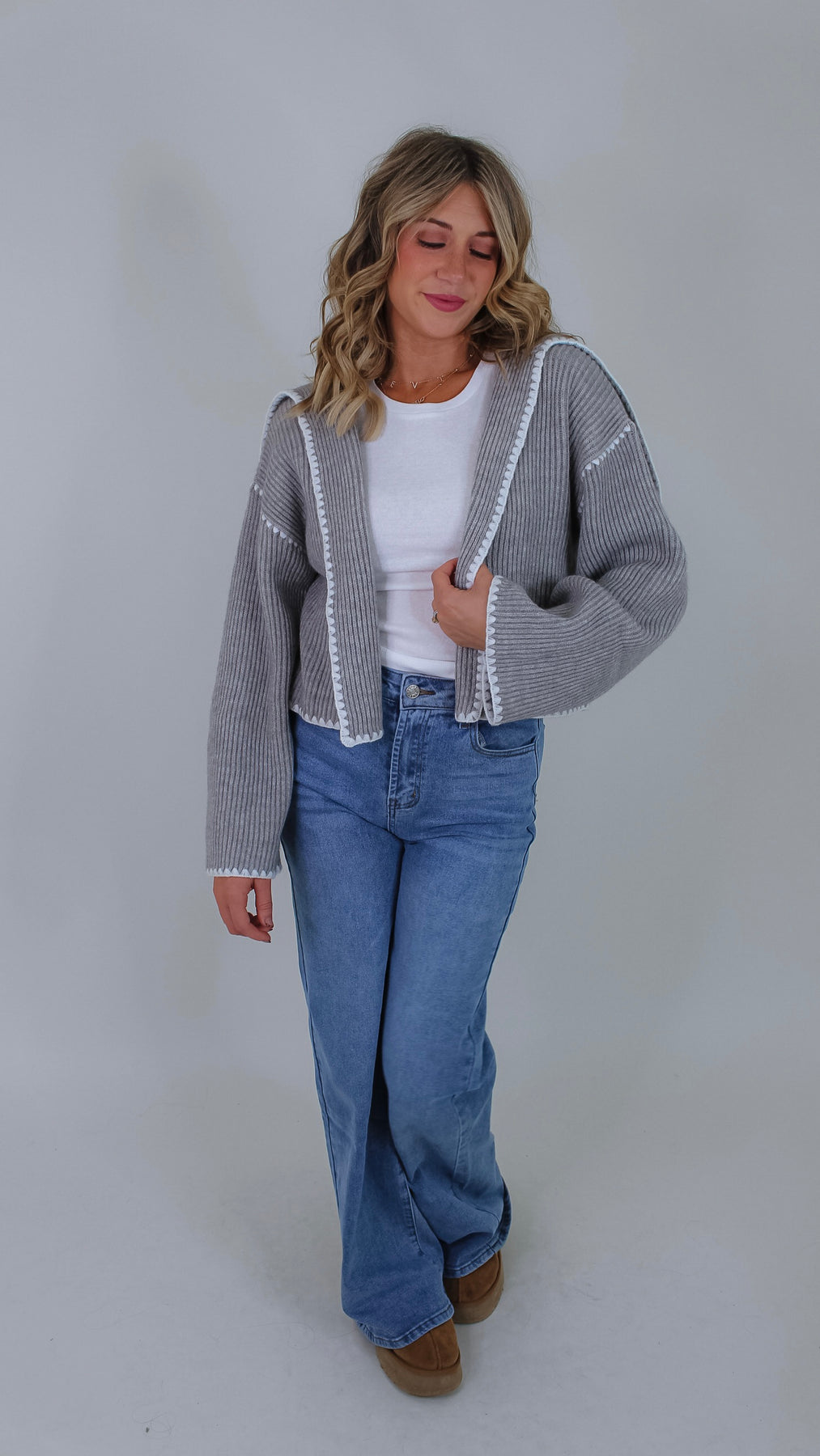 Cozy up in the Darla Grey Cardigan, featuring a soft grey fabric with charming white stitch details that add a fun, whimsical touch. Its open front design makes layering effortless, perfect for popping on over your favorite tee or dress to brighten up any outfit.