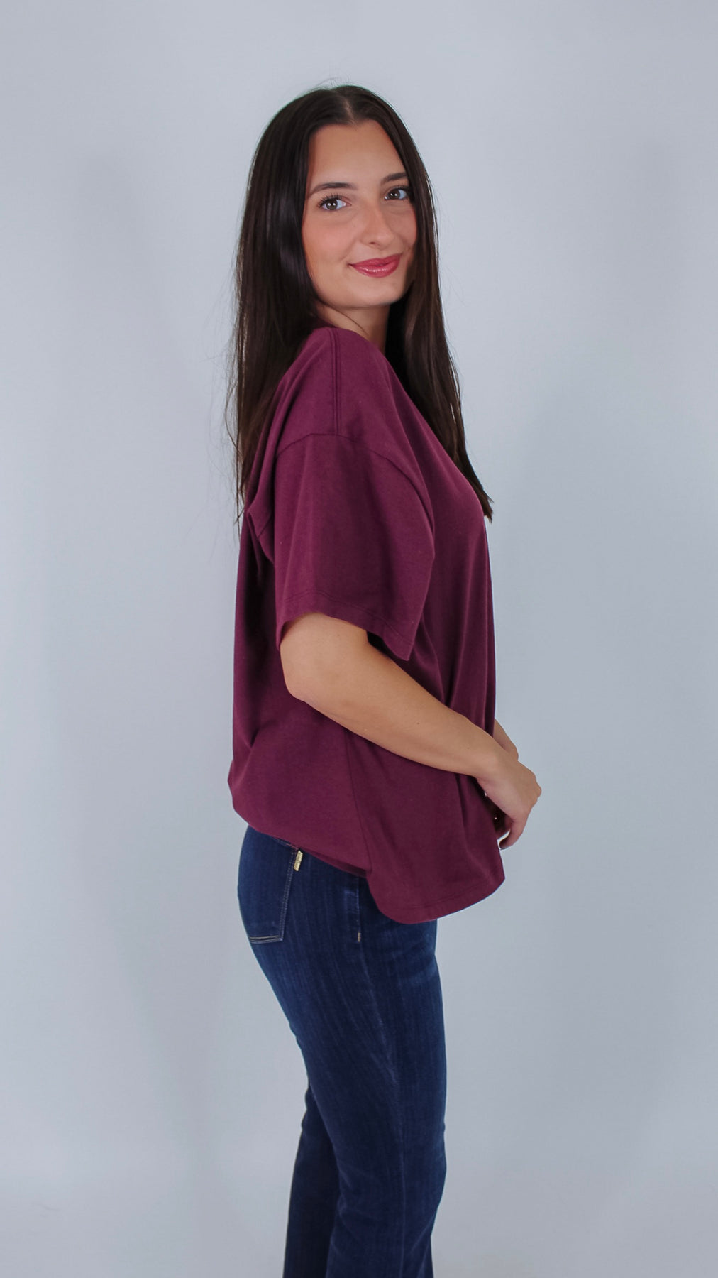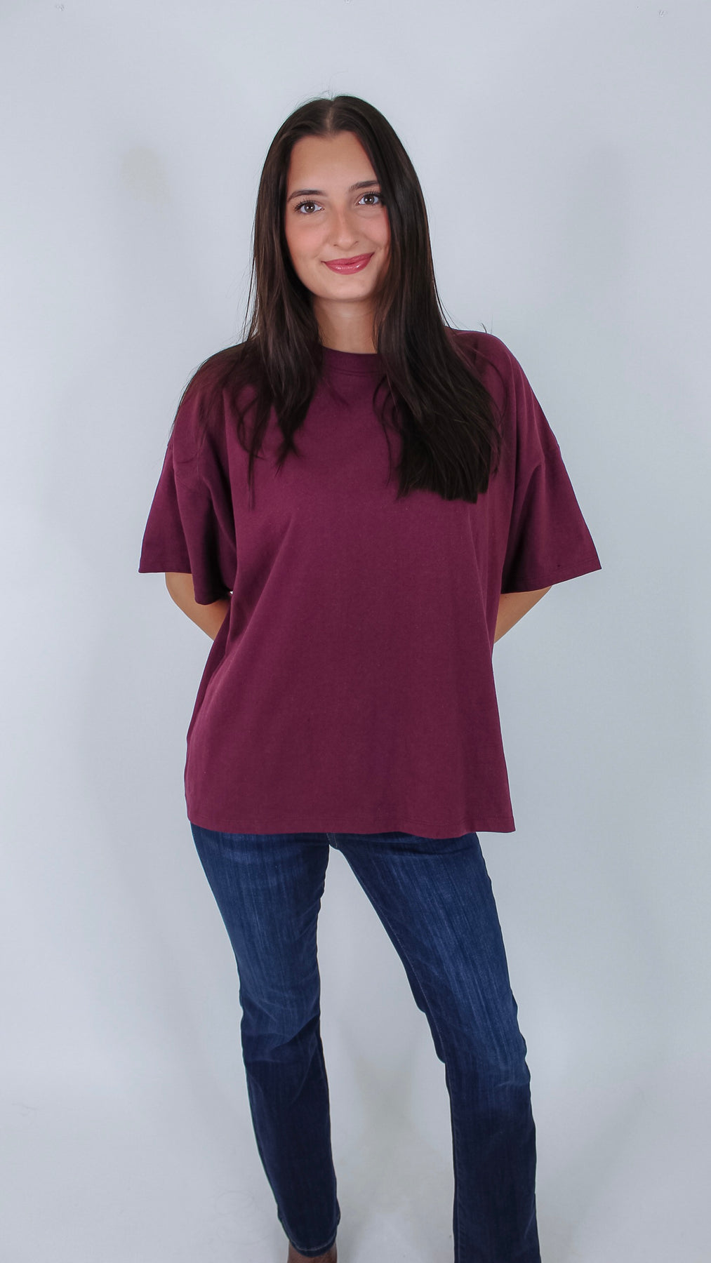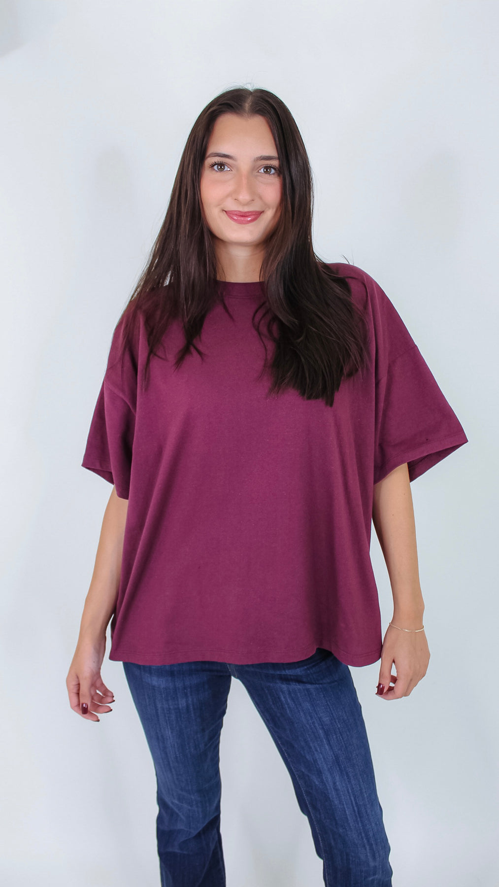 Add a pop of rich, dark cherry color to your everyday wardrobe with the Day By Day Top. This playful t-shirt combines comfort and style, making it perfect for brightening up any casual look. Whether you're out and about or lounging at home, its vibrant hue and soft fabric keep you feeling fresh all day long.